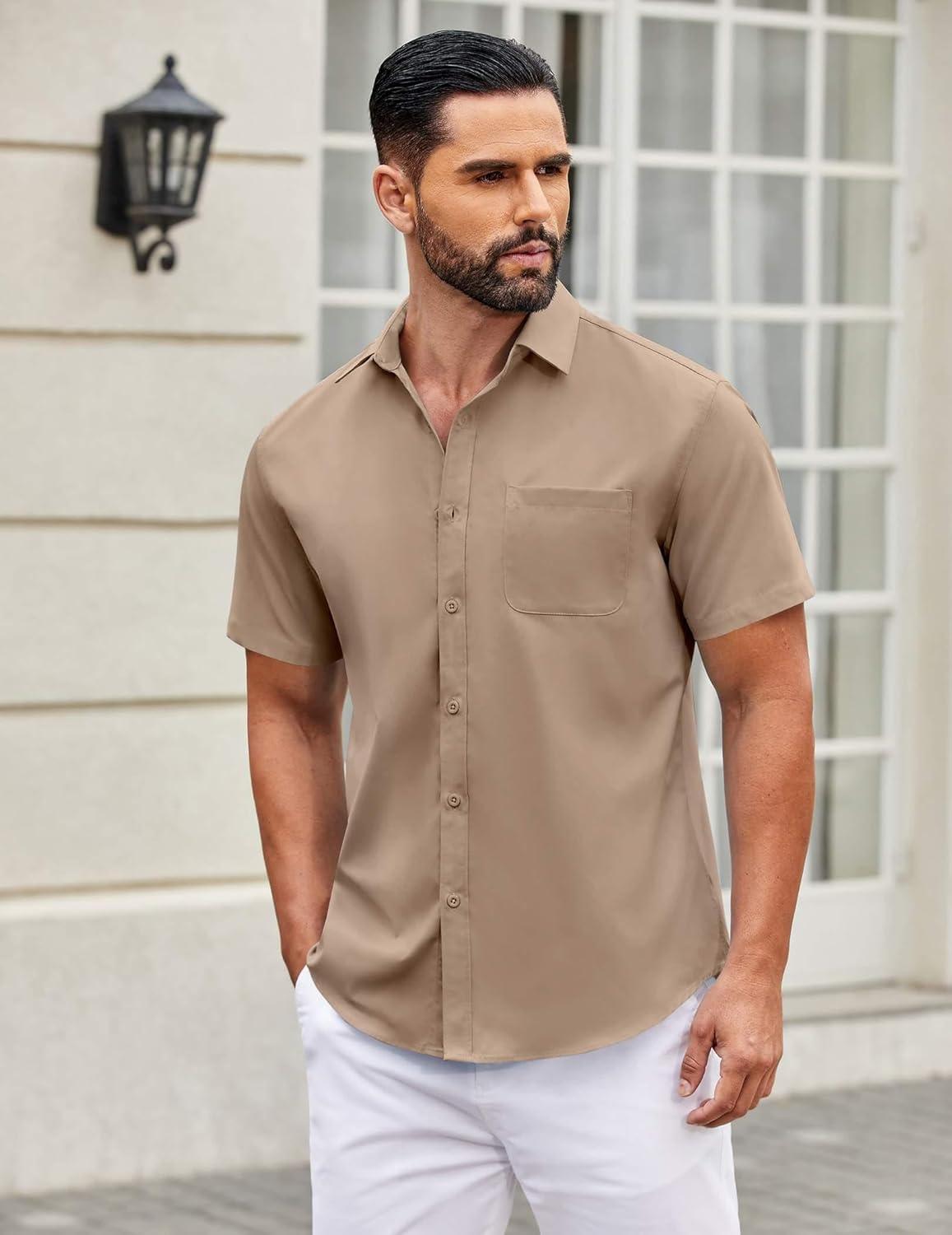 COOFANDY Mens Short Sleeve Casual Button Down Shirts Summer Untucked Dress Shirts with Pocket(Sesame)