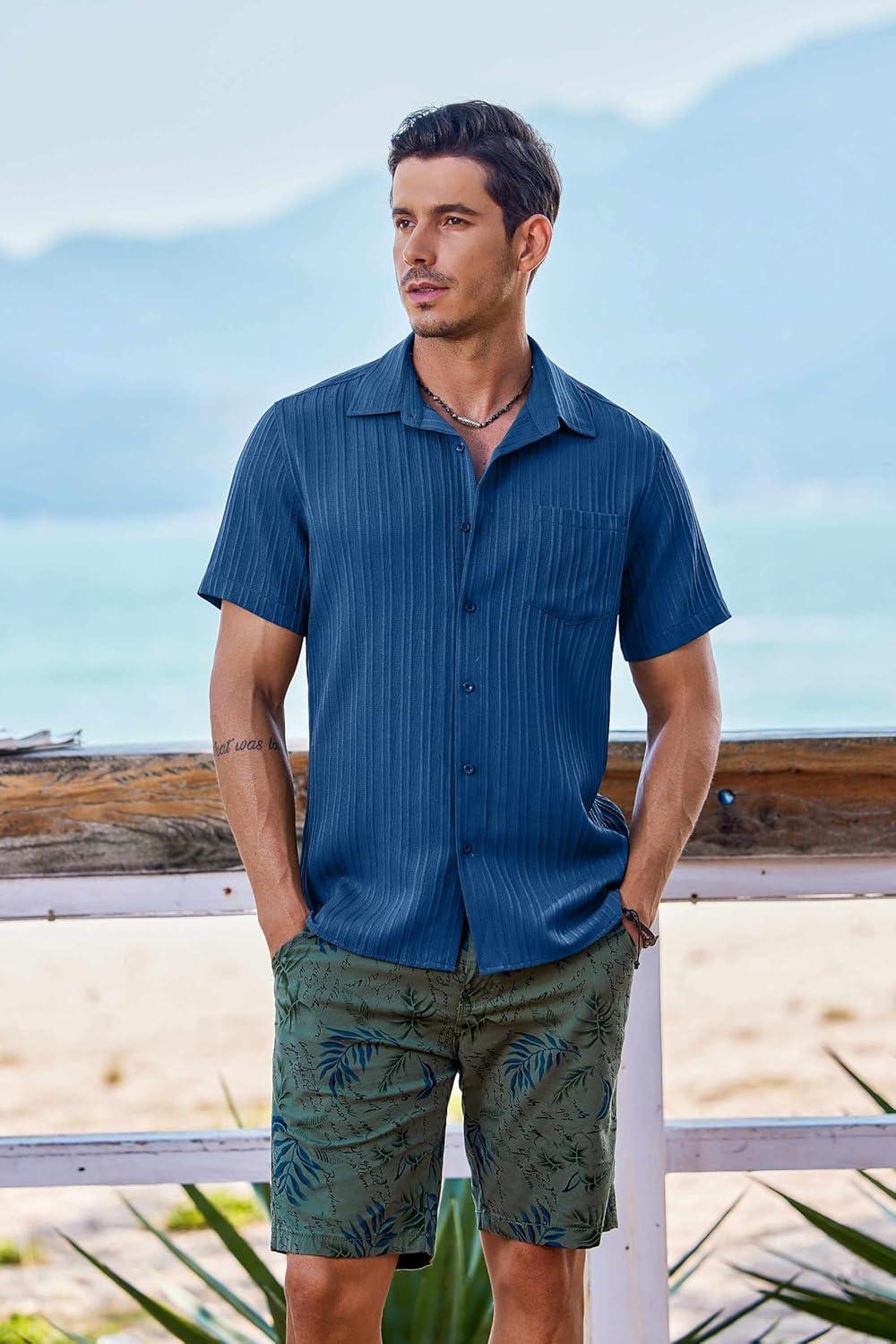 COOFANDY Men's Short Sleeve Casual Button Down Shirts Textured Summer Beach Shirt with Pocket(Denim Blue)