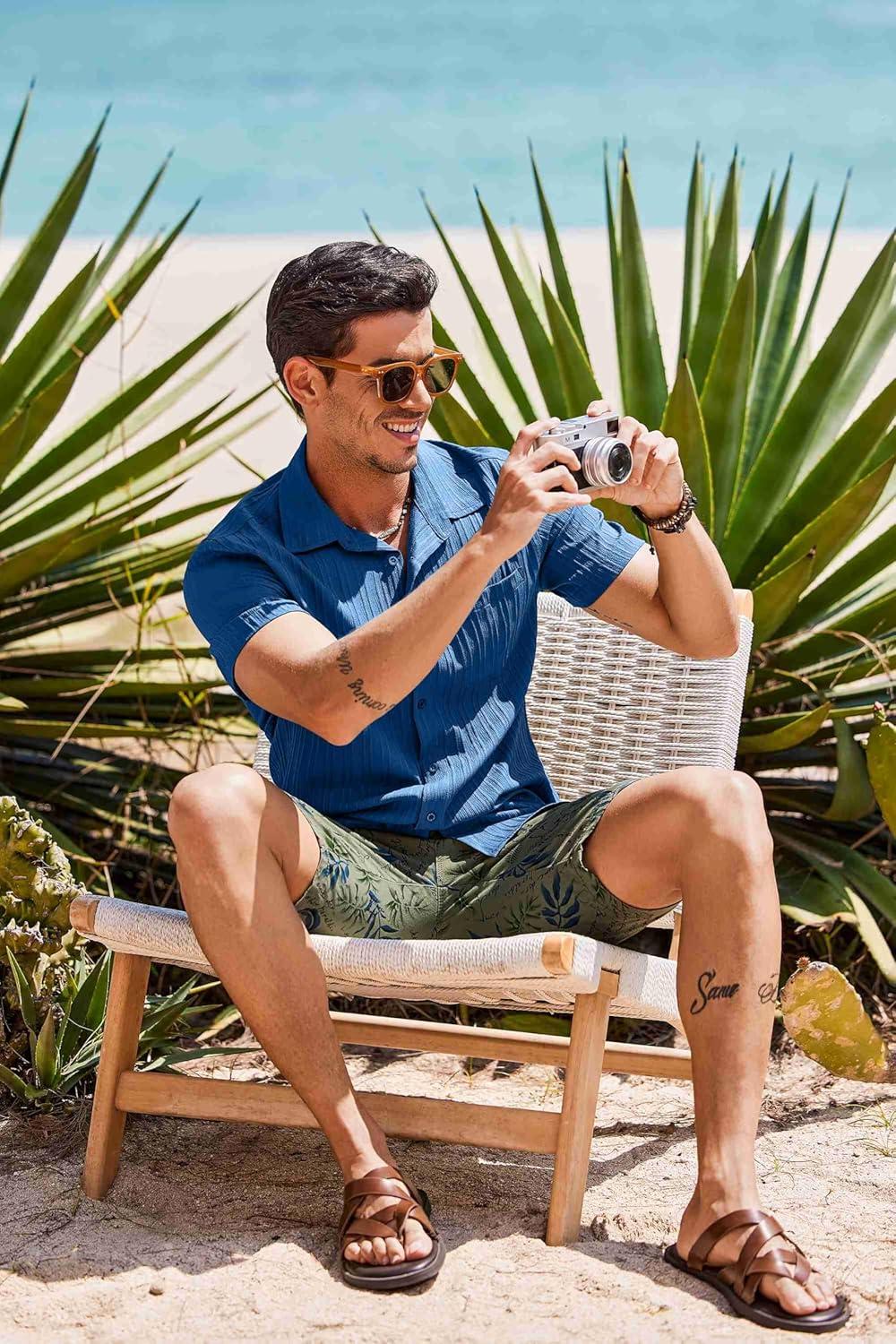 COOFANDY Men’s Short Sleeve Casual Button Down Shirts Textured Summer Beach Shirt with Pocket(Denim Blue)