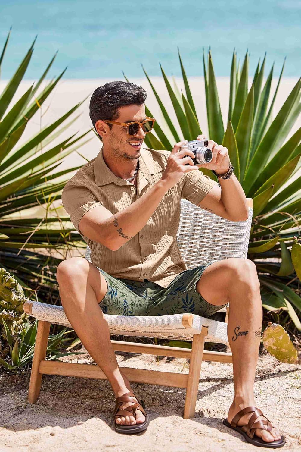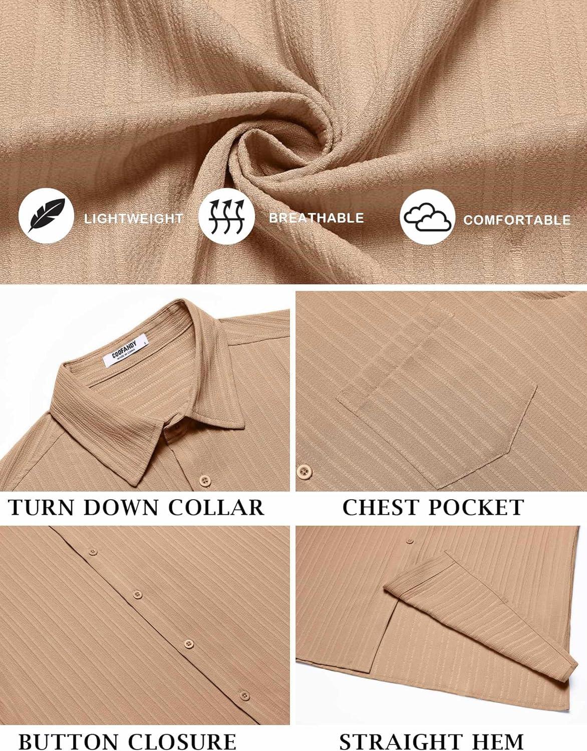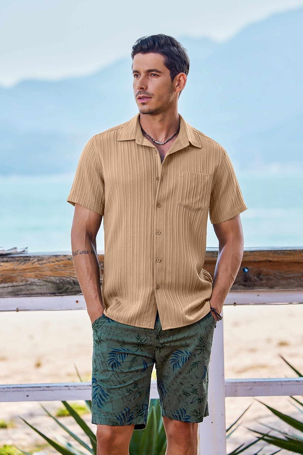 COOFANDY Men's Short Sleeve Casual Button Down Shirts Textured Summer Beach Shirt with Pocket(Khaki)