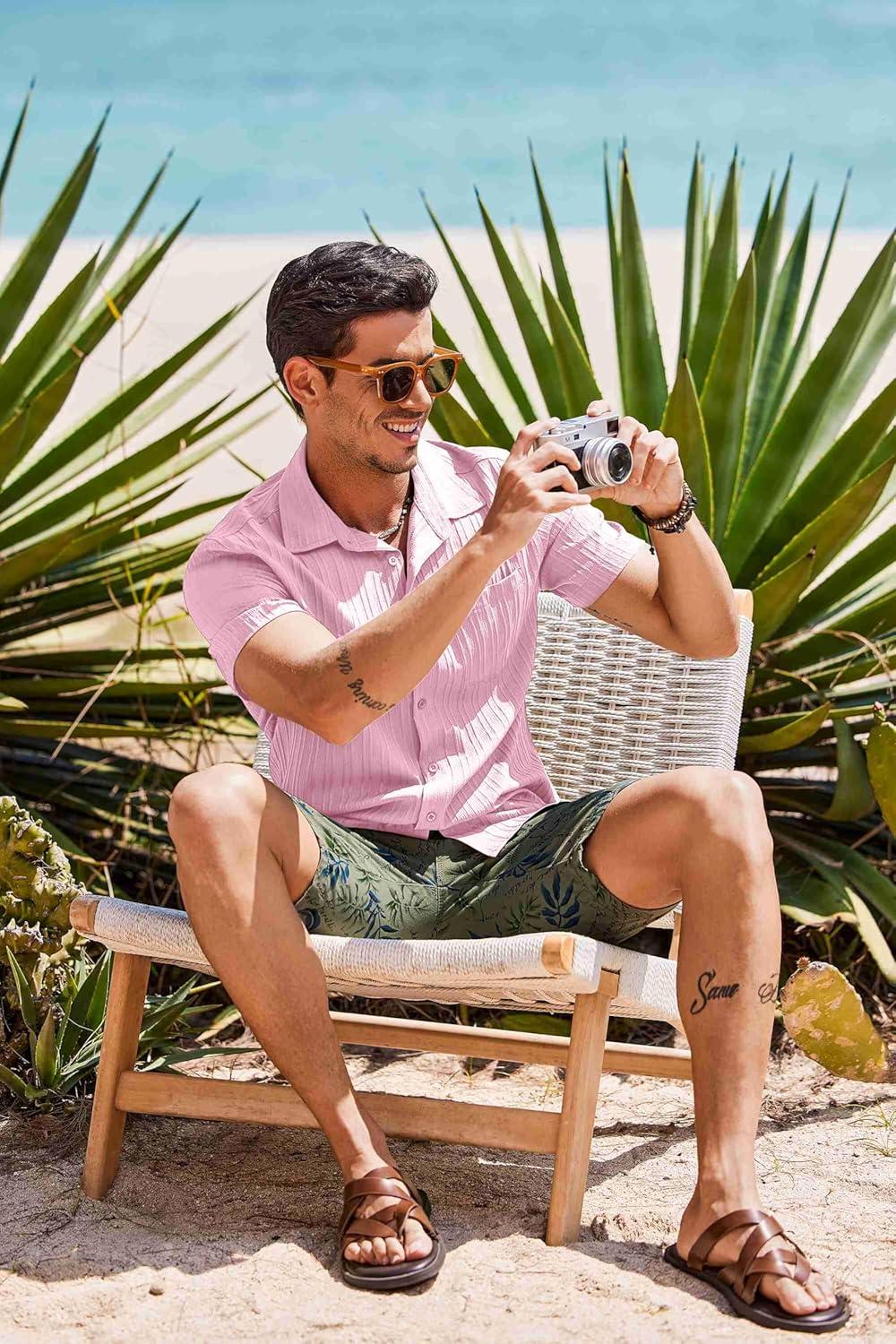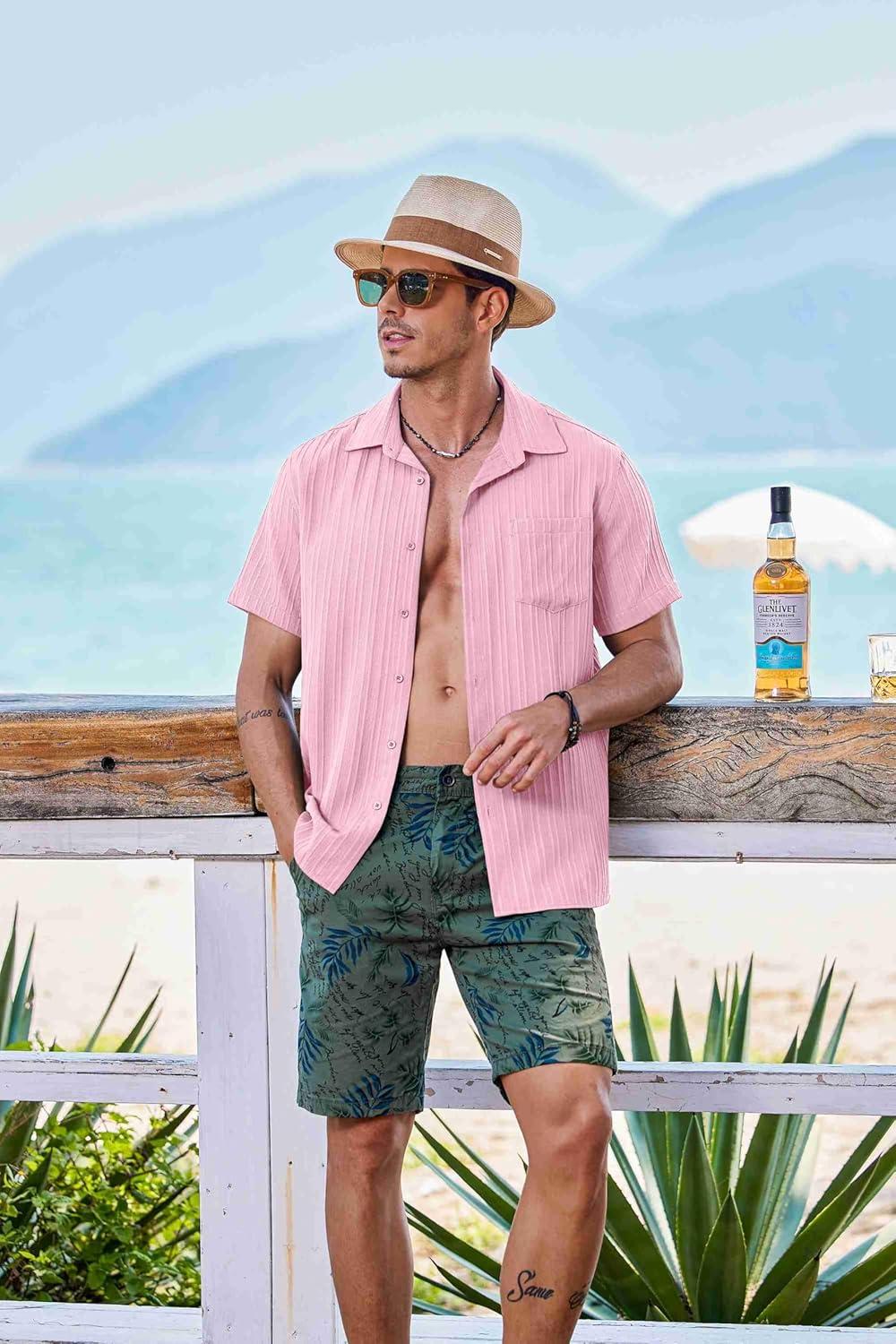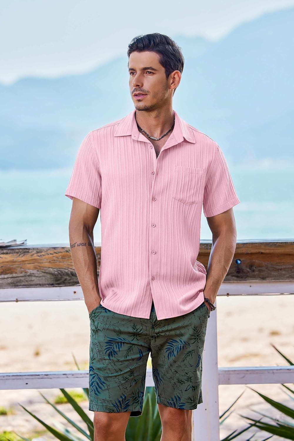COOFANDY Men's Short Sleeve Casual Button Down Shirts Textured Summer Beach Shirt with Pocket(Light Pink)