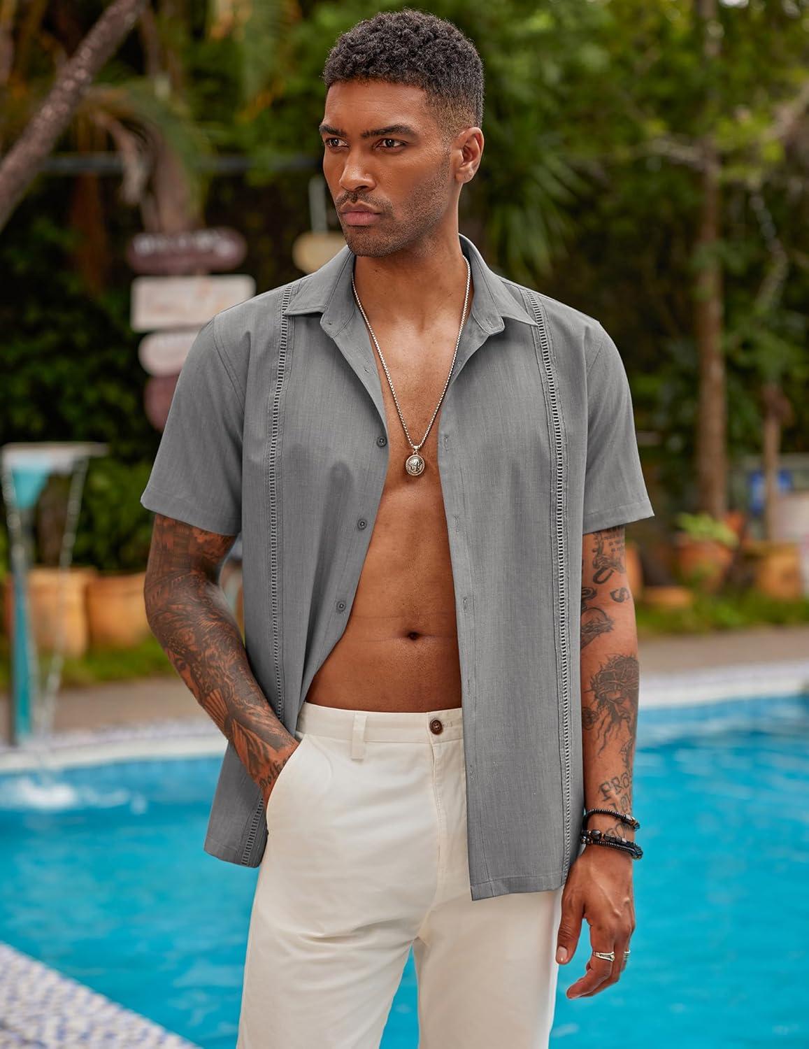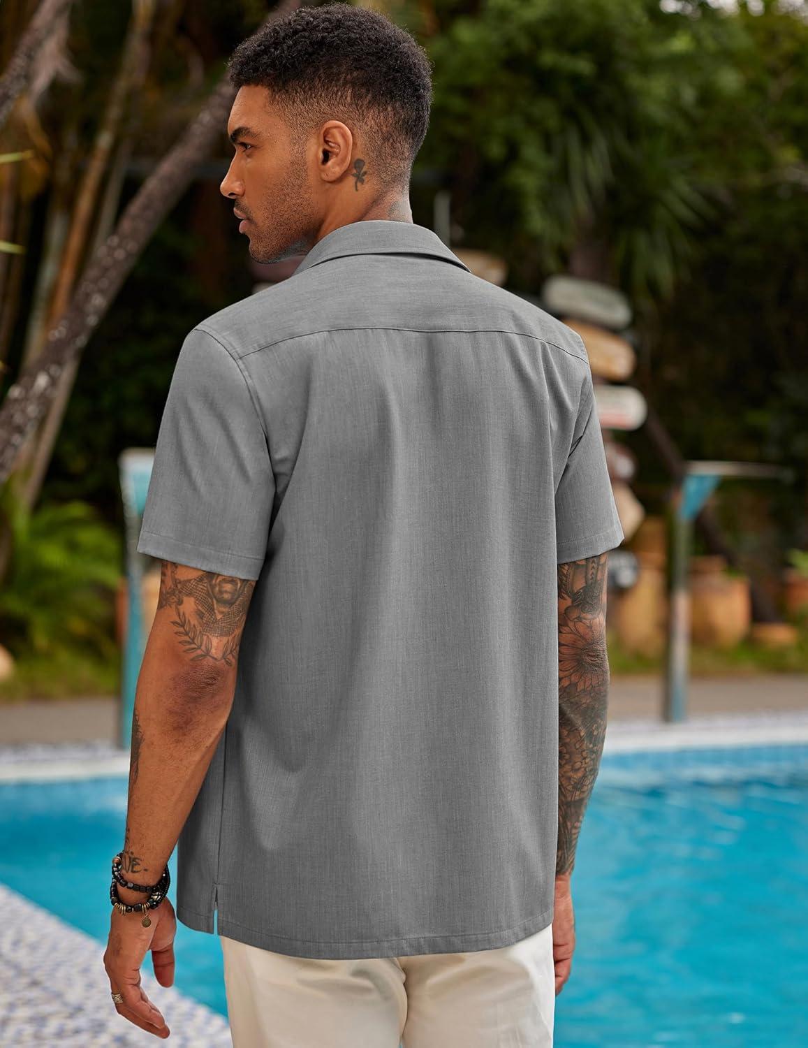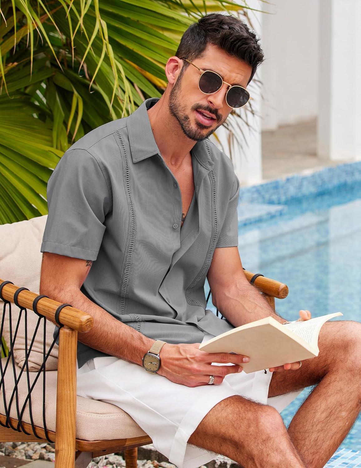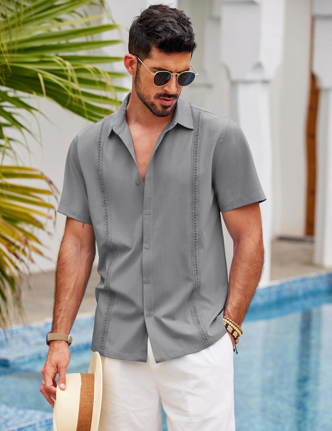 COOFANDY Mens Short Sleeve Cuban Guayabera Shirt Casual Summer Beach Button Down Shirts(Light Grey)