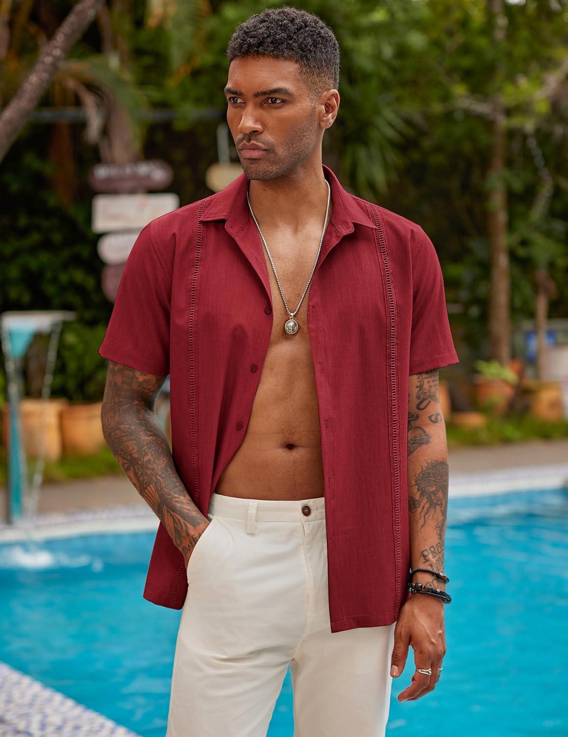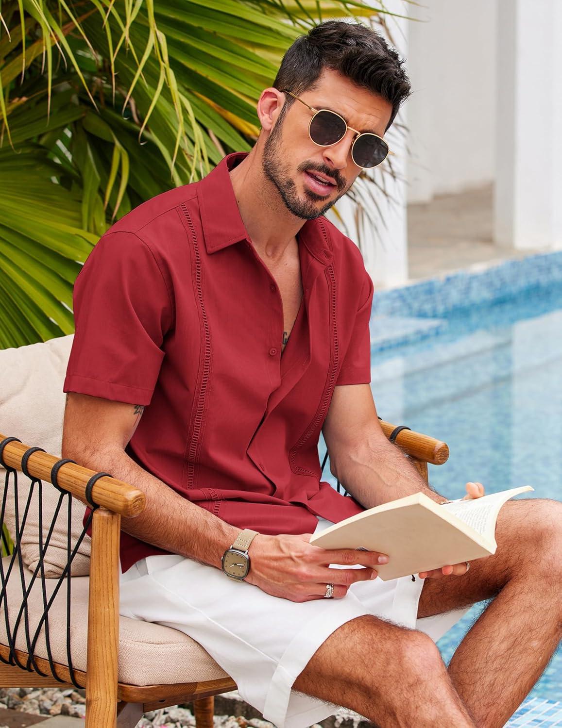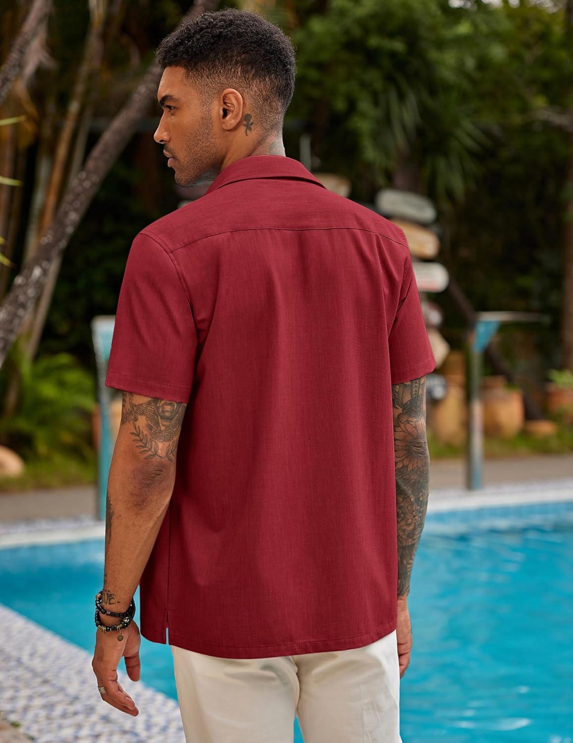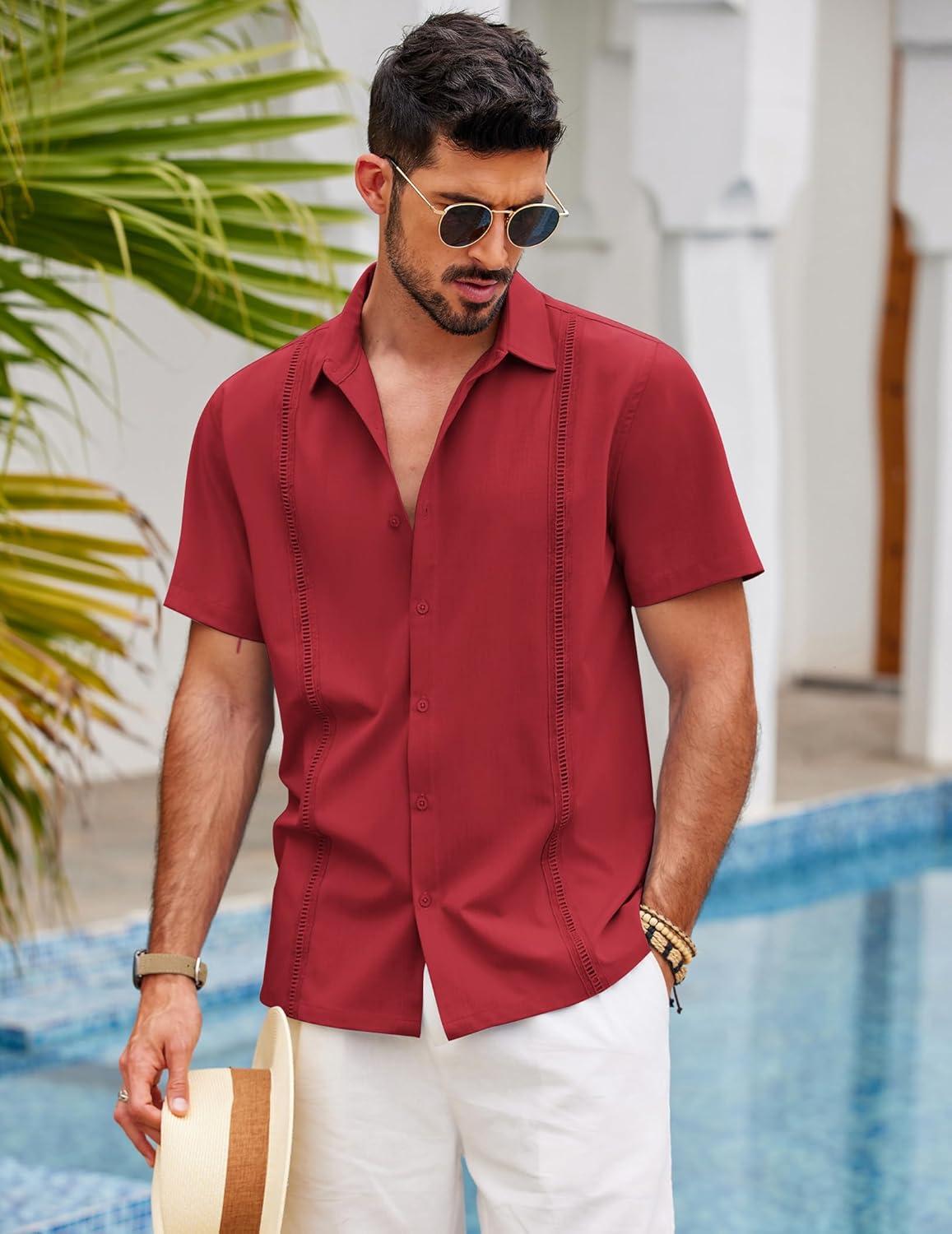 COOFANDY Mens Short Sleeve Cuban Guayabera Shirt Casual Summer Beach Button Down Shirts(Red)