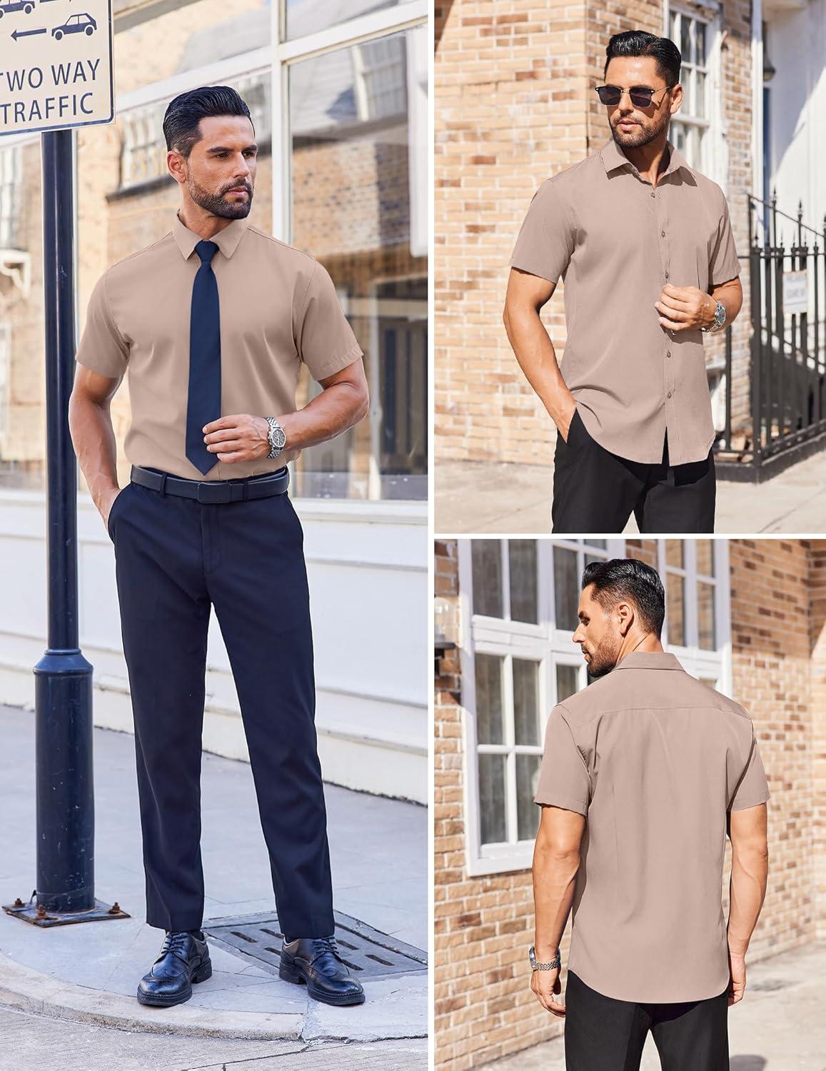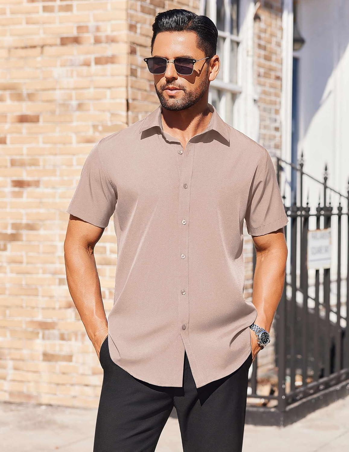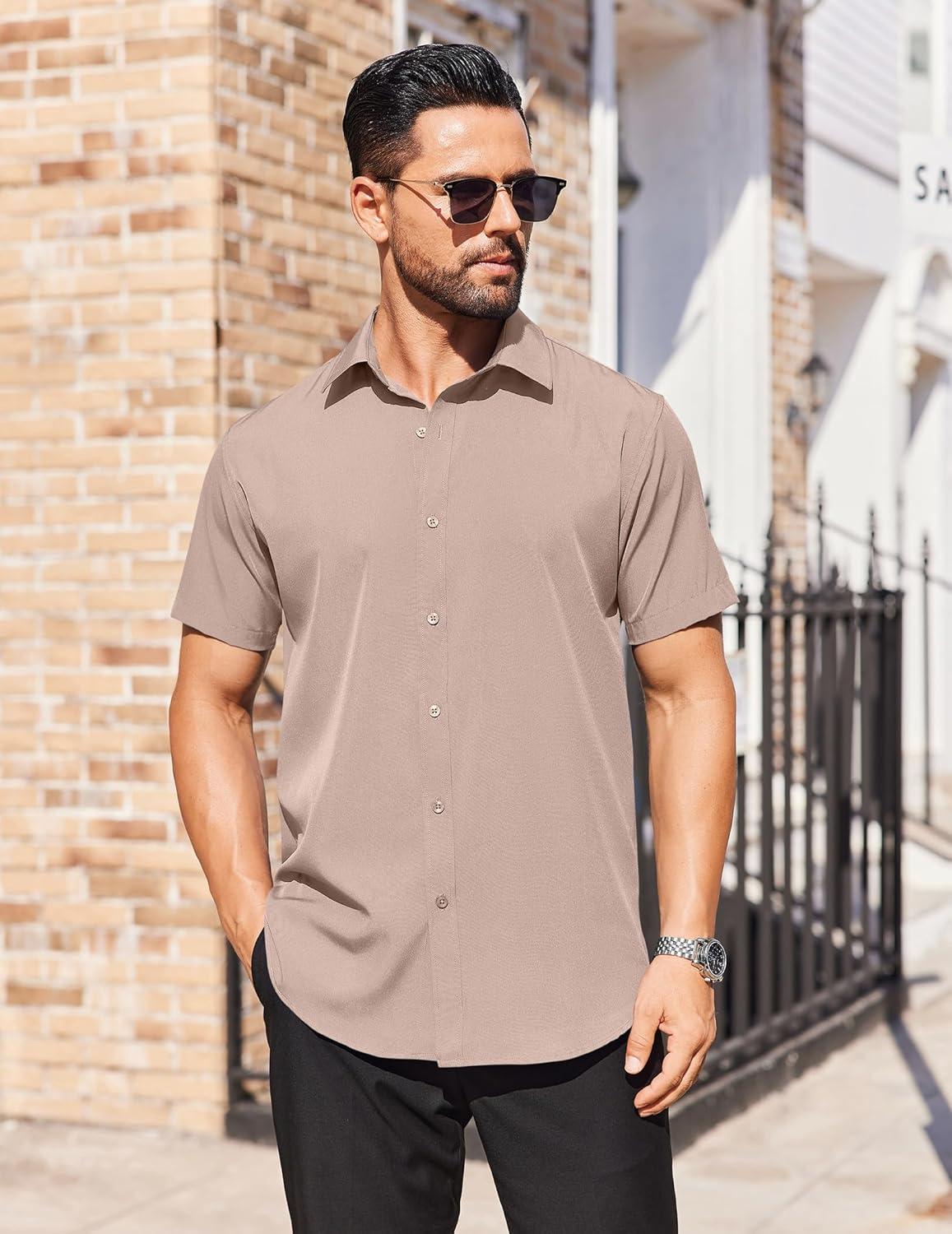 COOFANDY Men’s Short Sleeve Dress Shirts Stain Shield Button Down Shirt for Summer Business Wedding Party(Light Khaki)