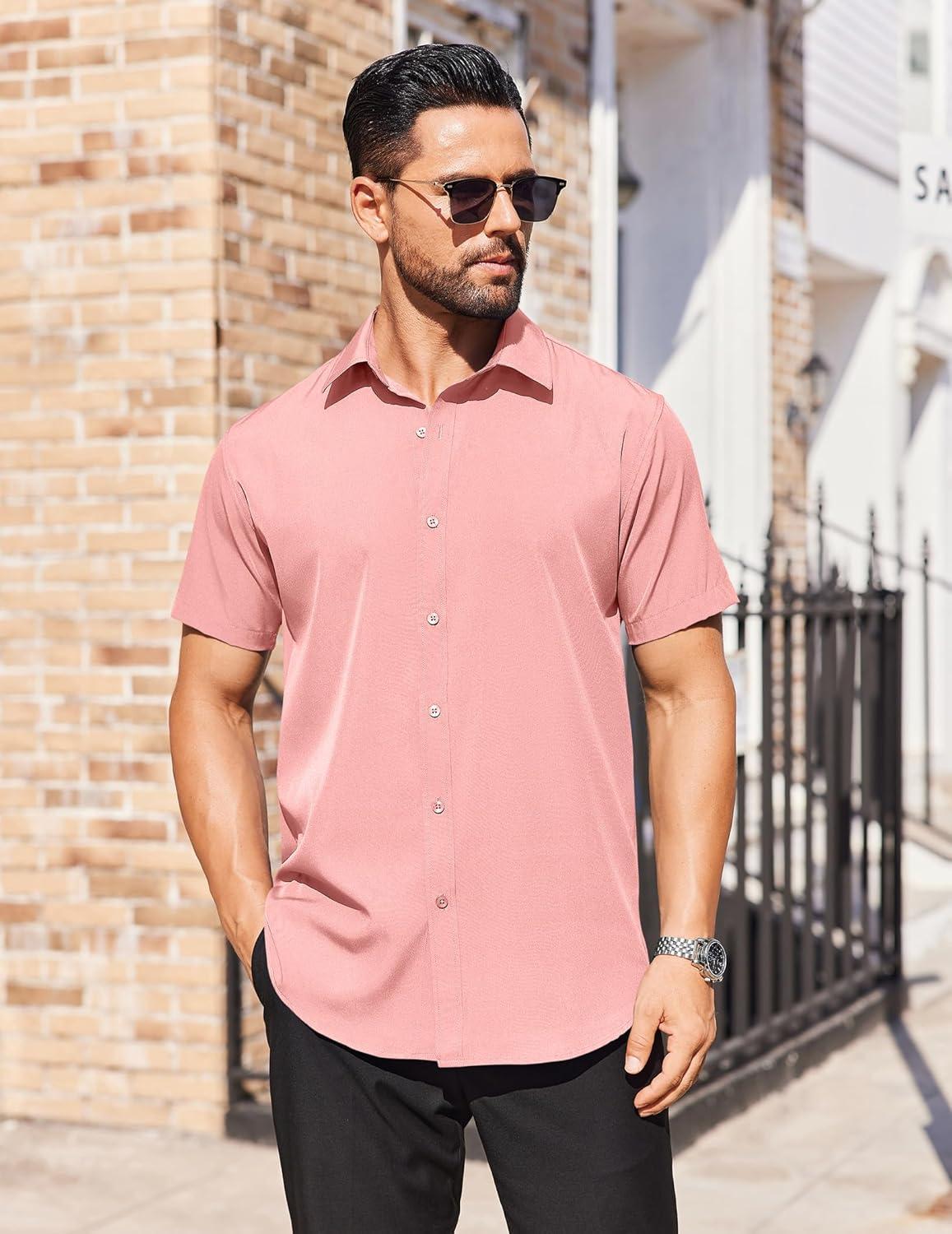 COOFANDY Men's Short Sleeve Dress Shirts Stain Shield Button Down Shirt for Summer Business Wedding Party(Pink)