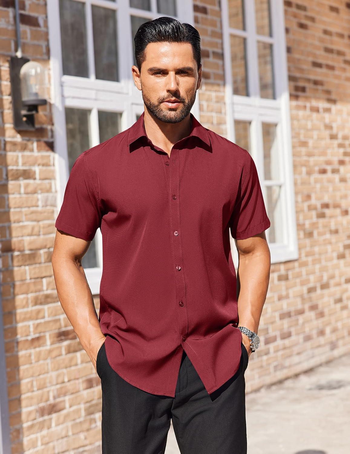 Get up to 60% off on COOFANDY Men’s Short Sleeve Dress Shirts Stain Shield Button Down Shirt for Summer Business Wedding Party(Wine Red) styles during our winter sale event.