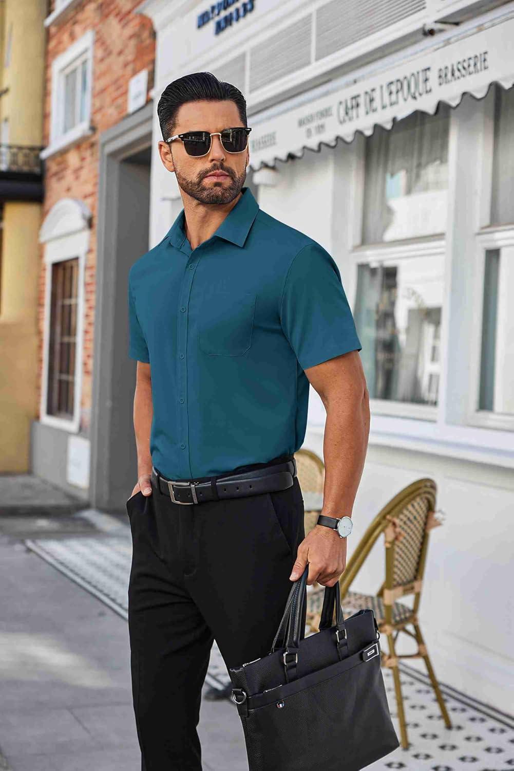 COOFANDY Mens Short Sleeve Dress Shirts Wrinkle Free Business Casual Button Down Shirt with Pocket(Army Green)