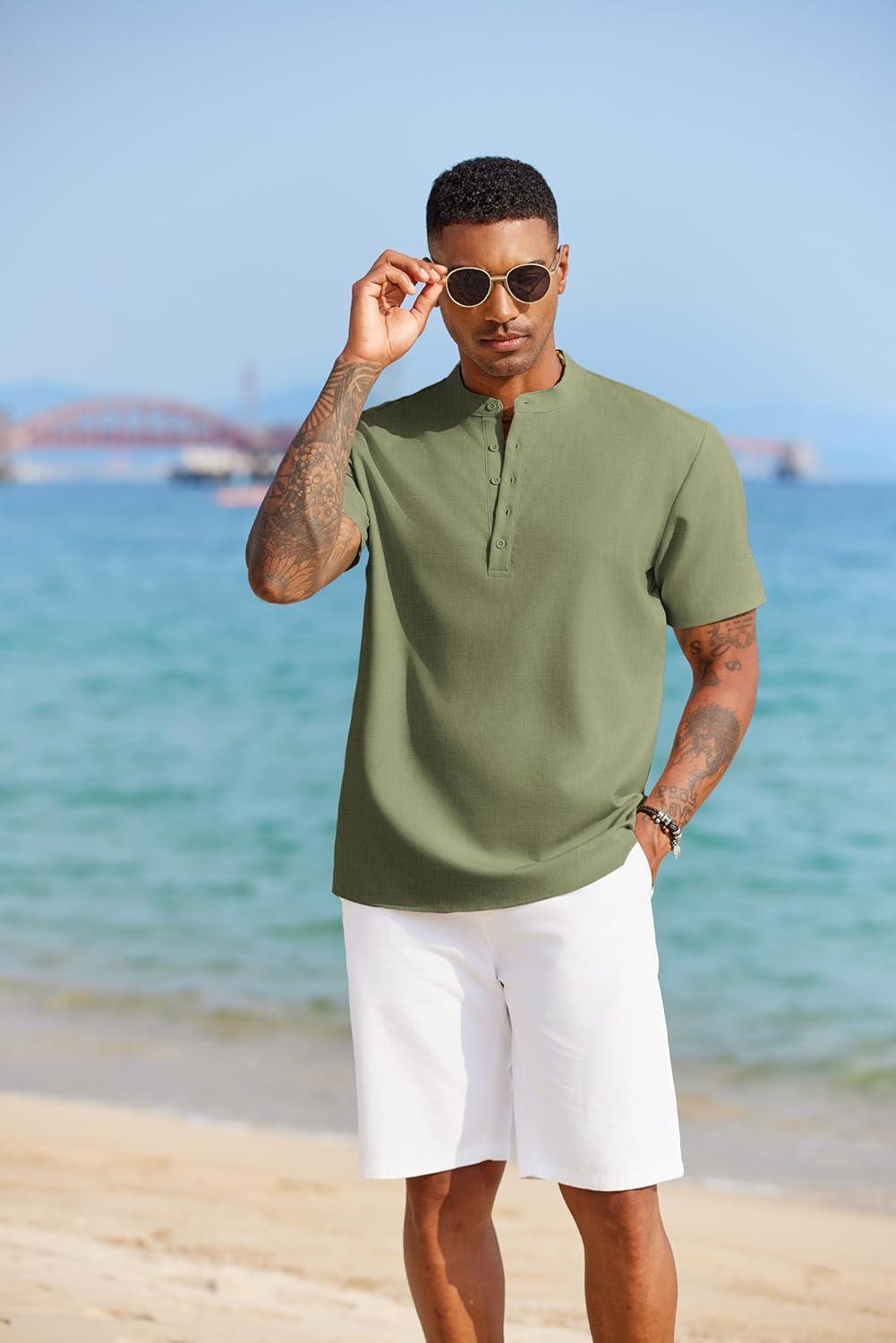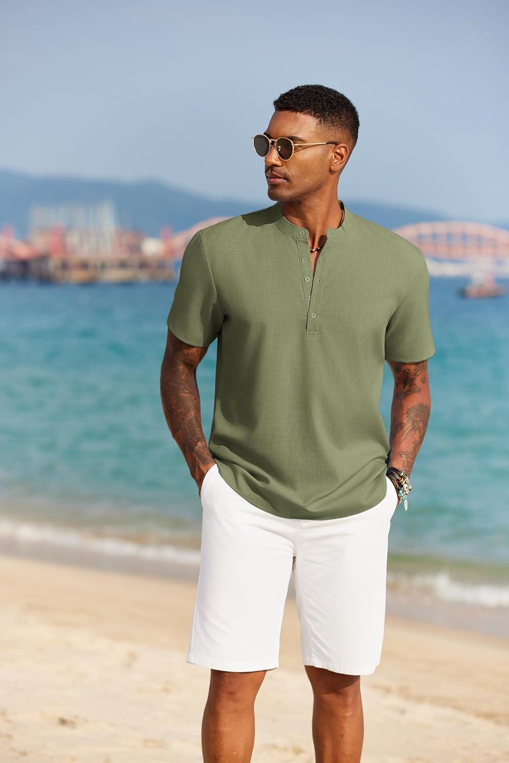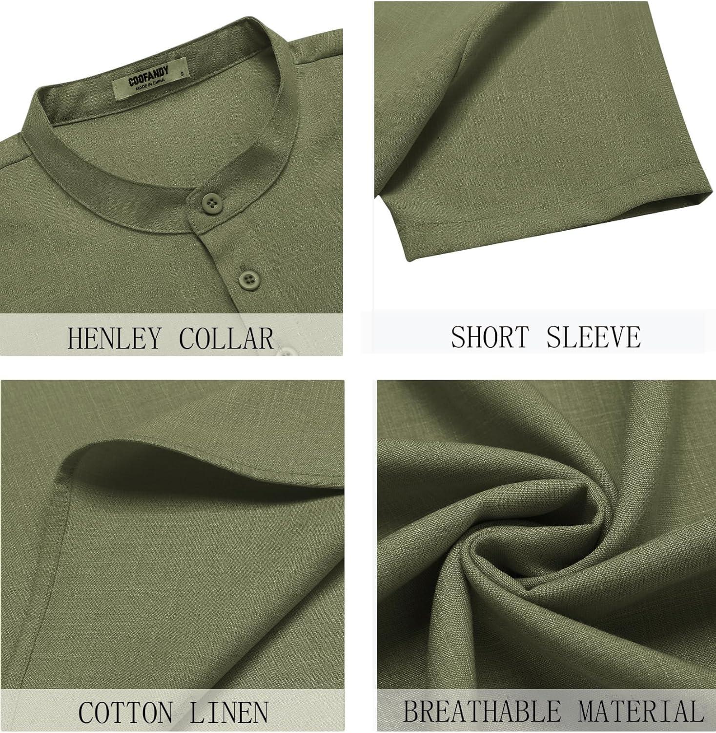 COOFANDY Men's Short Sleeve Henley Shirts Casual Collarless Shirt Band Collar Henley Summer Beach Henley T-Shirt(Army Green)