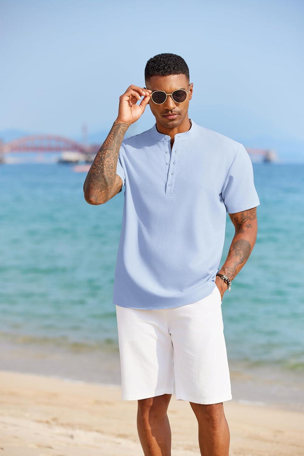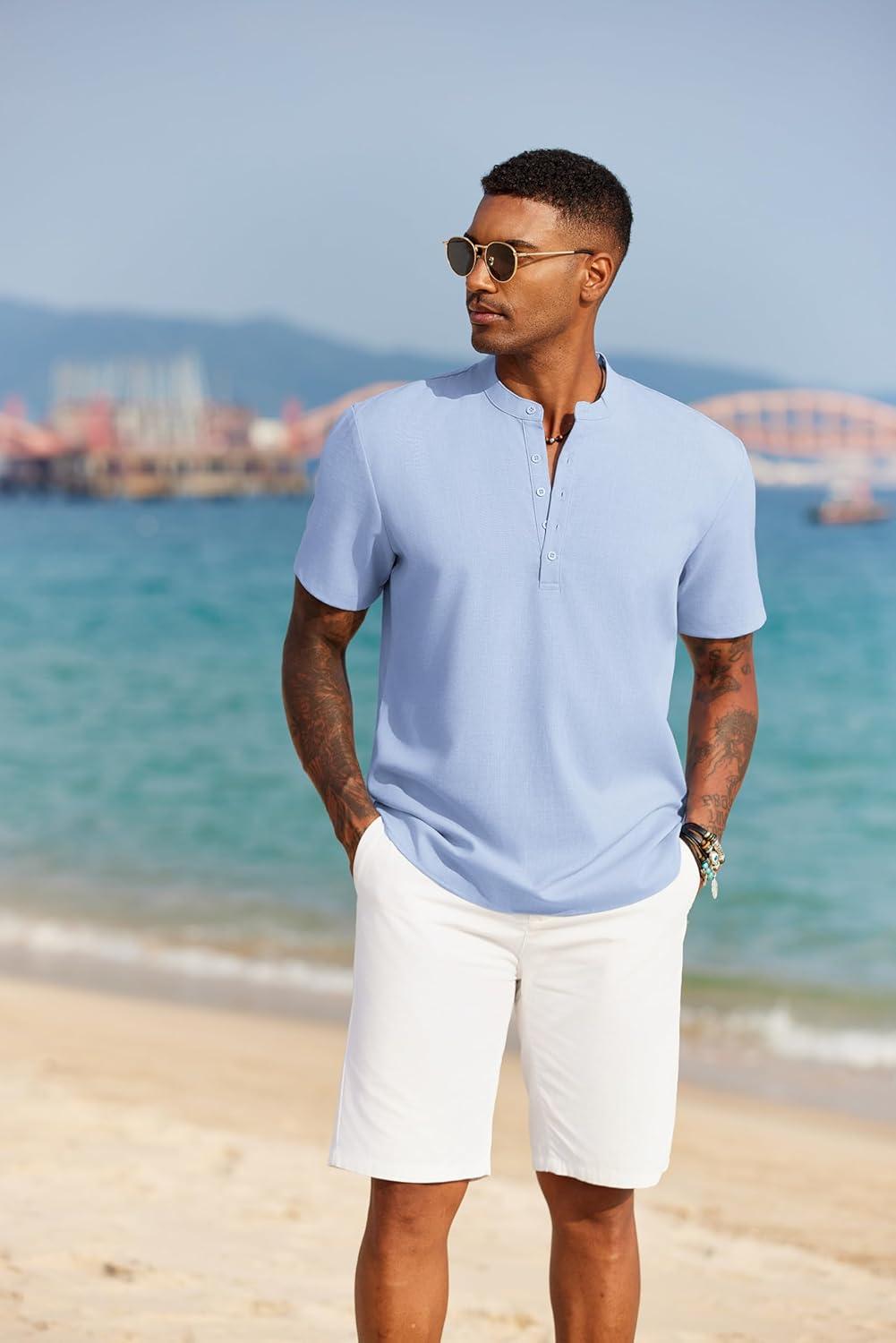 Get up to 50% off on COOFANDY Men’s Short Sleeve Henley Shirts Casual Collarless Shirt Band Collar Henley Summer Beach Henley T-Shirt(Light Blue) styles during our spring sale event.