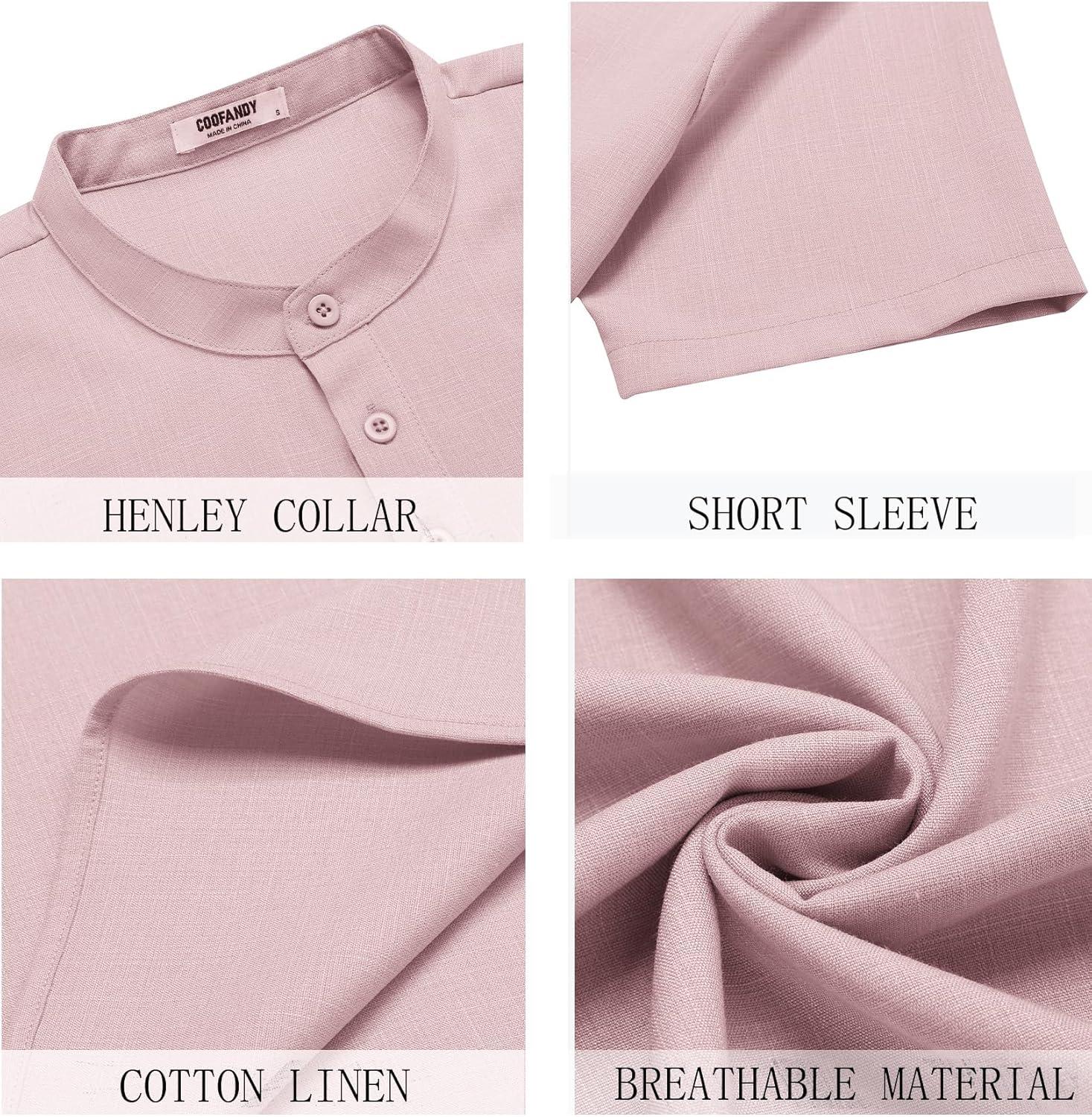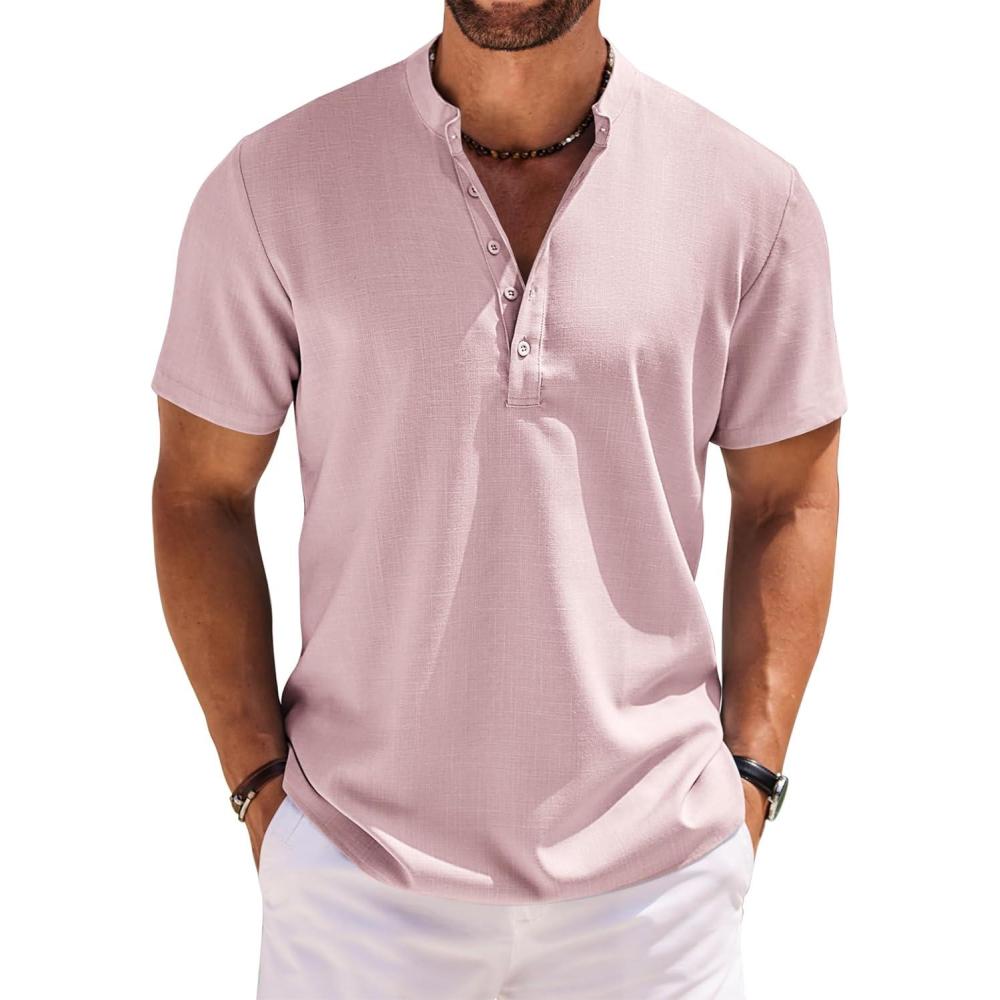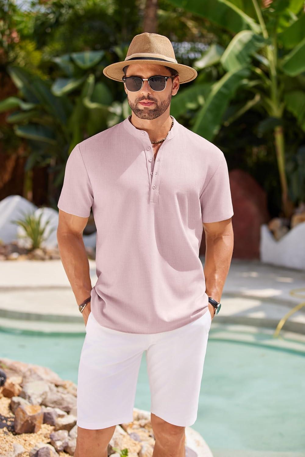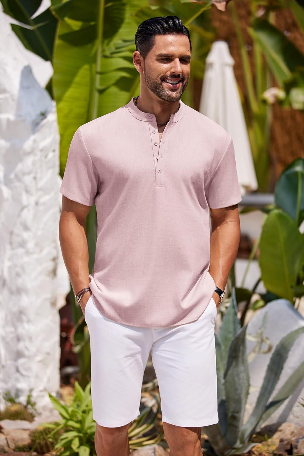 COOFANDY Men’s Short Sleeve Henley Shirts Casual Collarless Shirt Band Collar Henley Summer Beach Henley T-Shirt(Pink)