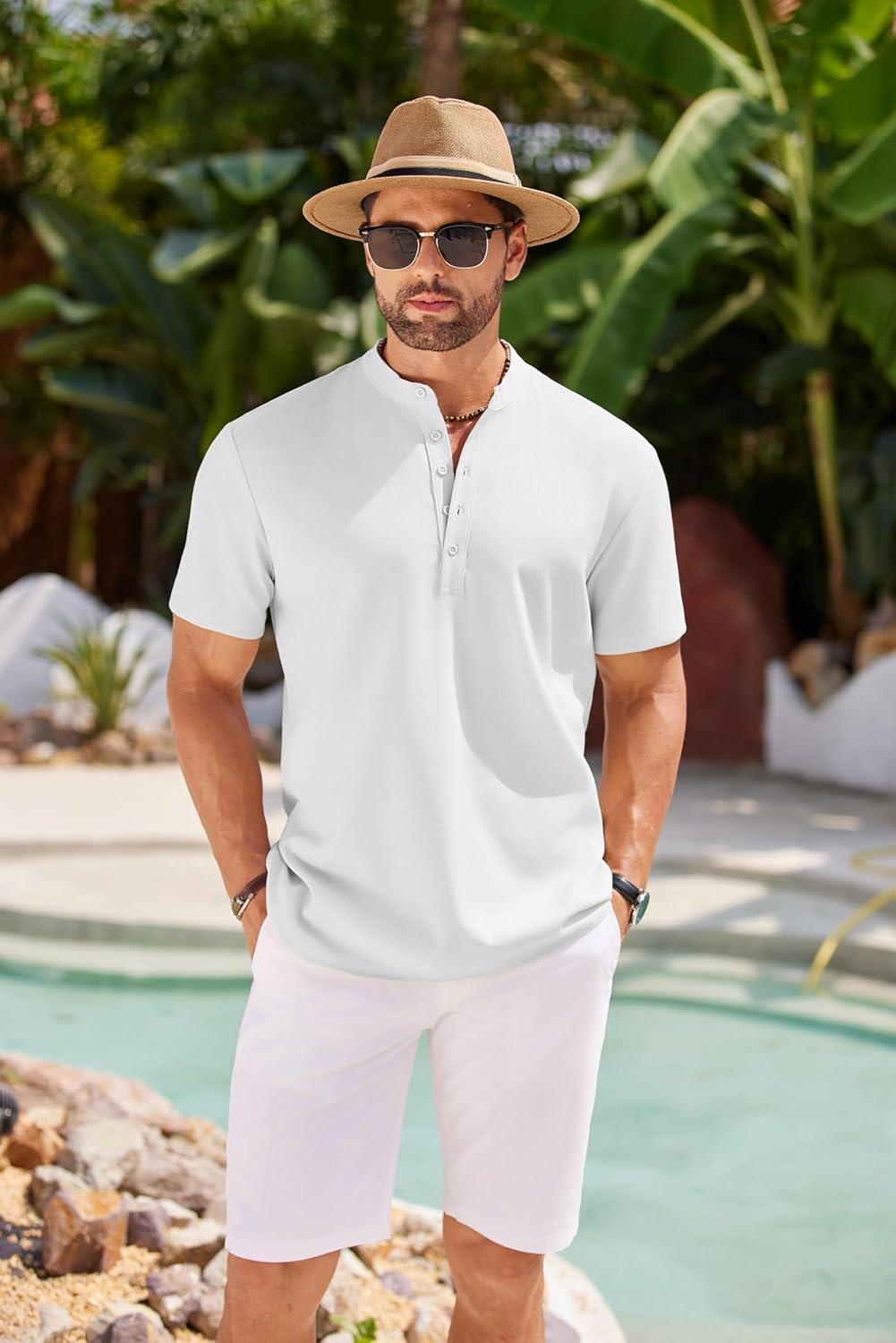 COOFANDY Men's Short Sleeve Henley Shirts Casual Collarless Shirt Band Collar Henley Summer Beach Henley T-Shirt(White)