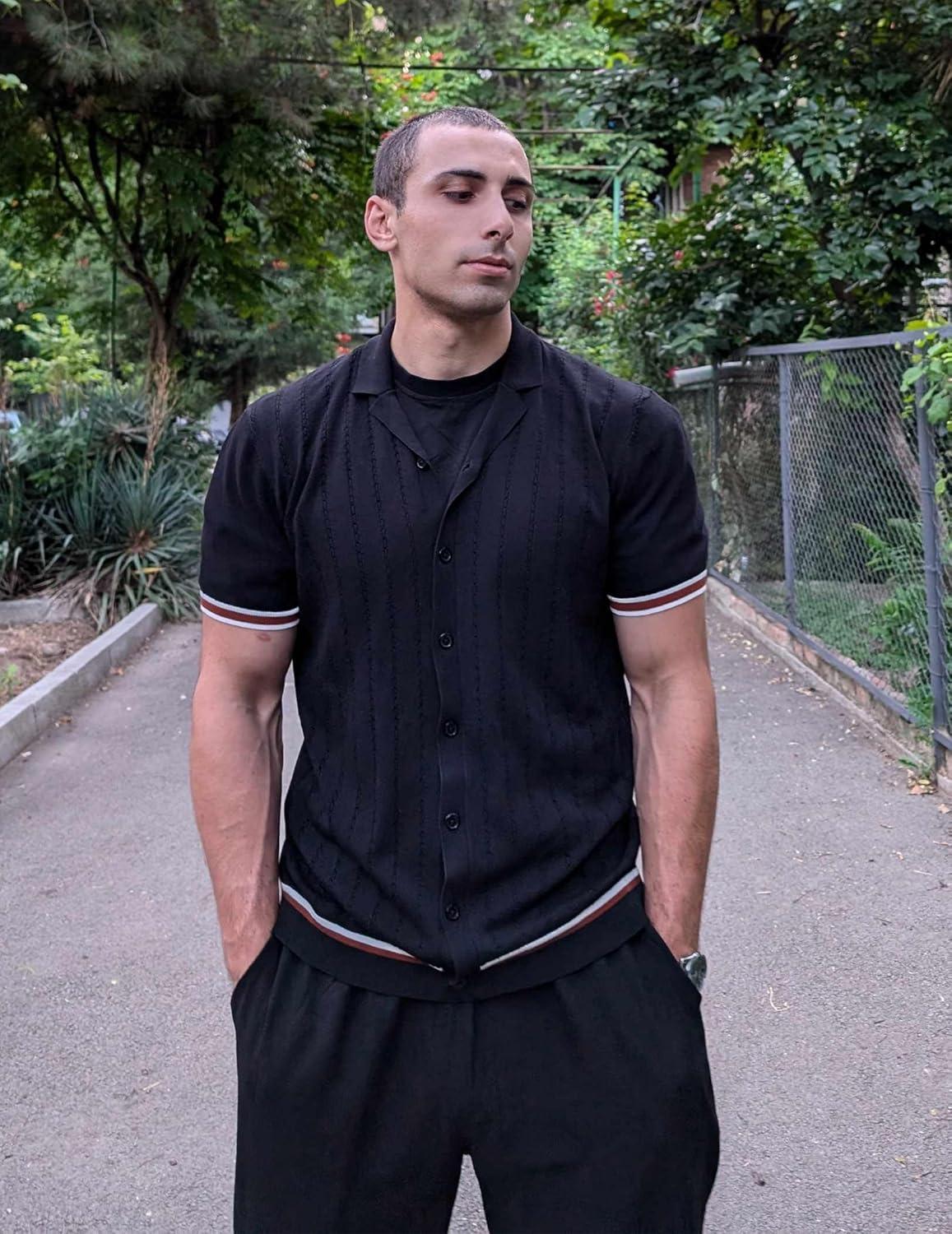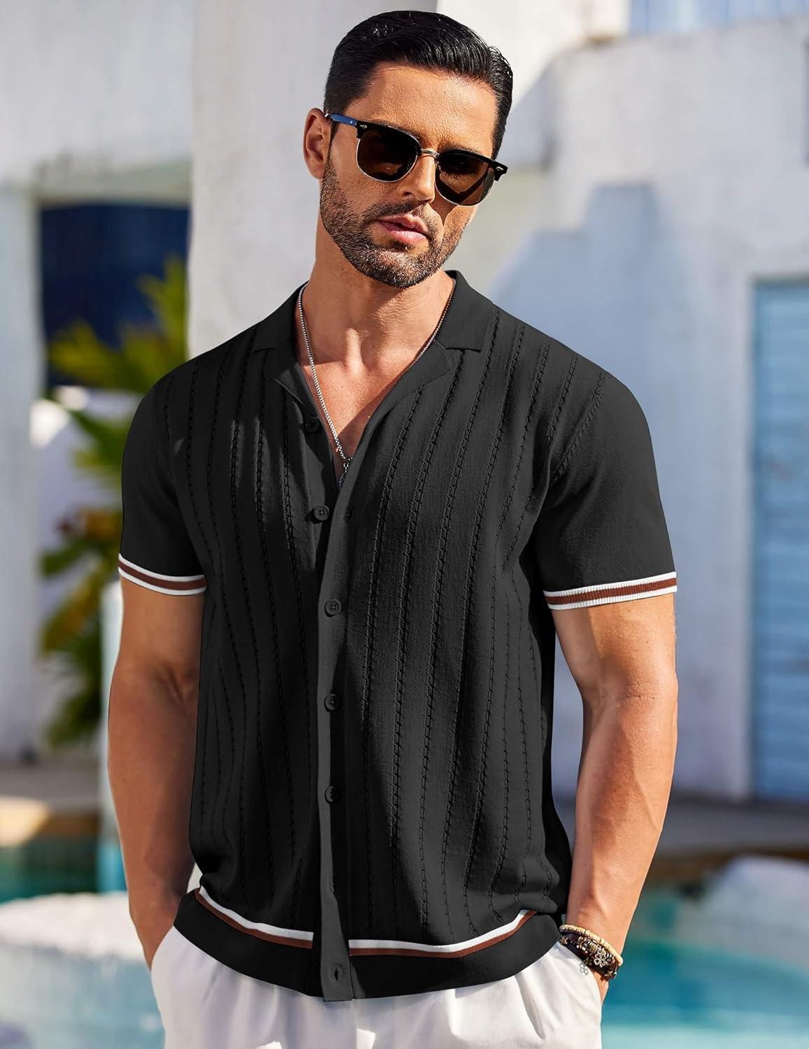 COOFANDY Men’s Short Sleeve Knit Shirt Casual Button Down Shirt Vintage Striped Knitted Golf Beach Tops(Black)