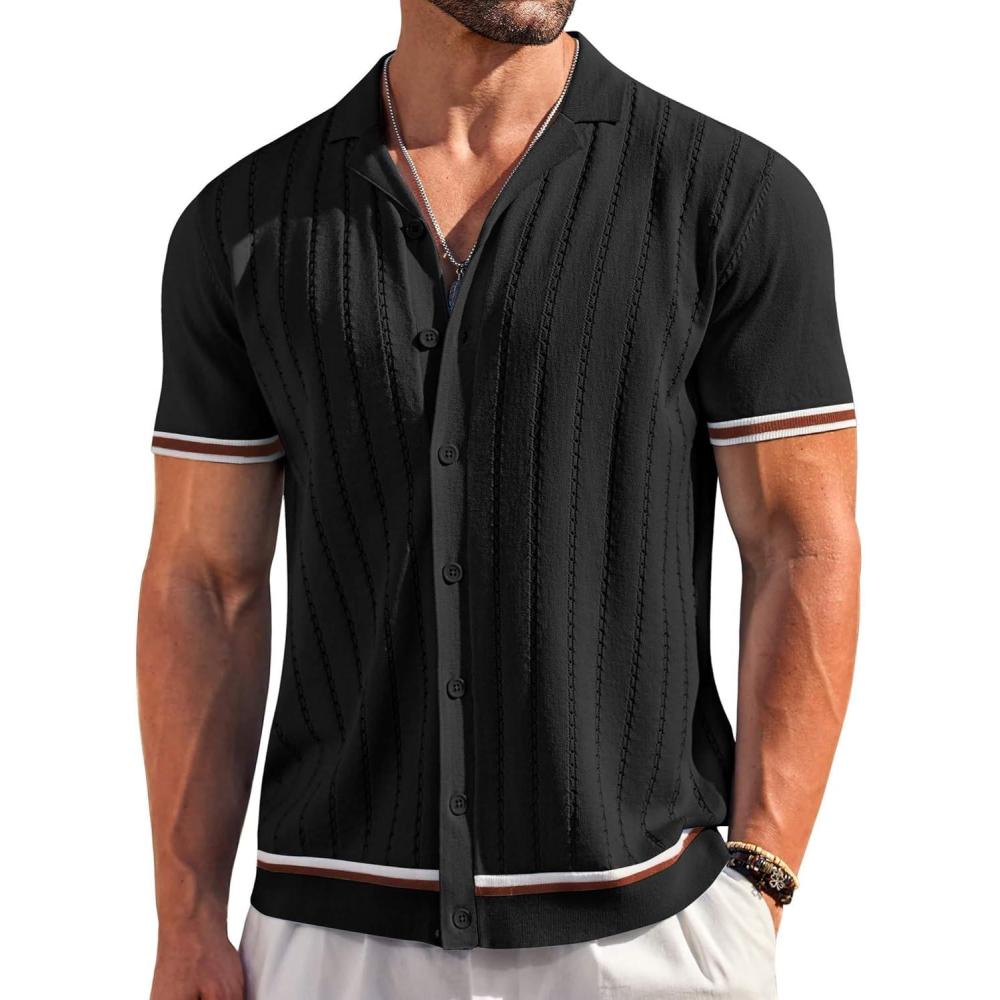 COOFANDY Men's Short Sleeve Knit Shirt Casual Button Down Shirt Vintage Striped Knitted Golf Beach Tops(Black)