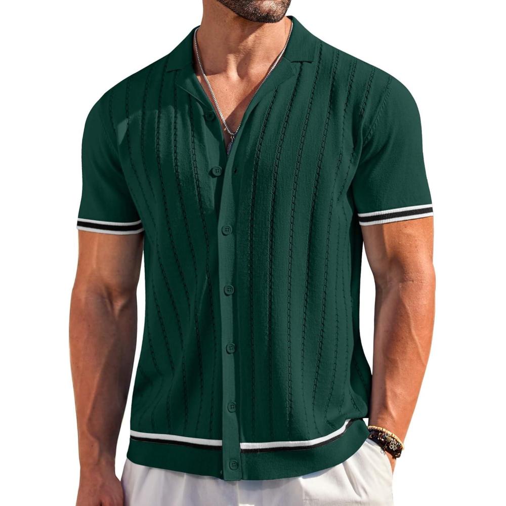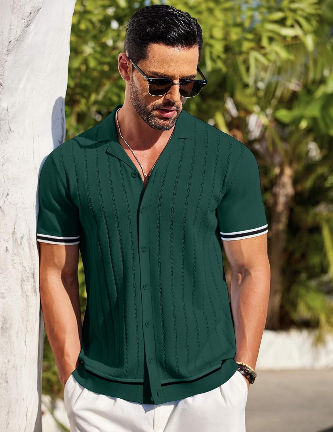COOFANDY Men’s Short Sleeve Knit Shirt Casual Button Down Shirt Vintage Striped Knitted Golf Beach Tops(Lake Green)