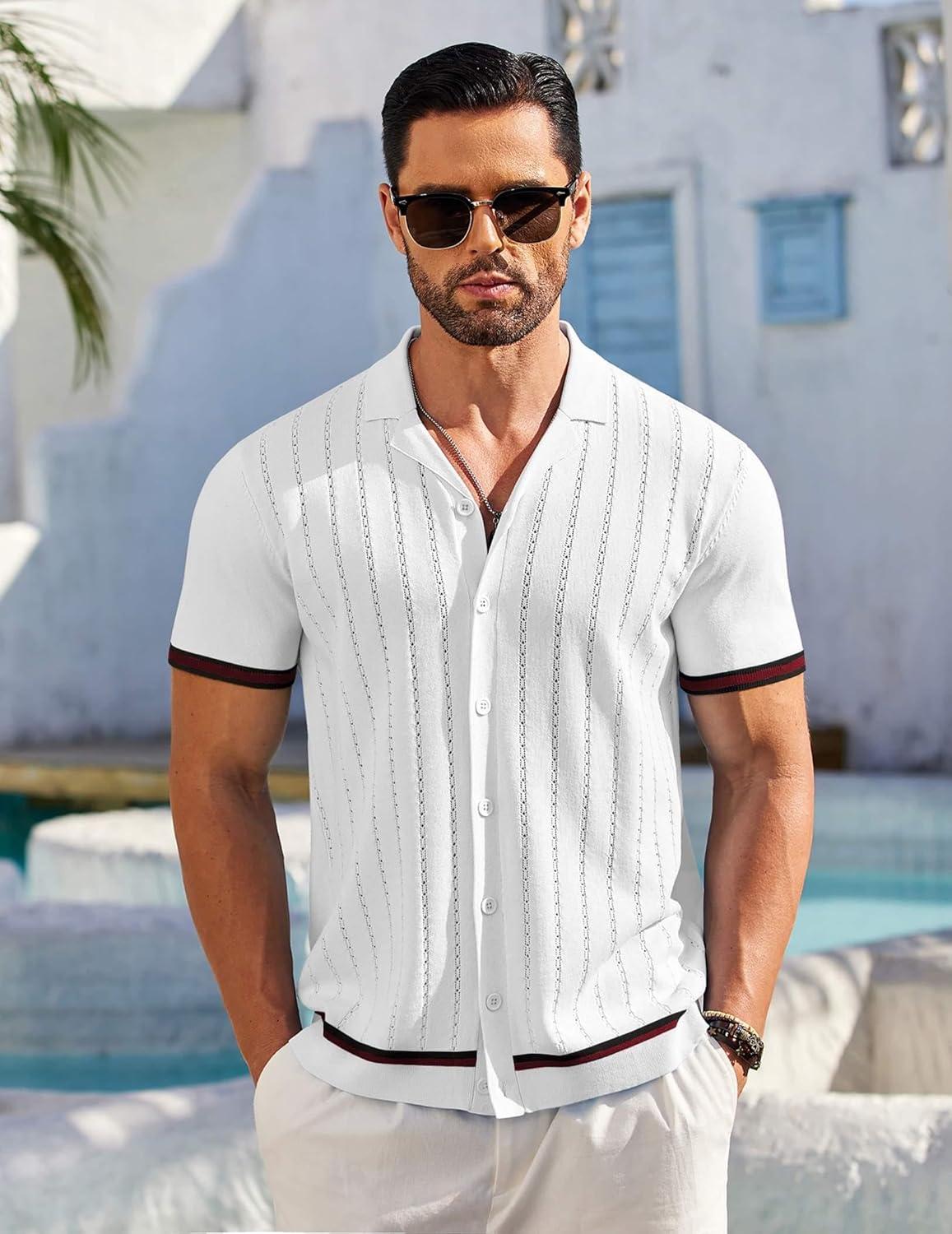 COOFANDY Men’s Short Sleeve Knit Shirt Casual Button Down Shirt Vintage Striped Knitted Golf Beach Tops(White)