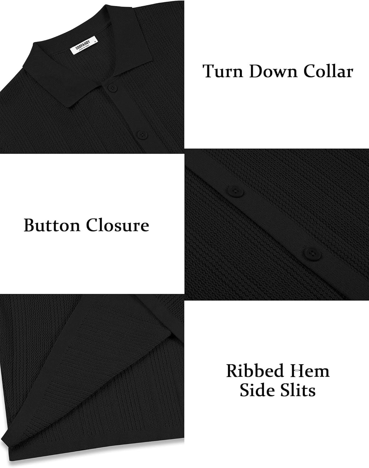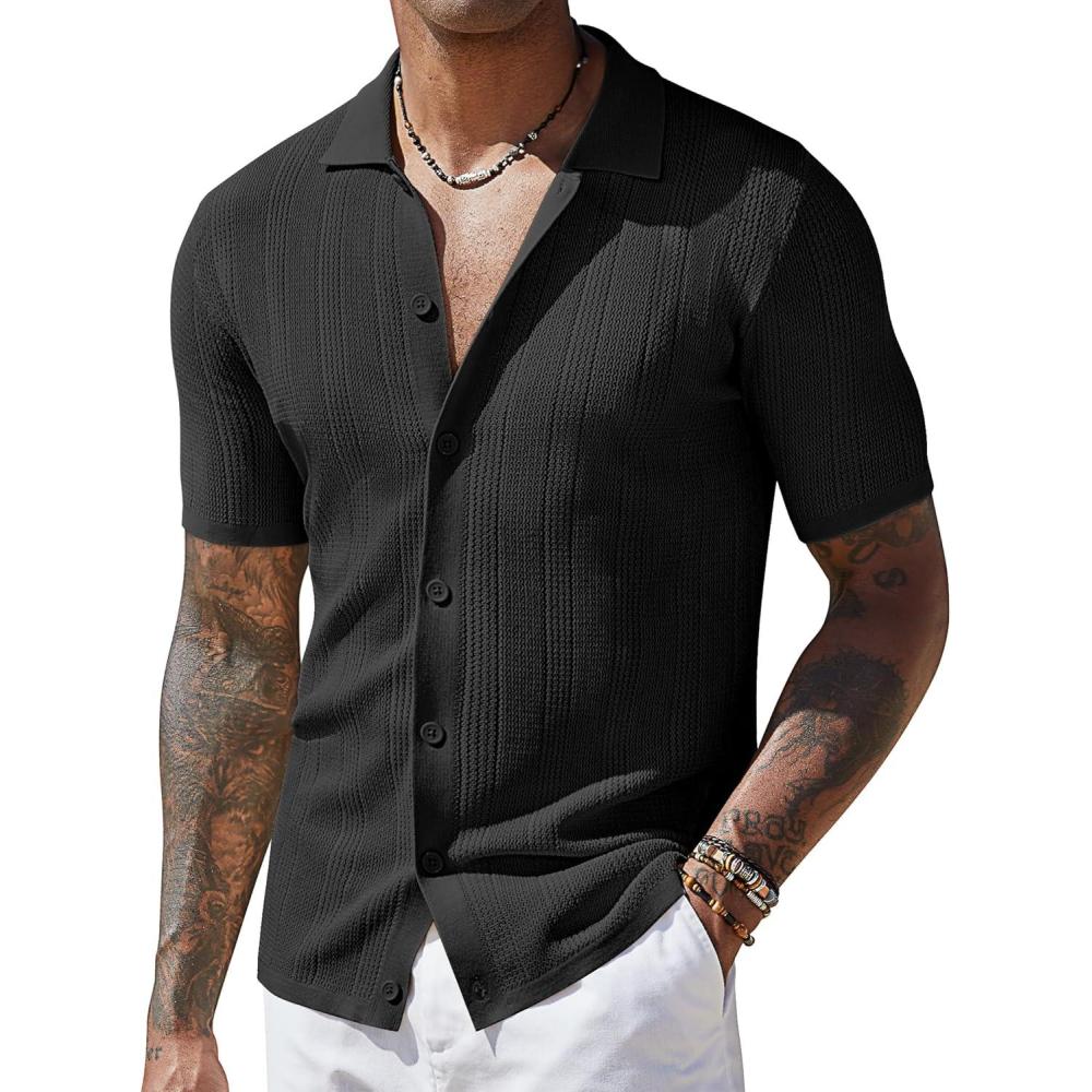 COOFANDY Men’s Short Sleeve Knit Shirts Casual Button Down Polo Shirt Fashion Summer Beach Tops(Black)