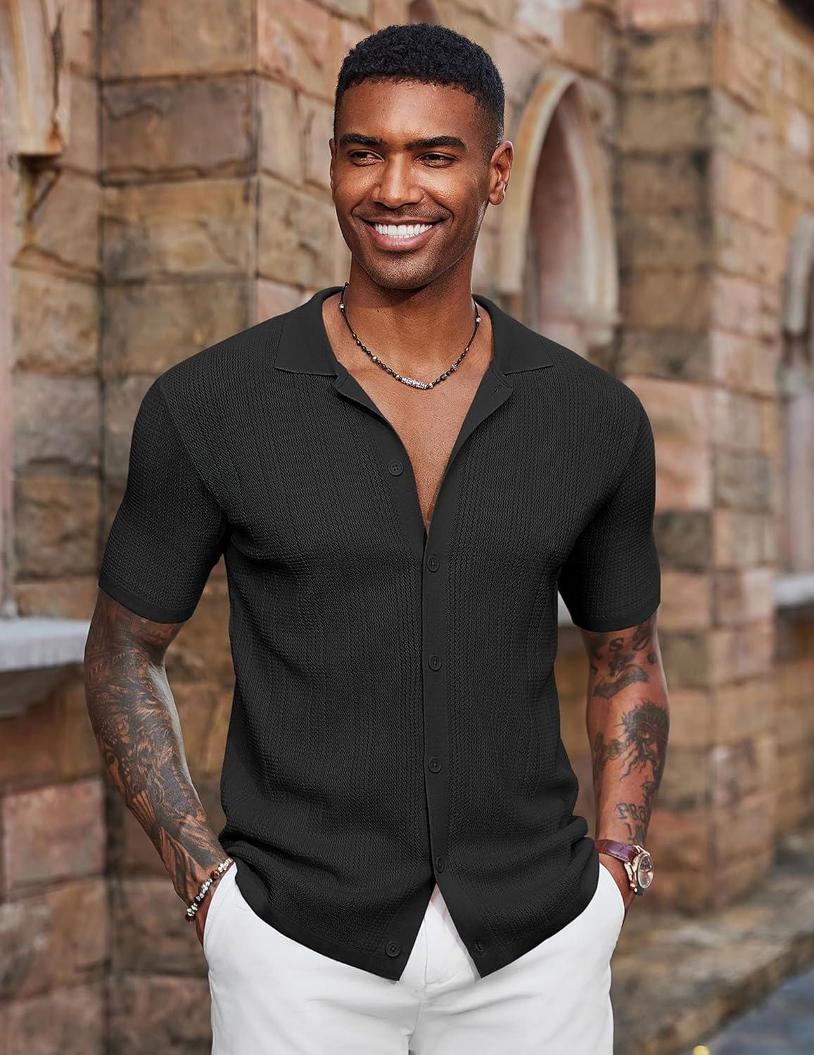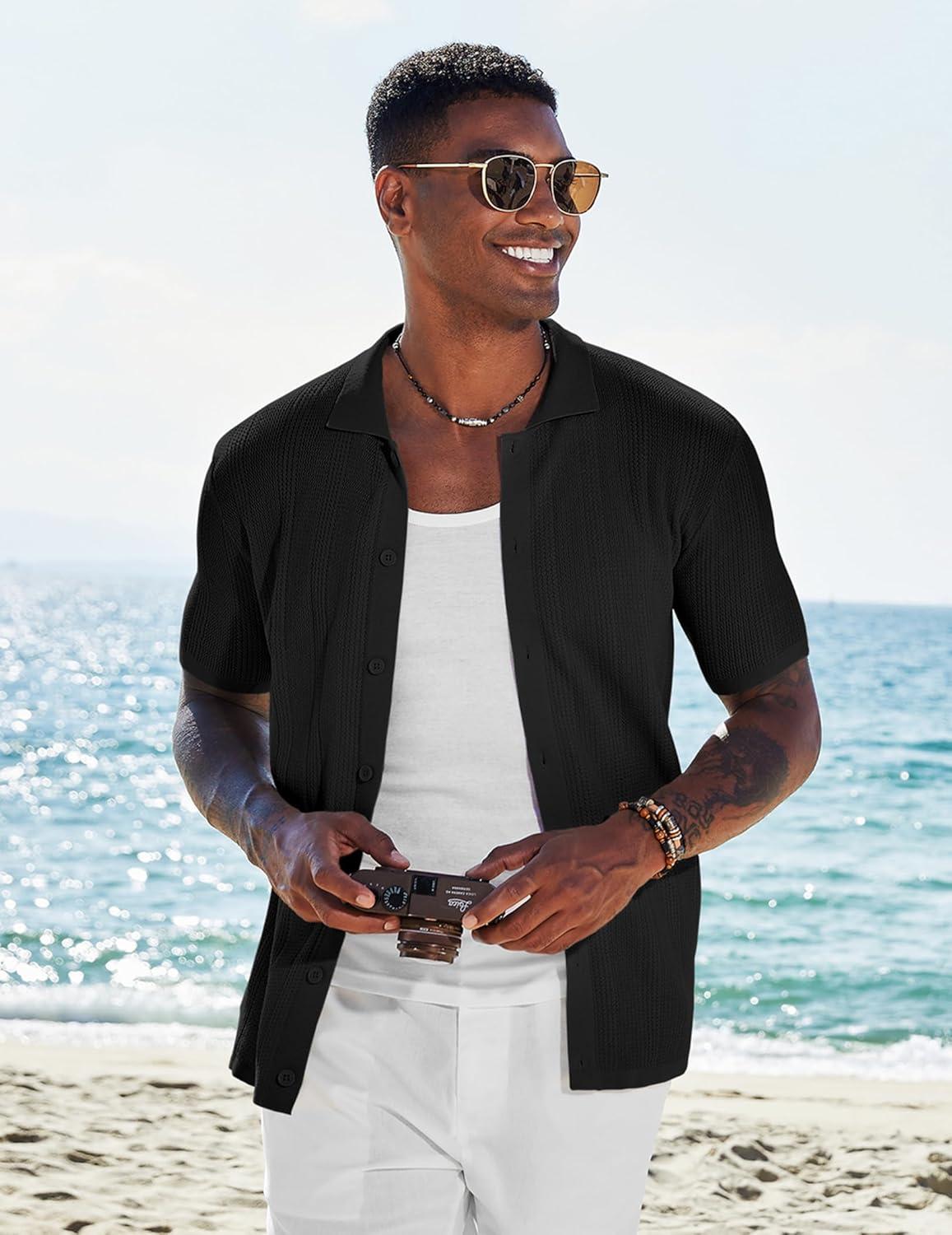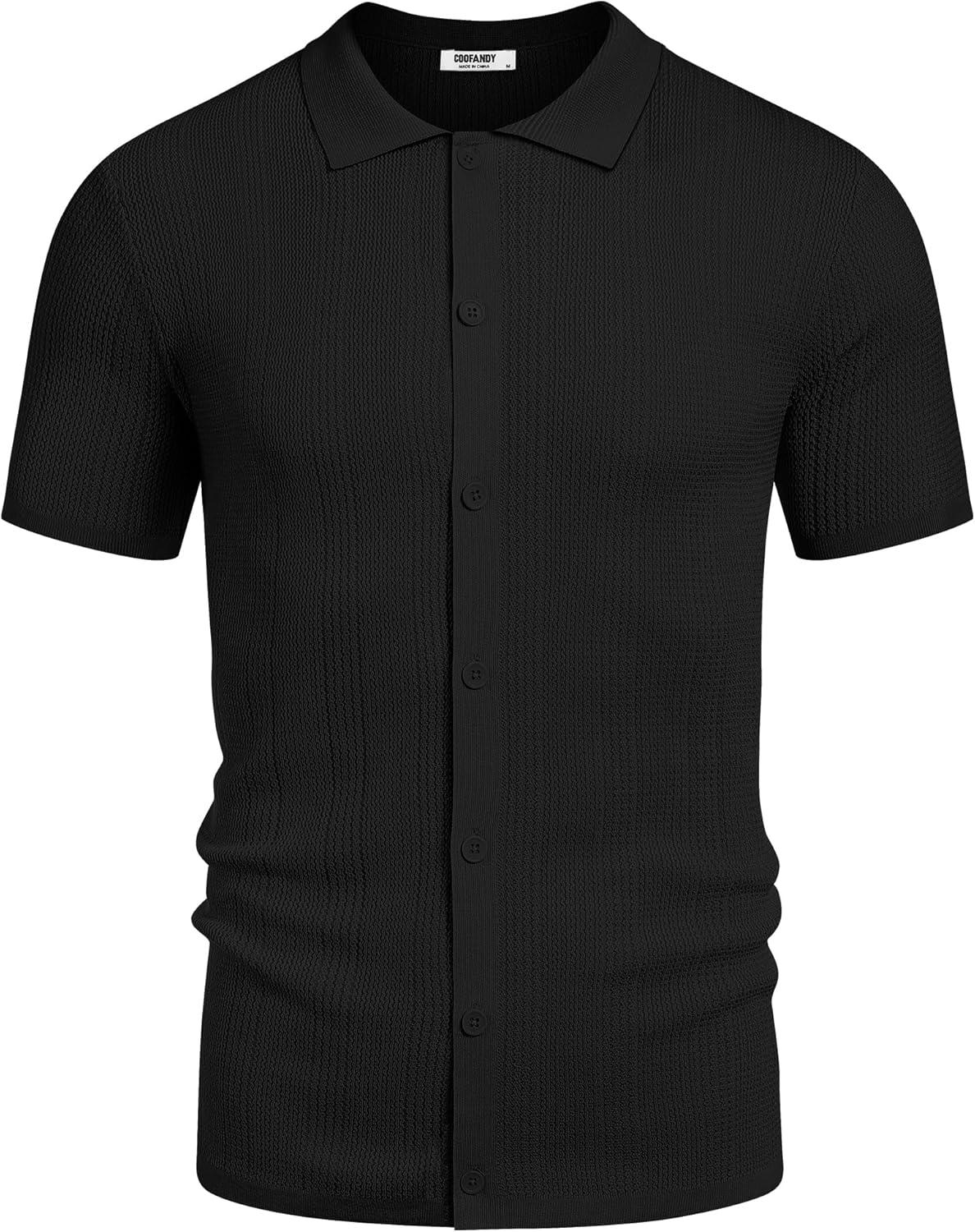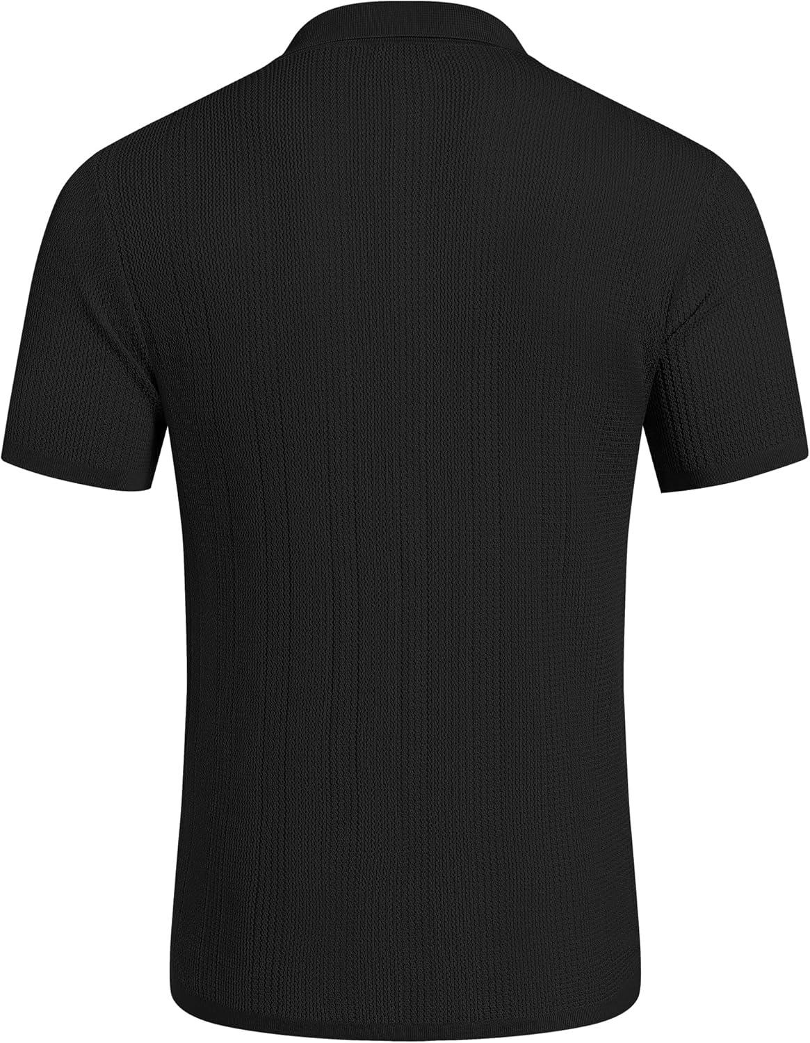 COOFANDY Men's Short Sleeve Knit Shirts Casual Button Down Polo Shirt Fashion Summer Beach Tops(Black)