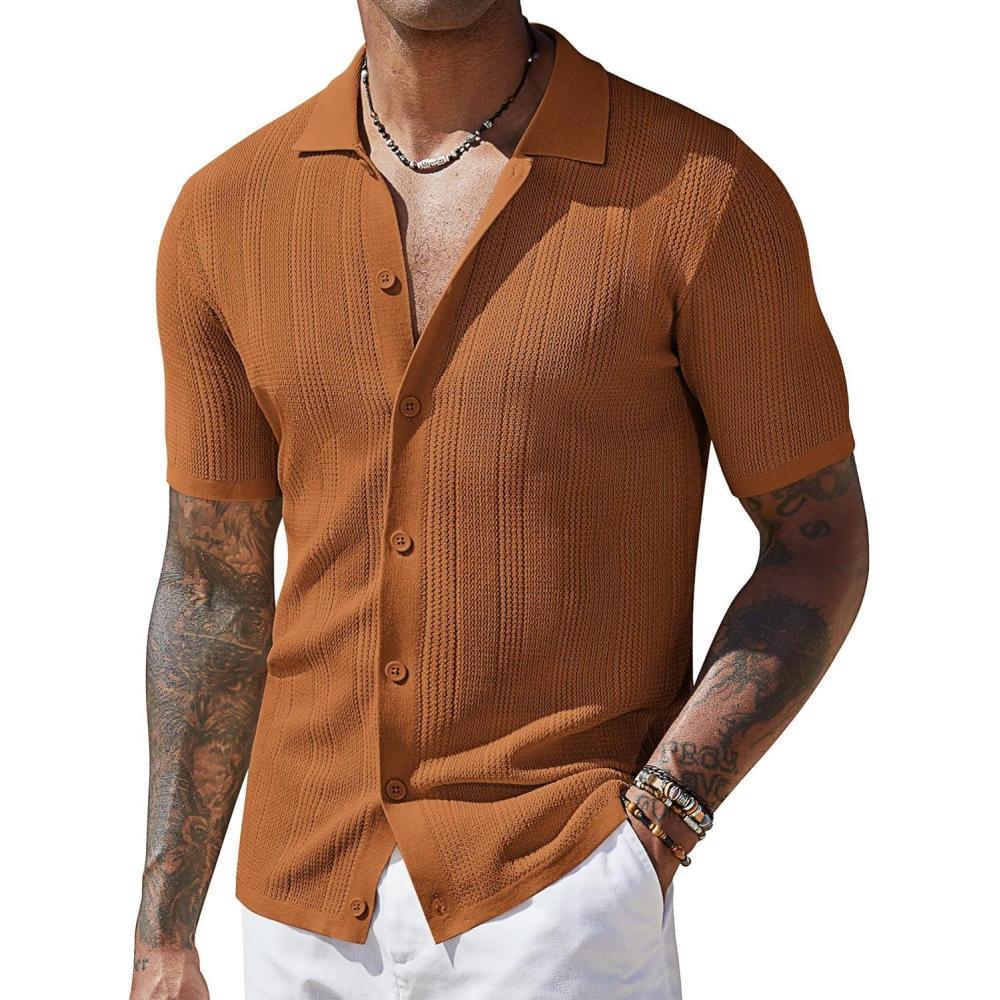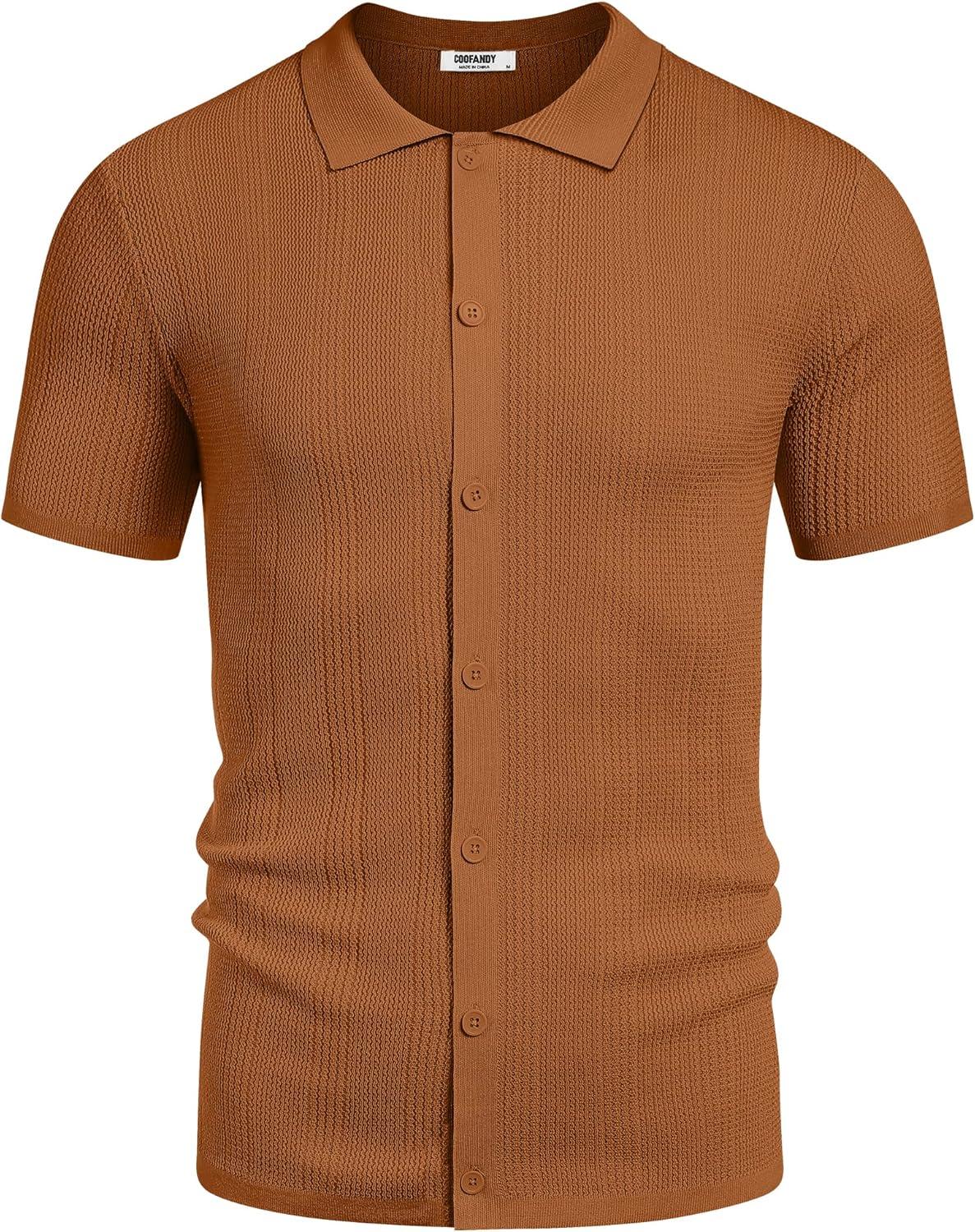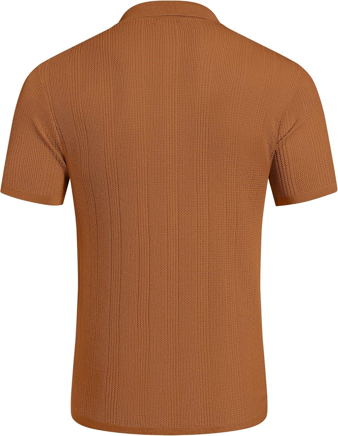 COOFANDY Men’s Short Sleeve Knit Shirts Casual Button Down Polo Shirt Fashion Summer Beach Tops(Brown)