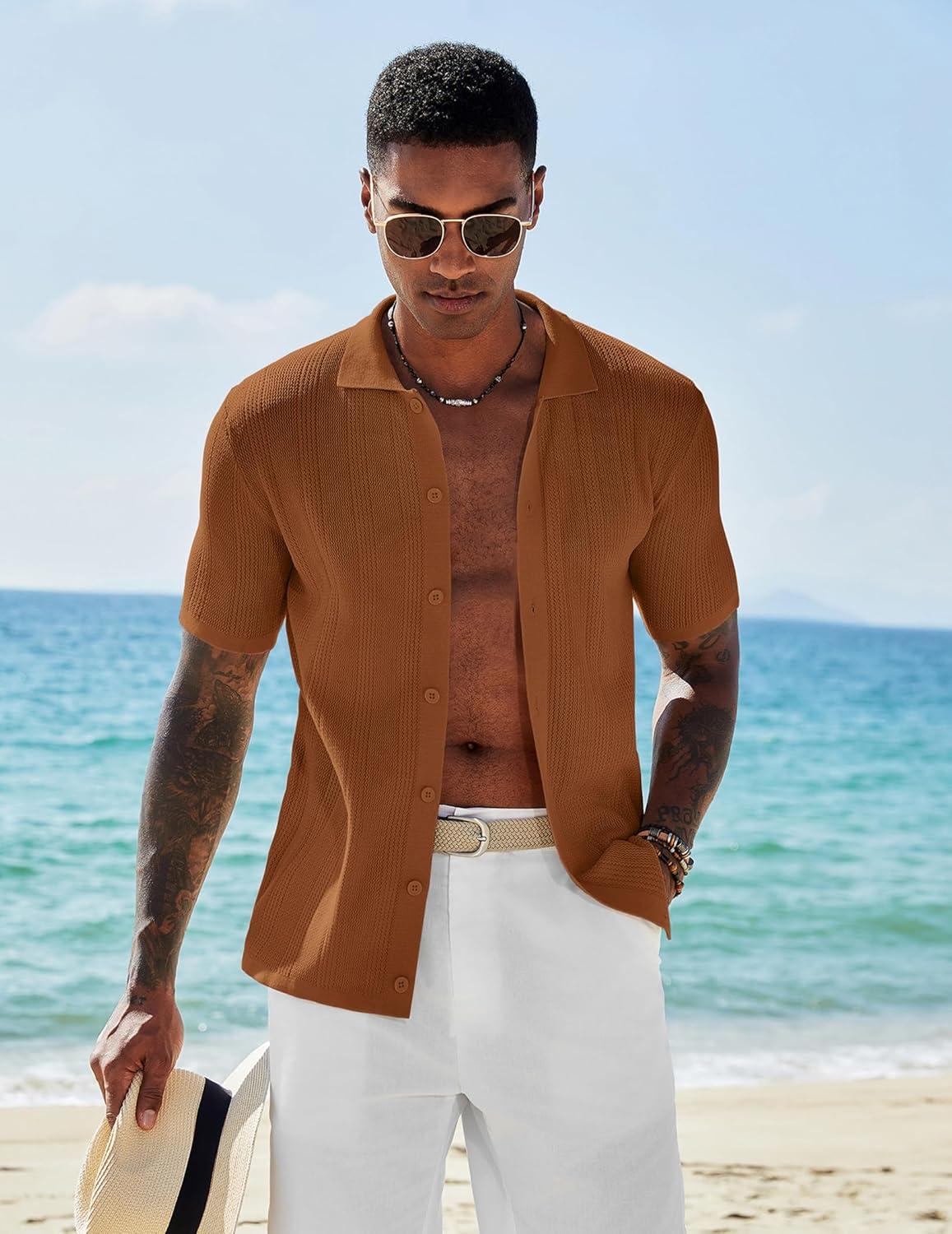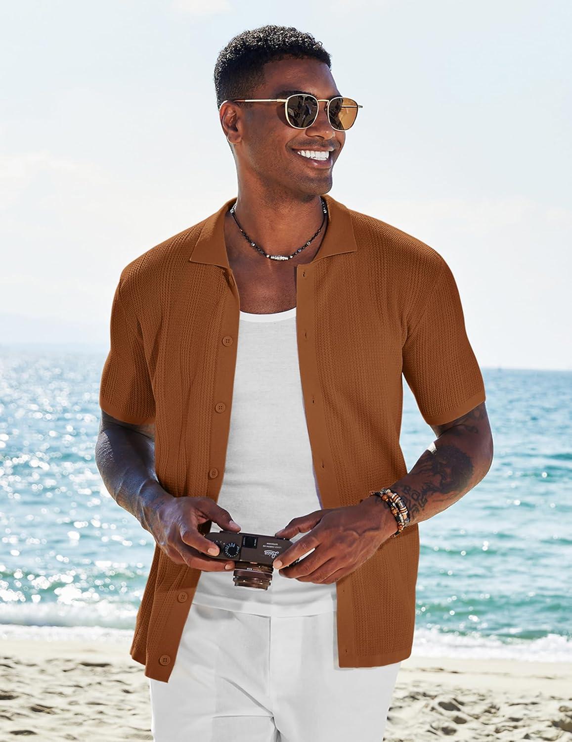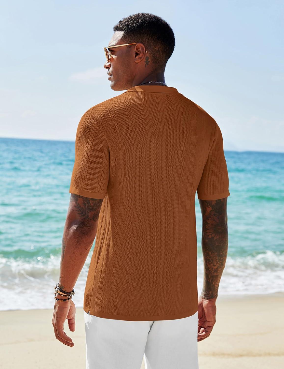 COOFANDY Men’s Short Sleeve Knit Shirts Casual Button Down Polo Shirt Fashion Summer Beach Tops(Brown)