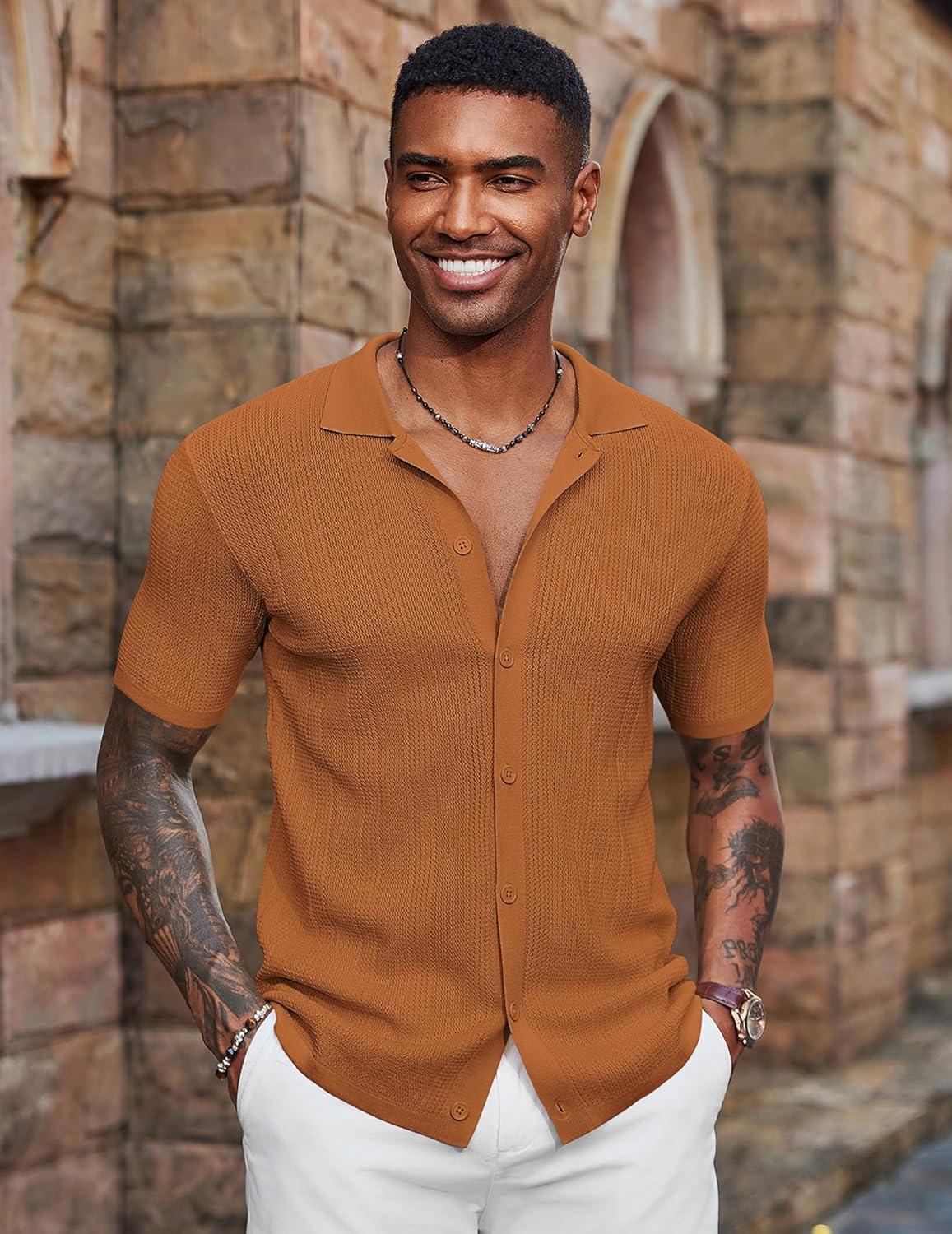 COOFANDY Men's Short Sleeve Knit Shirts Casual Button Down Polo Shirt Fashion Summer Beach Tops(Brown)