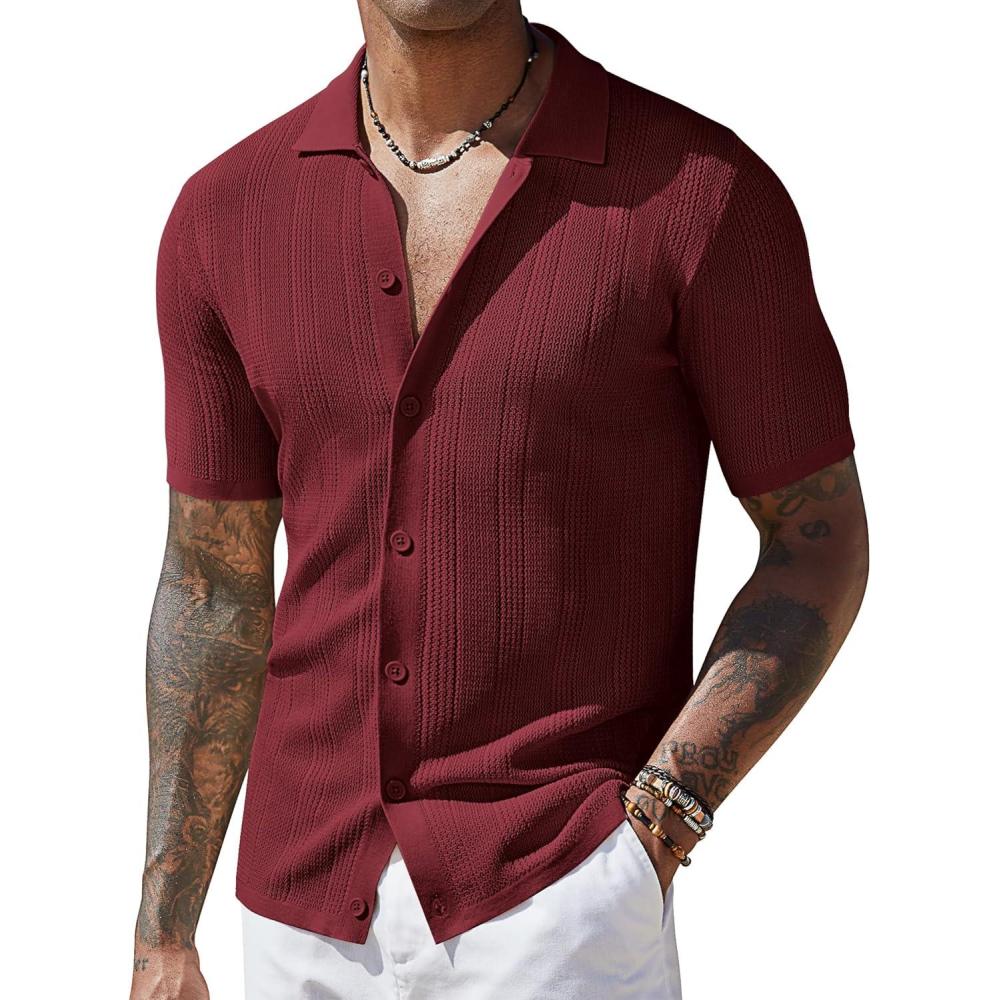 imageCOOFANDY Mens Short Sleeve Knit Shirts Casual Button Down Polo Shirt Fashion Summer Beach TopsWine Red