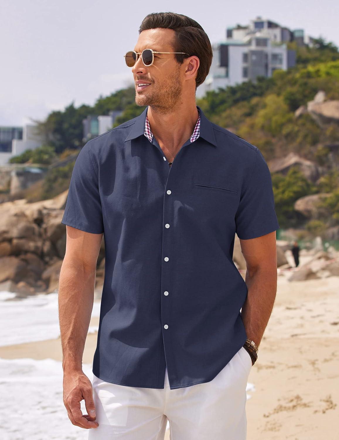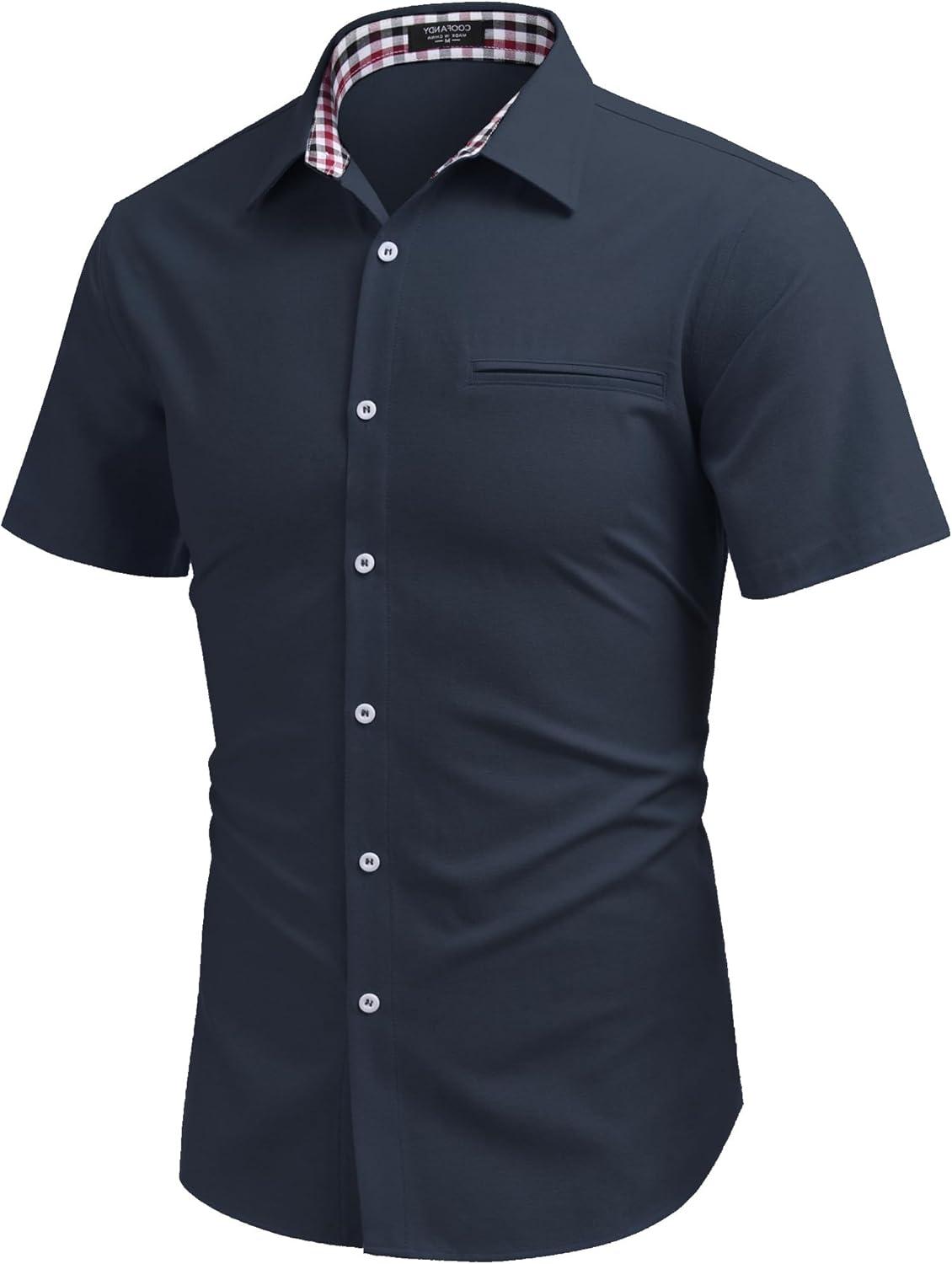 COOFANDY Men’s Short Sleeve Oxford Dress Shirt Chambray Button Down Work Shirt Casual Plaid Collar Shirts(Navy Blue)