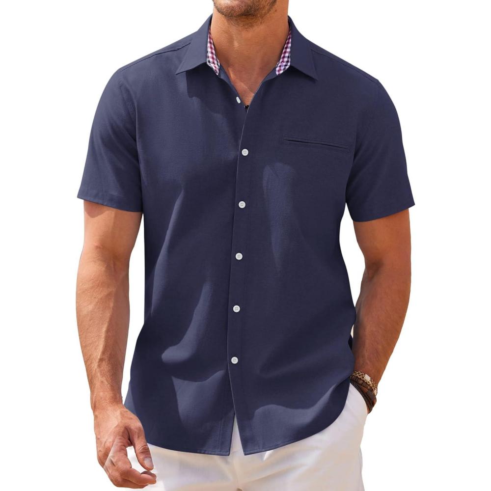 COOFANDY Men's Short Sleeve Oxford Dress Shirt Chambray Button Down Work Shirt Casual Plaid Collar Shirts(Navy Blue)