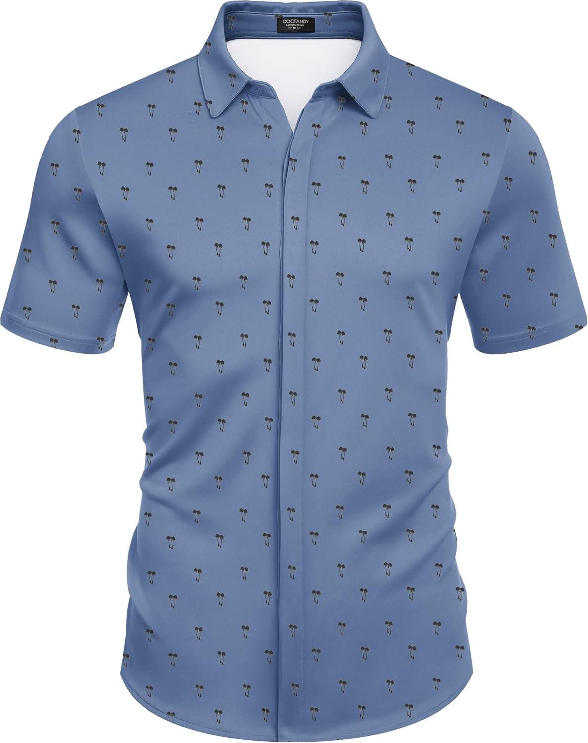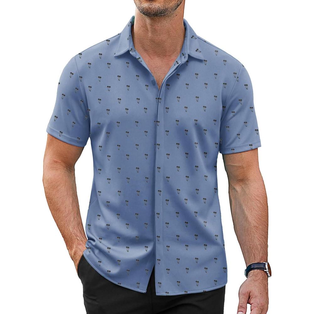 COOFANDY Mens Short Sleeve Wrinkle Free Shirt Casual Button Down Shirt Summer Dress Shirt(Light Blue&palm Tree)