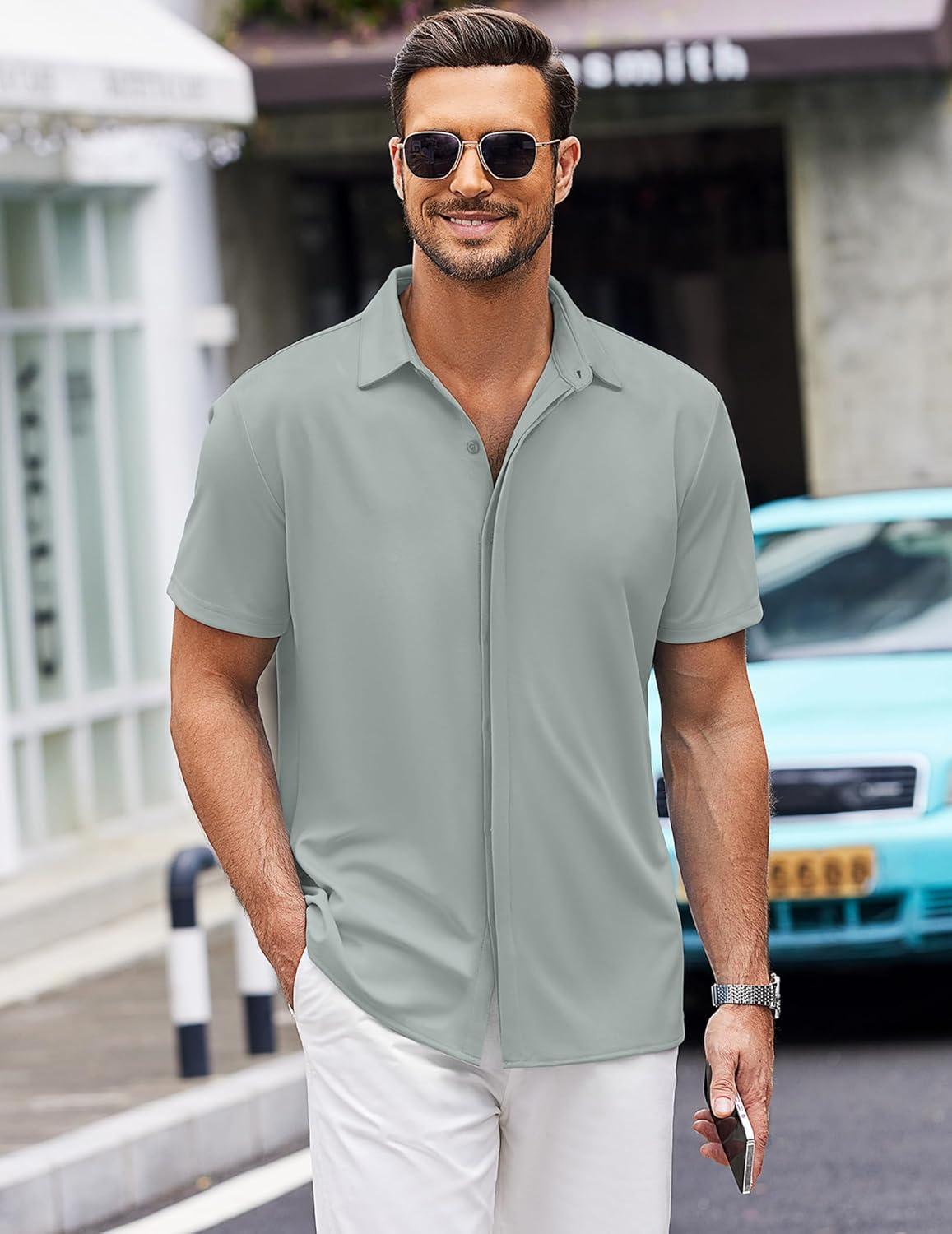 COOFANDY Mens Short Sleeve Wrinkle Free Shirt Casual Button Down Shirt Summer Dress Shirt(Light Grey)