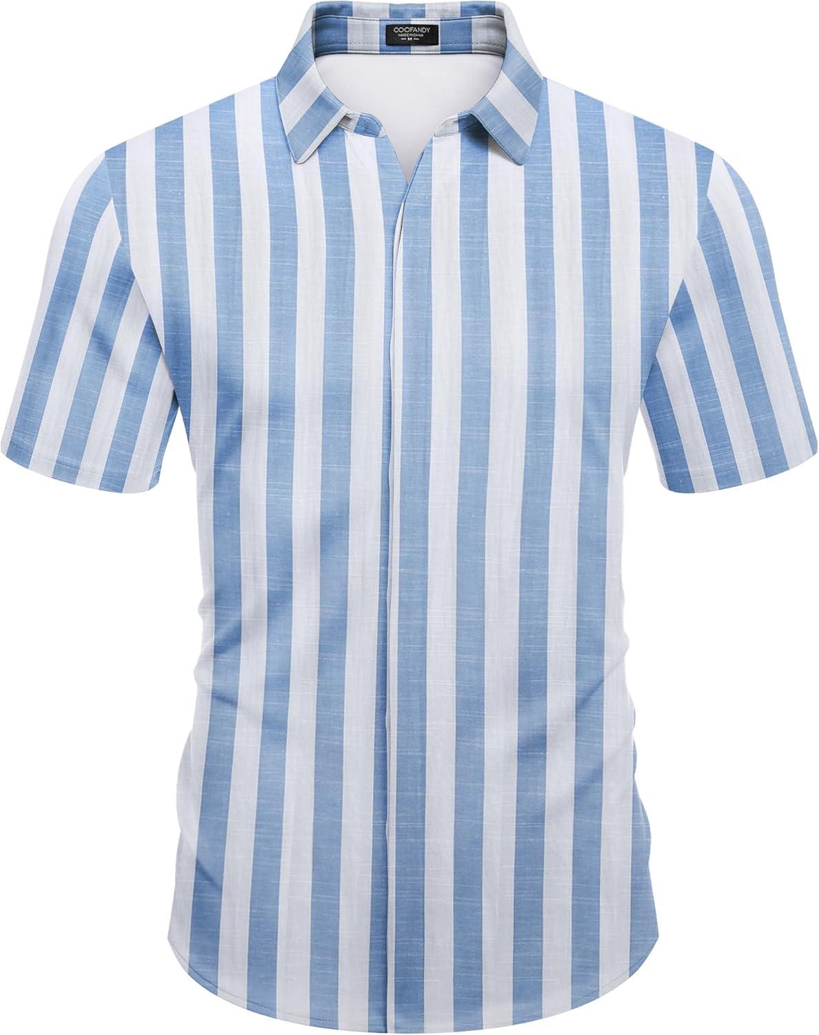 COOFANDY Mens Short Sleeve Wrinkle Free Shirt Casual Button Down Shirt Summer Dress Shirt(Stripe-light Blue&white)