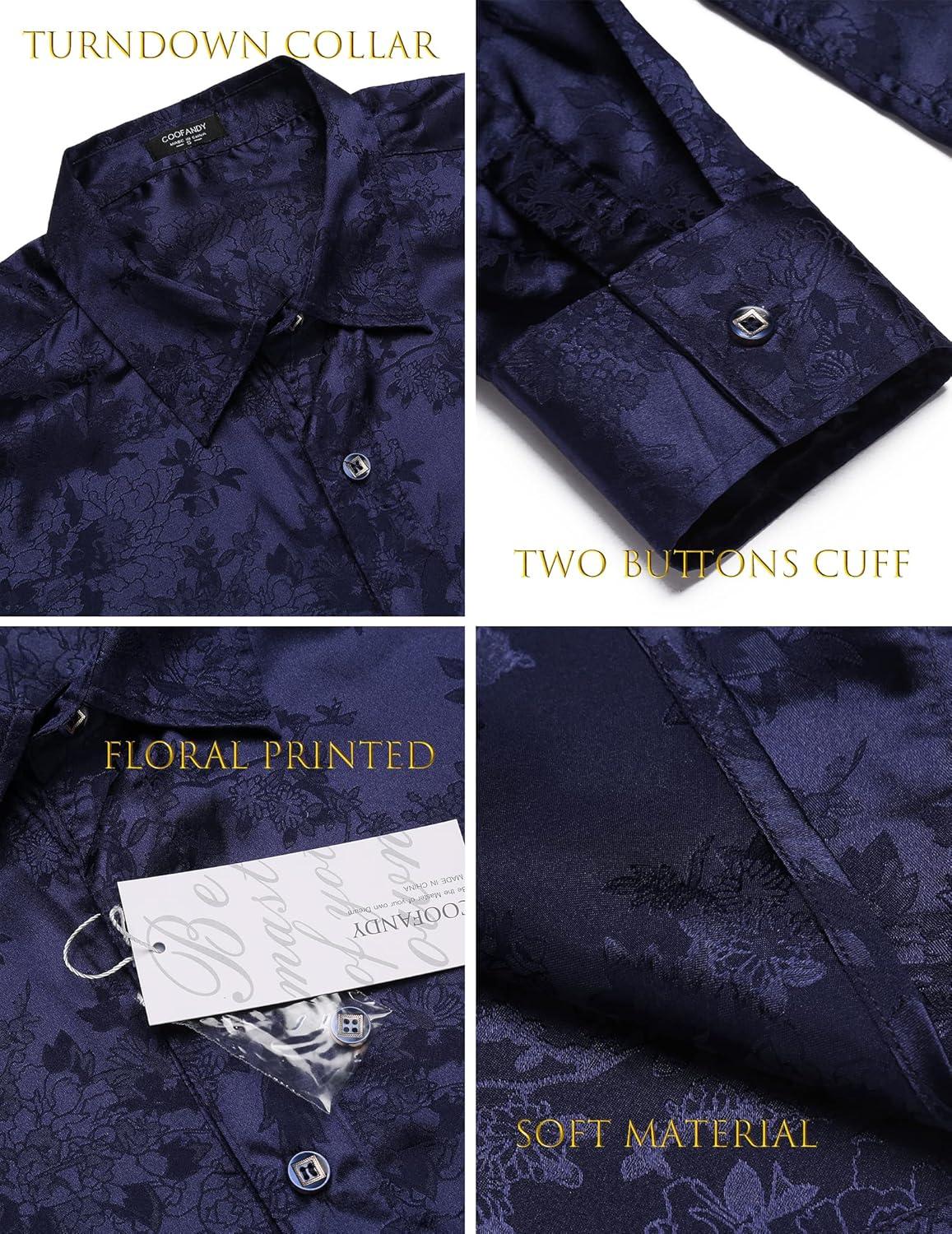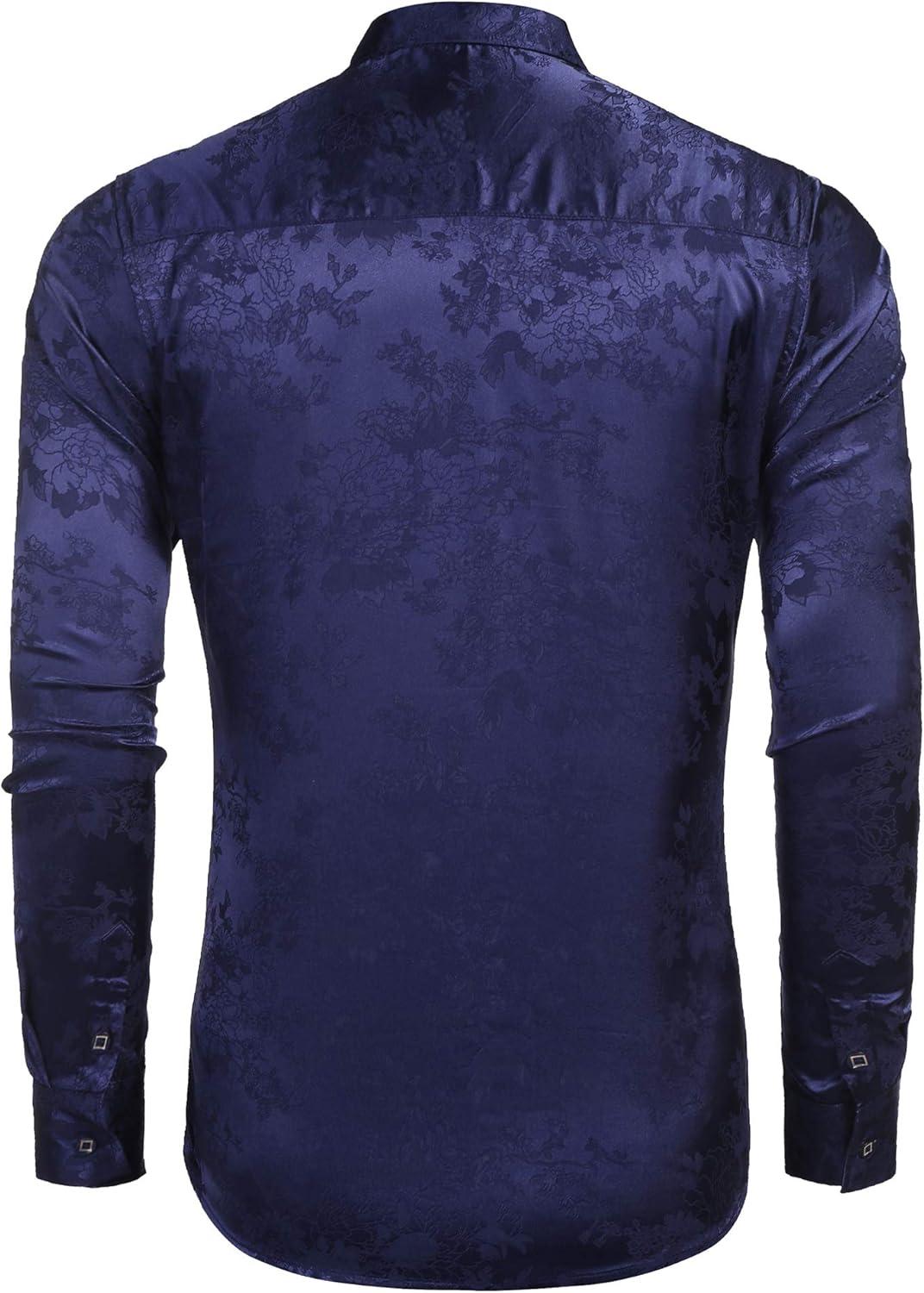 COOFANDY Men's Silk Satin Dress Shirts Jacquard Long Sleeve Floral Button Up Shirts Party Prom Wedding Shirt(Deep Blue)