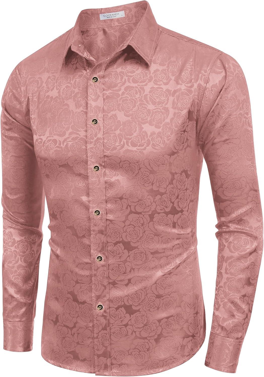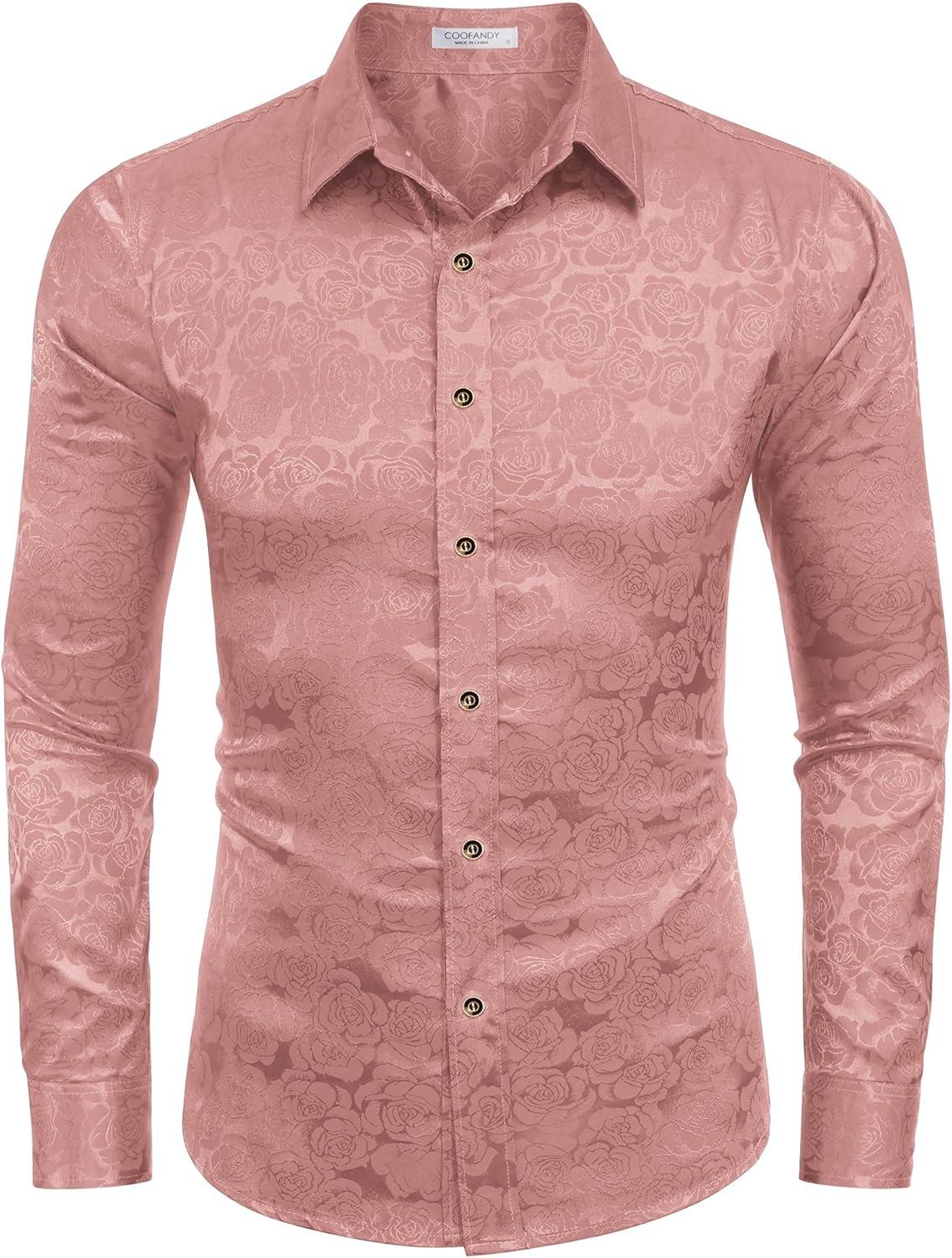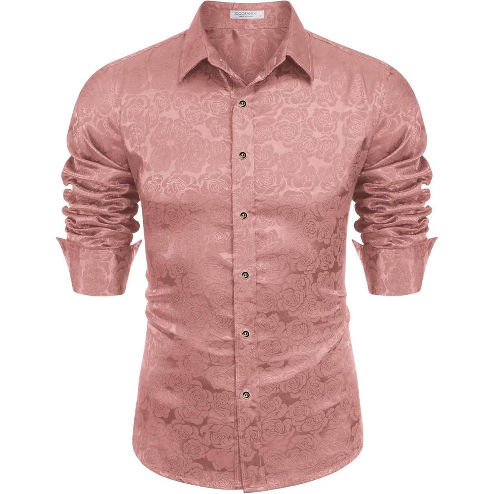COOFANDY Men's Silk Satin Dress Shirts Jacquard Long Sleeve Floral Button Up Shirts Party Prom Wedding Shirt(Dusty Pink)