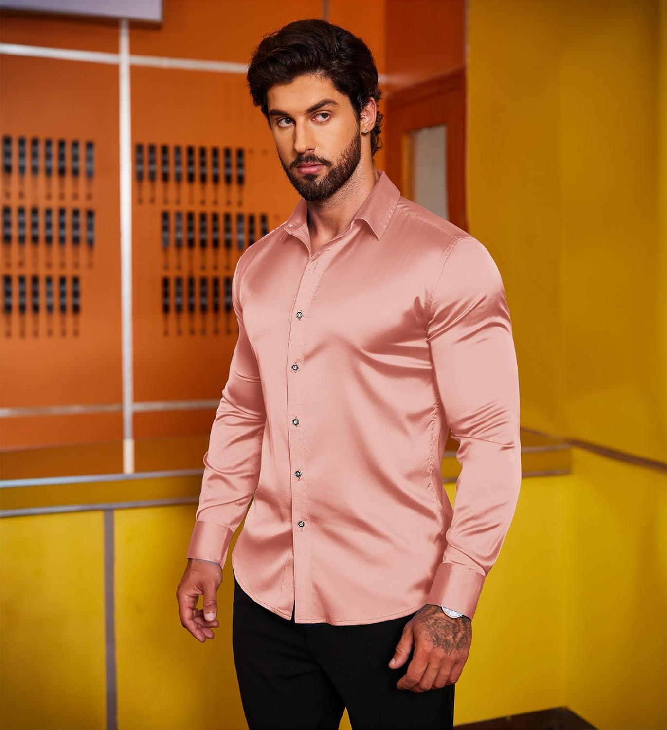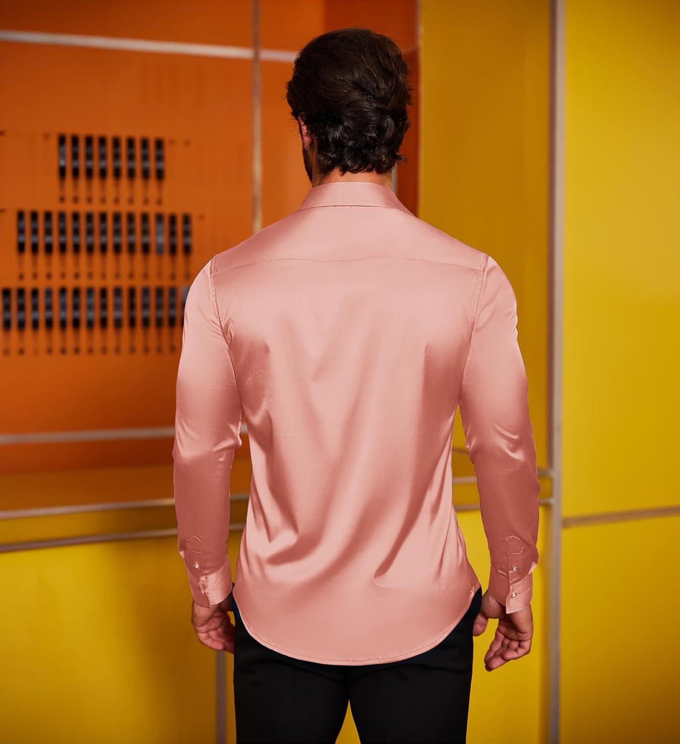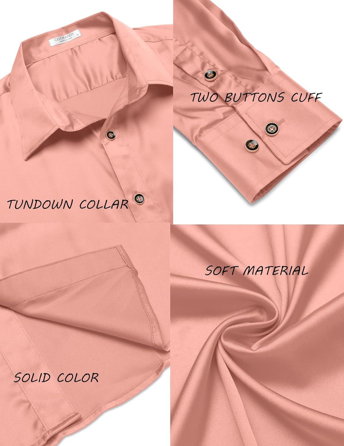 COOFANDY Men's Silk Satin Dress Shirts Jacquard Long Sleeve Floral Button Up Shirts Party Prom Wedding Shirt(Pink)