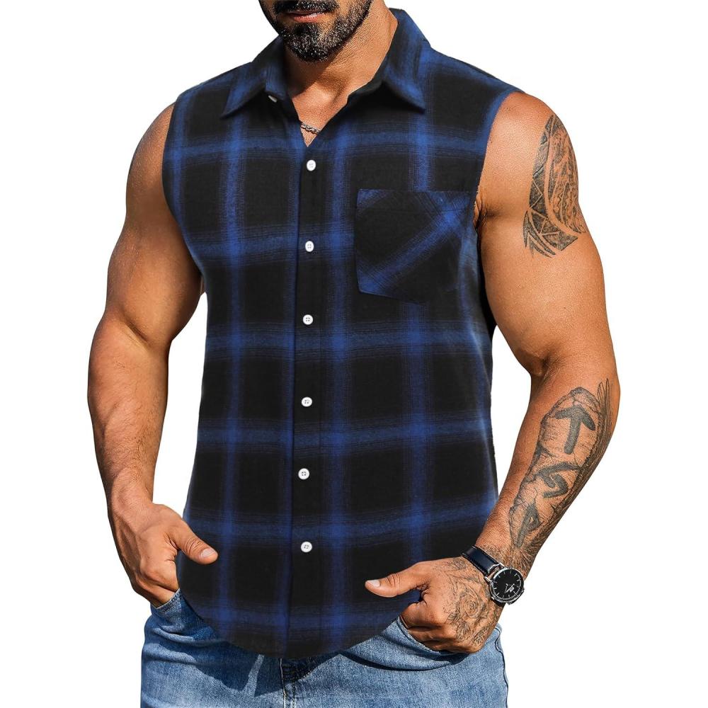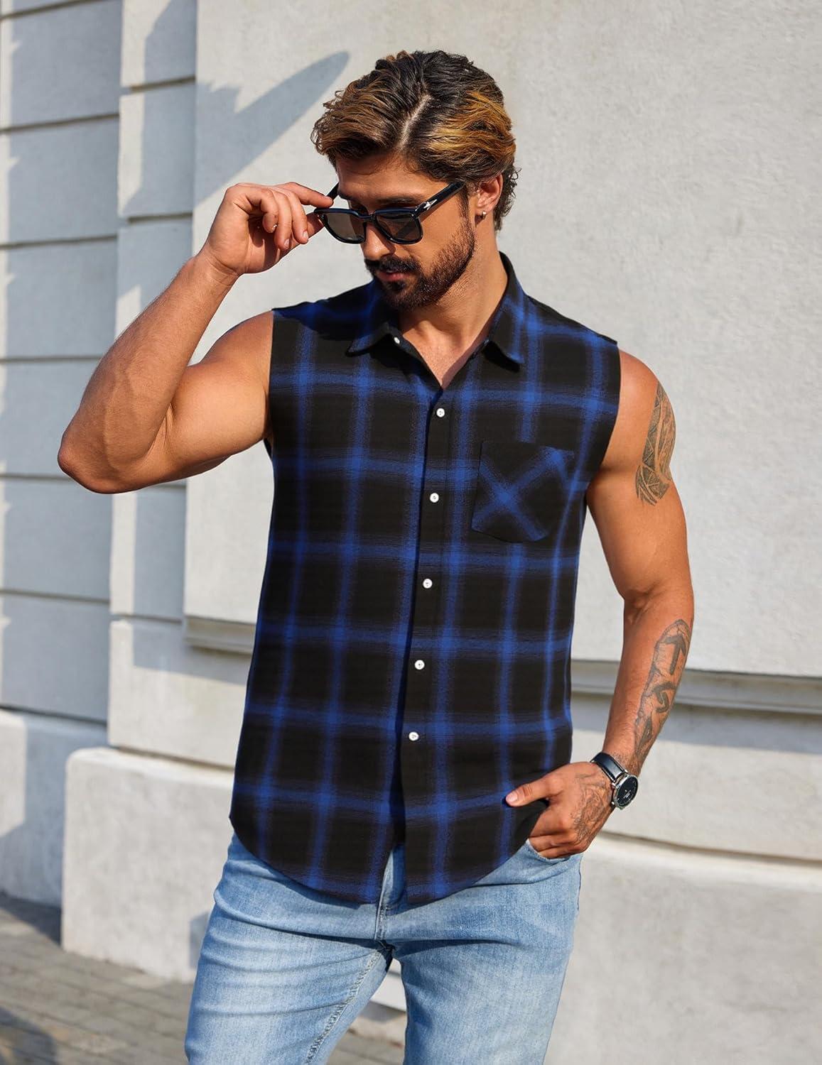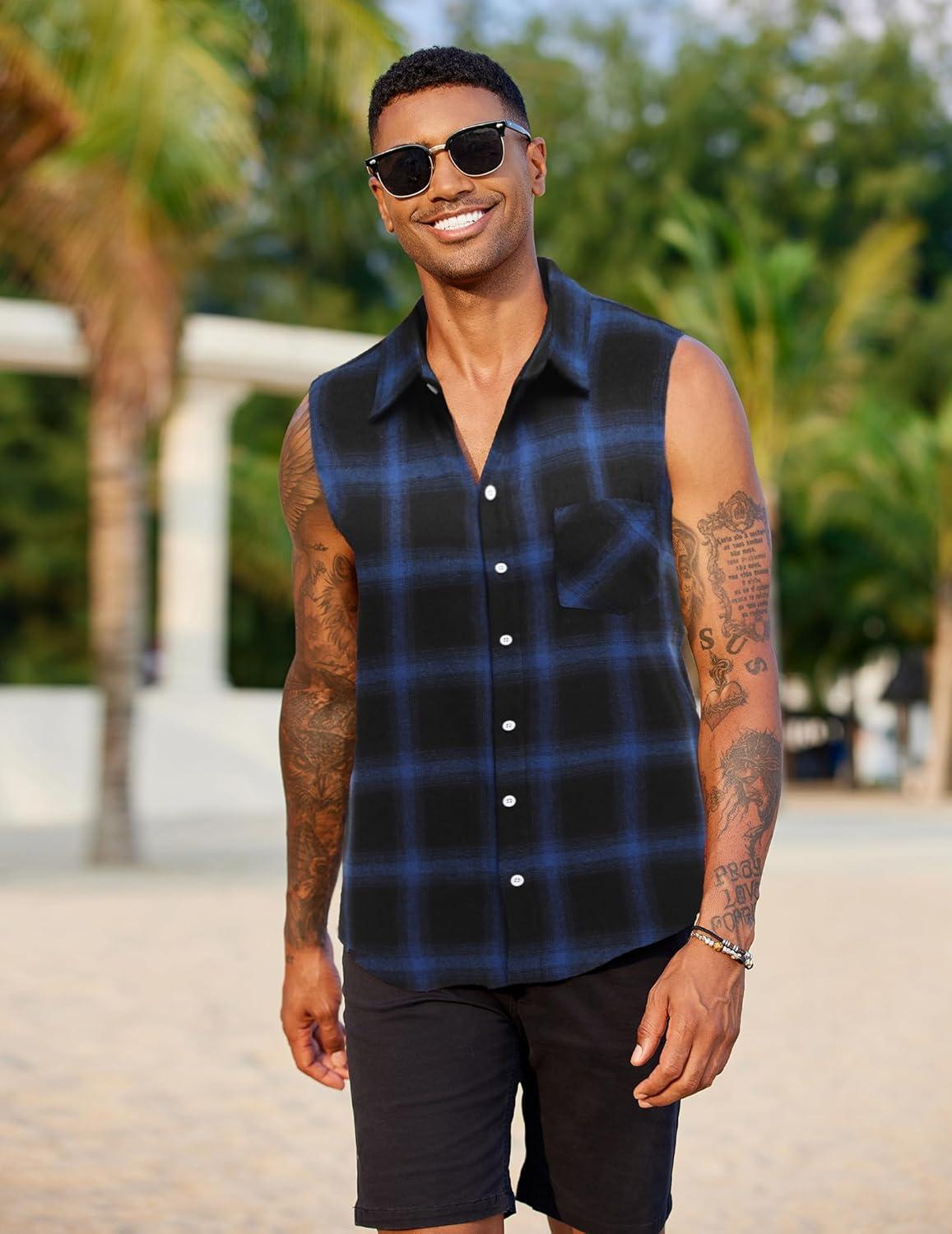 COOFANDY Mens Sleeveless Flannel Shirt Casual Summer Tank Top Button Up Sleeveless Beach Shirts with Chest Pocket(Blue-1)