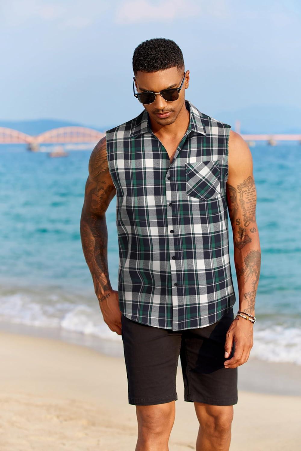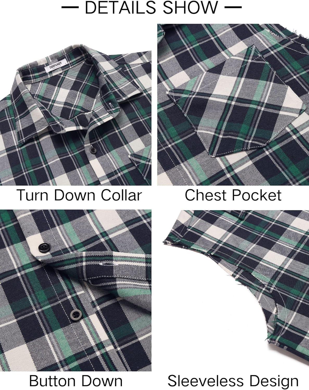COOFANDY Mens Sleeveless Flannel Shirt Casual Summer Tank Top Button Up Sleeveless Beach Shirts with Chest Pocket(Green)