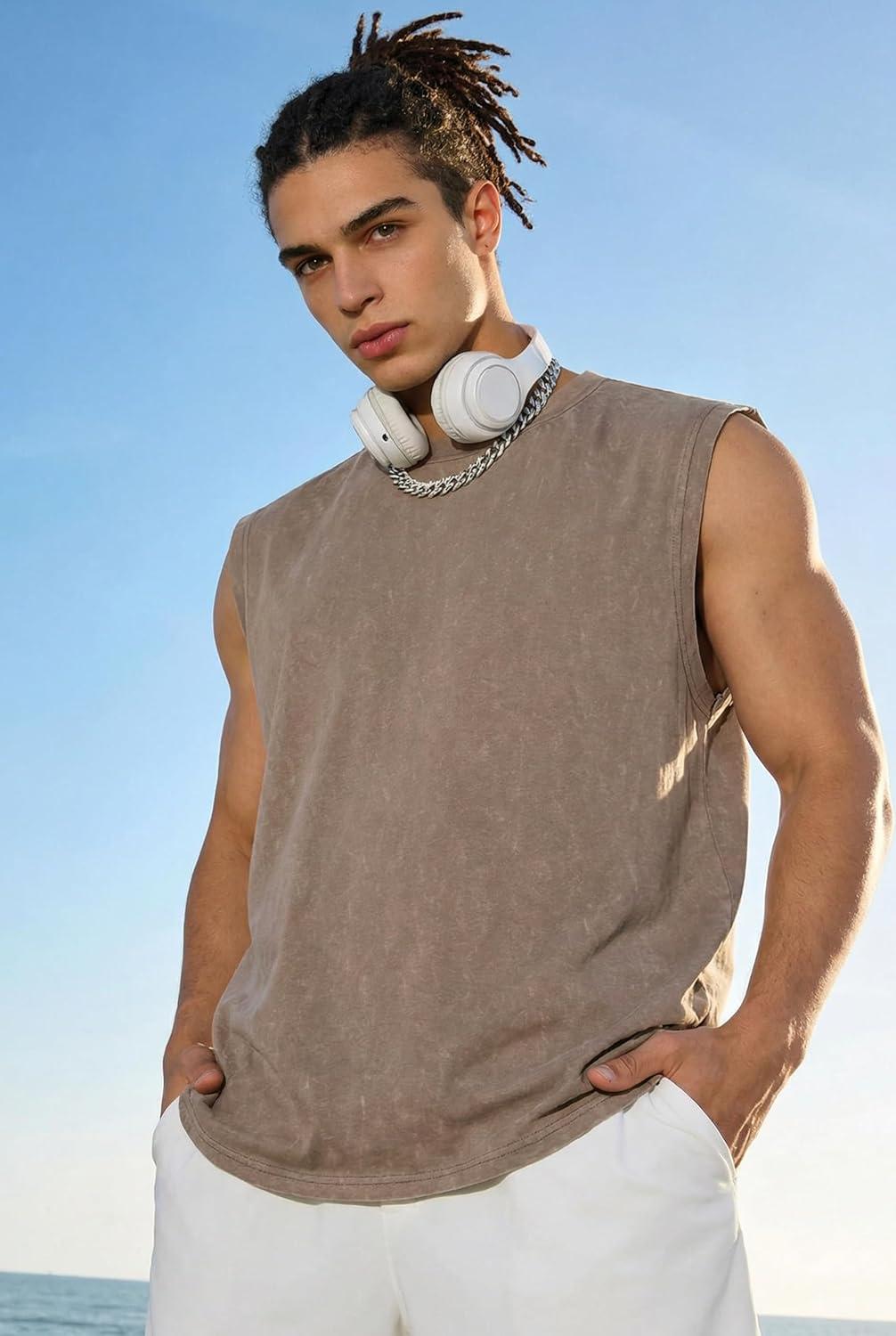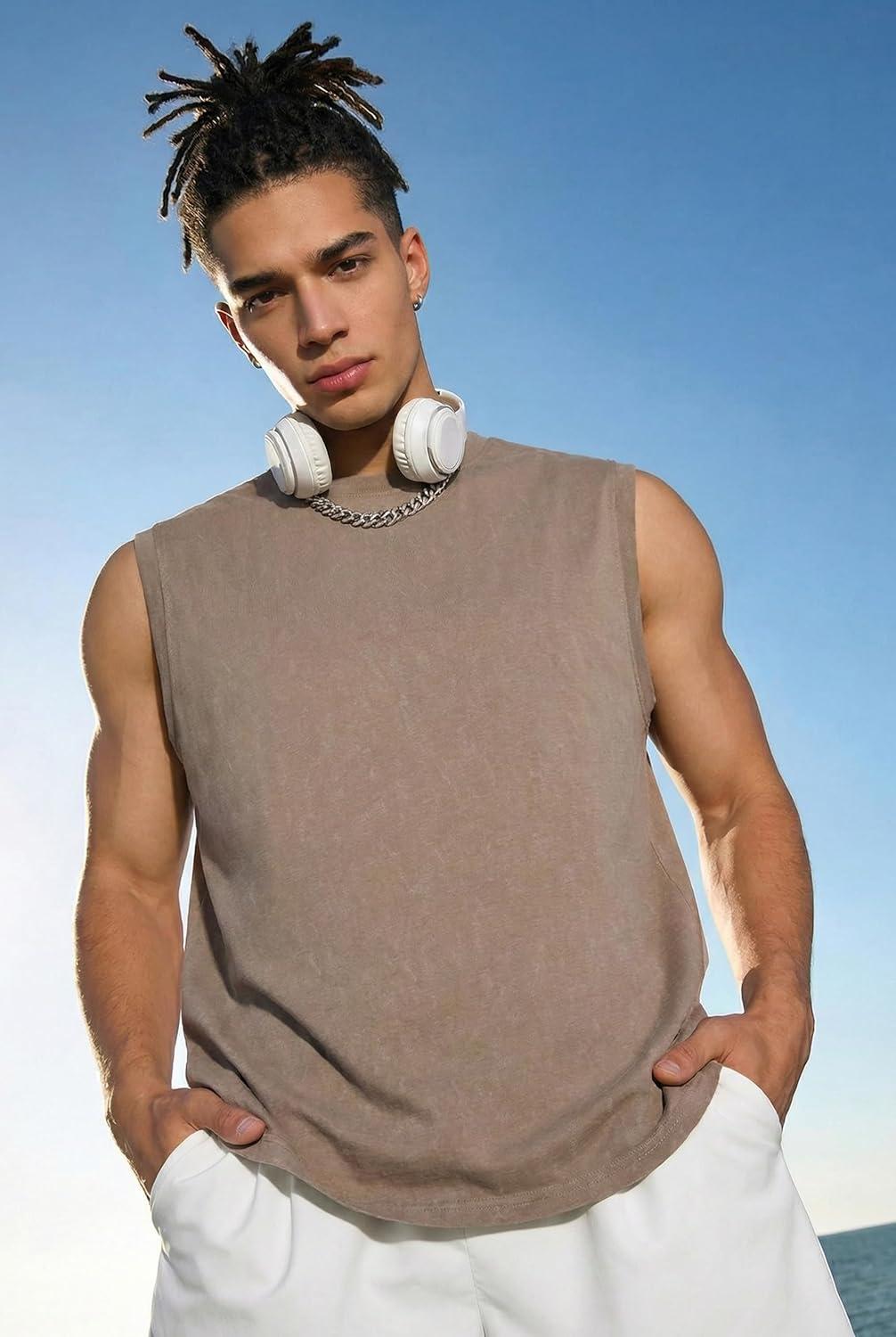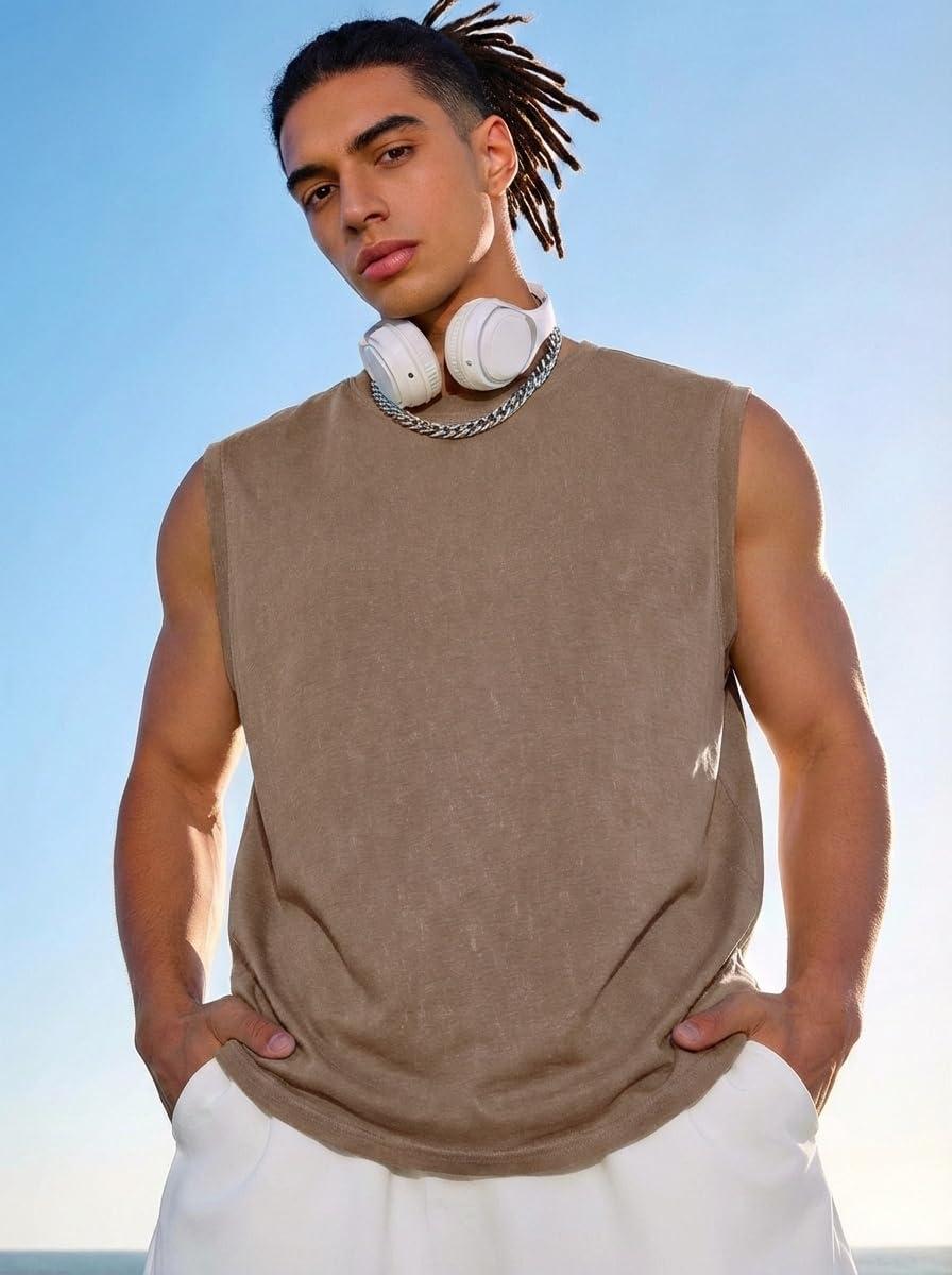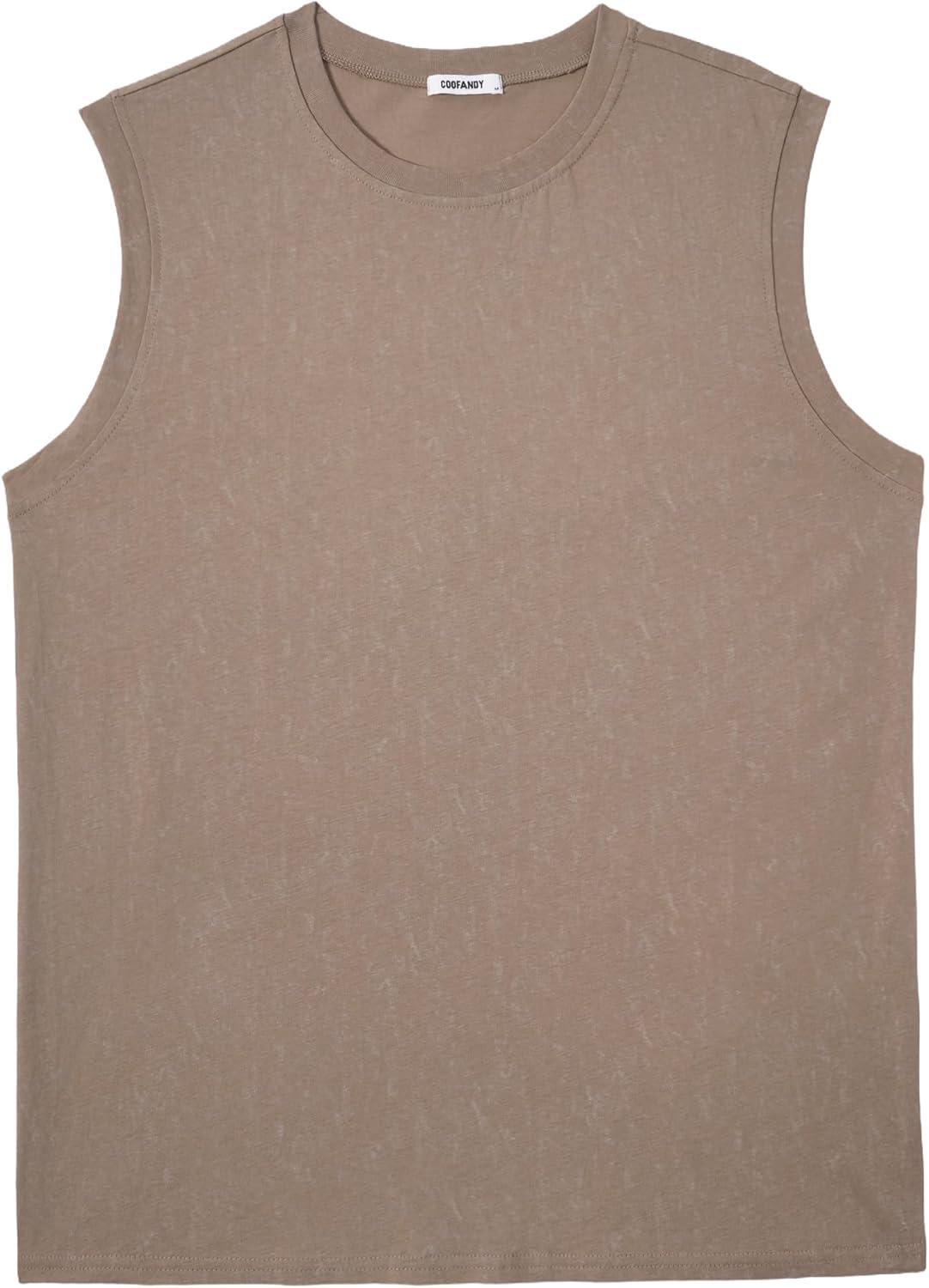 COOFANDY Men's Sleeveless Shirts Cotton Workout Tank Tops Casual Muscle Washed T Shirt Summer Beach Tee Loose Fit(Khaki)