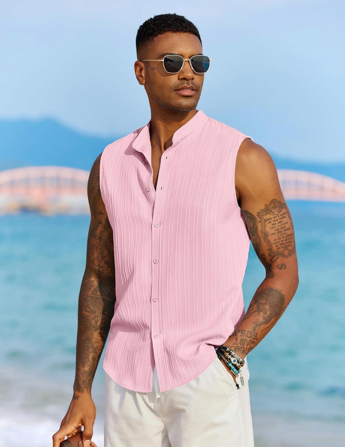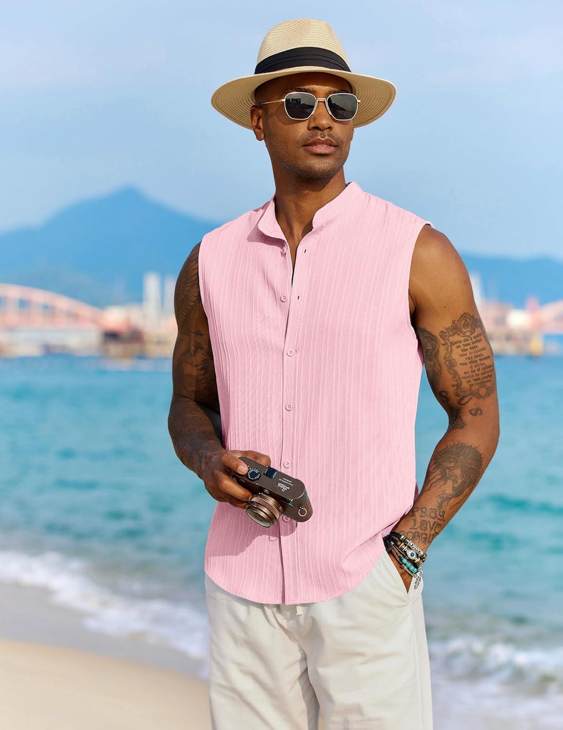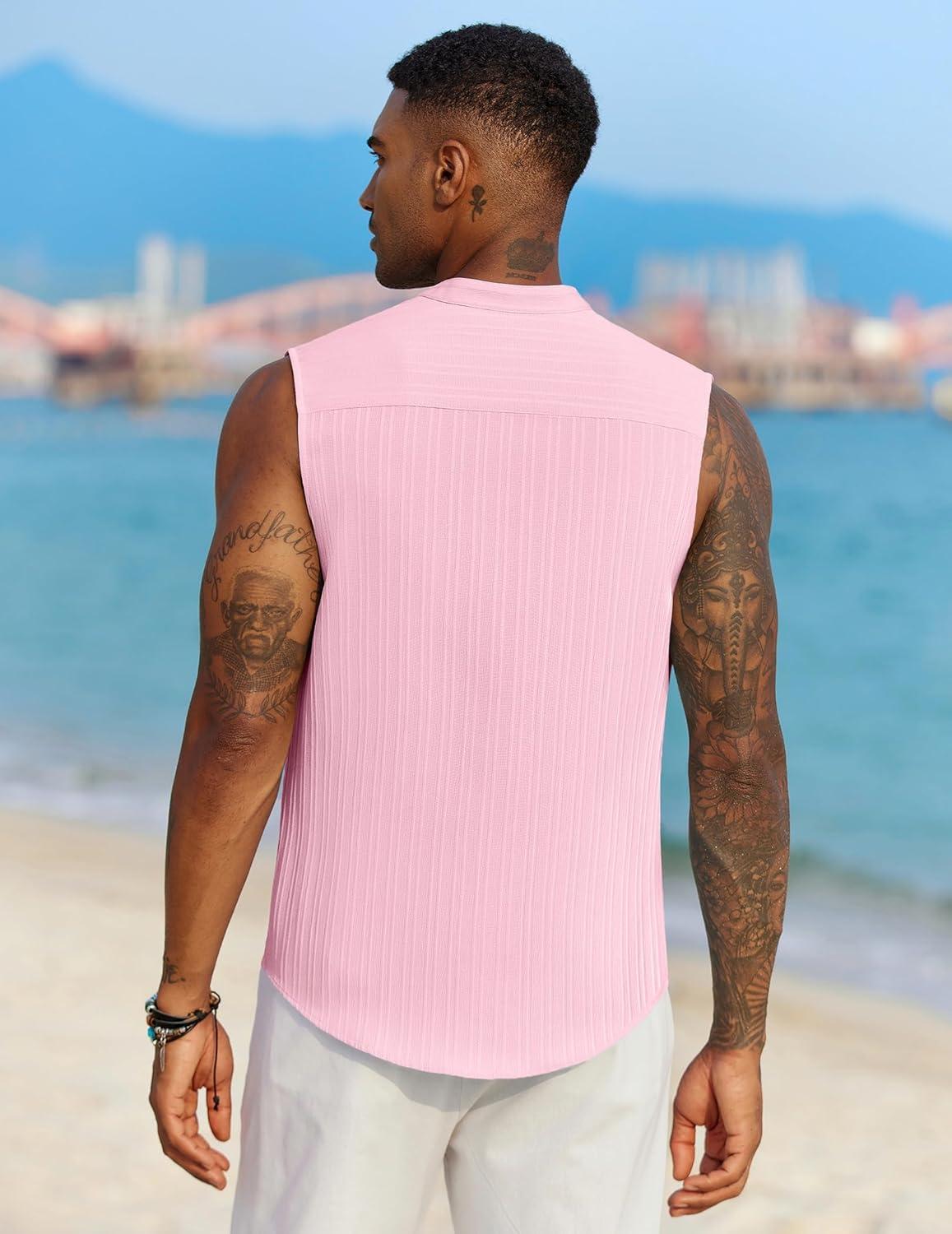 COOFANDY Mens Sleeveless Summer Shirts Beach Tank Tops Button Up Textured Tank Shirt for Vacation(Pink)