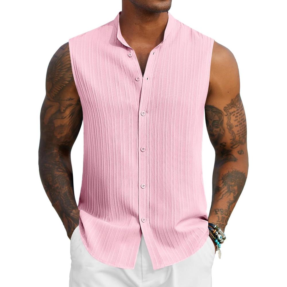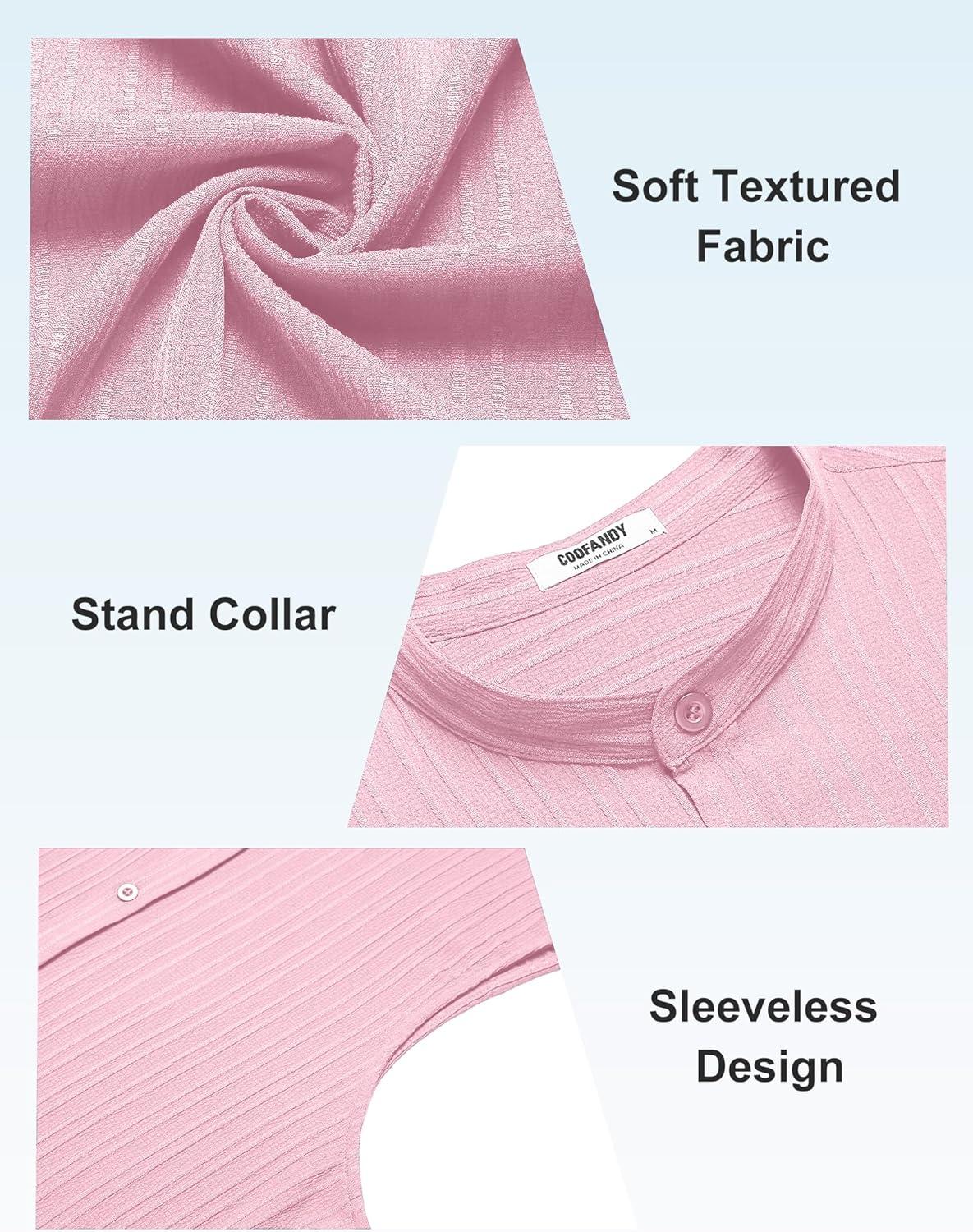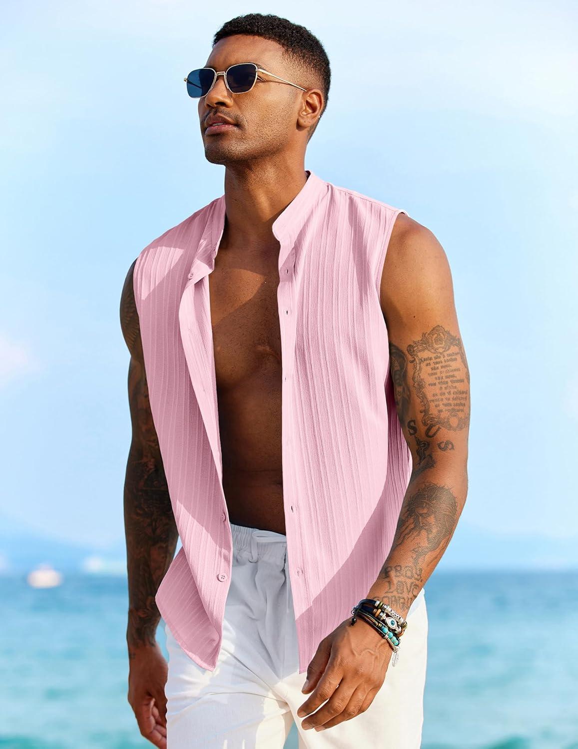 COOFANDY Mens Sleeveless Summer Shirts Beach Tank Tops Button Up Textured Tank Shirt for Vacation(Pink)