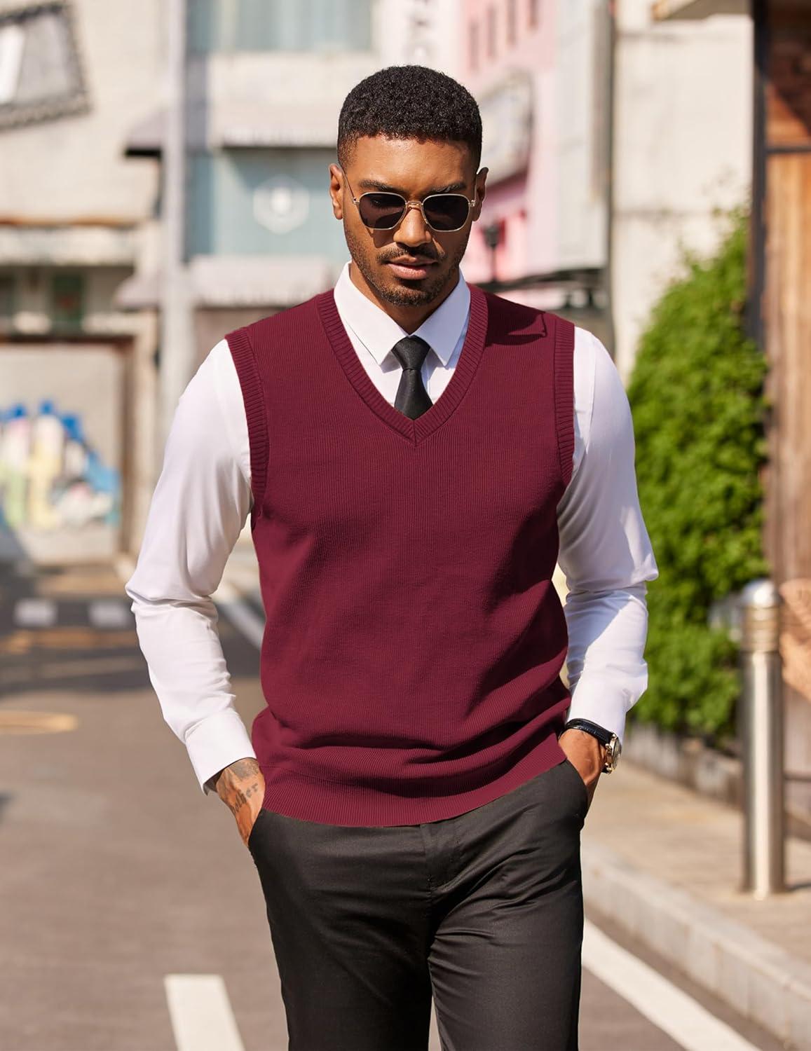 COOFANDY Men’s Sleeveless Sweater Vest Lightweight V-Neck Cotton Vest Pullover(1 Dark Red)