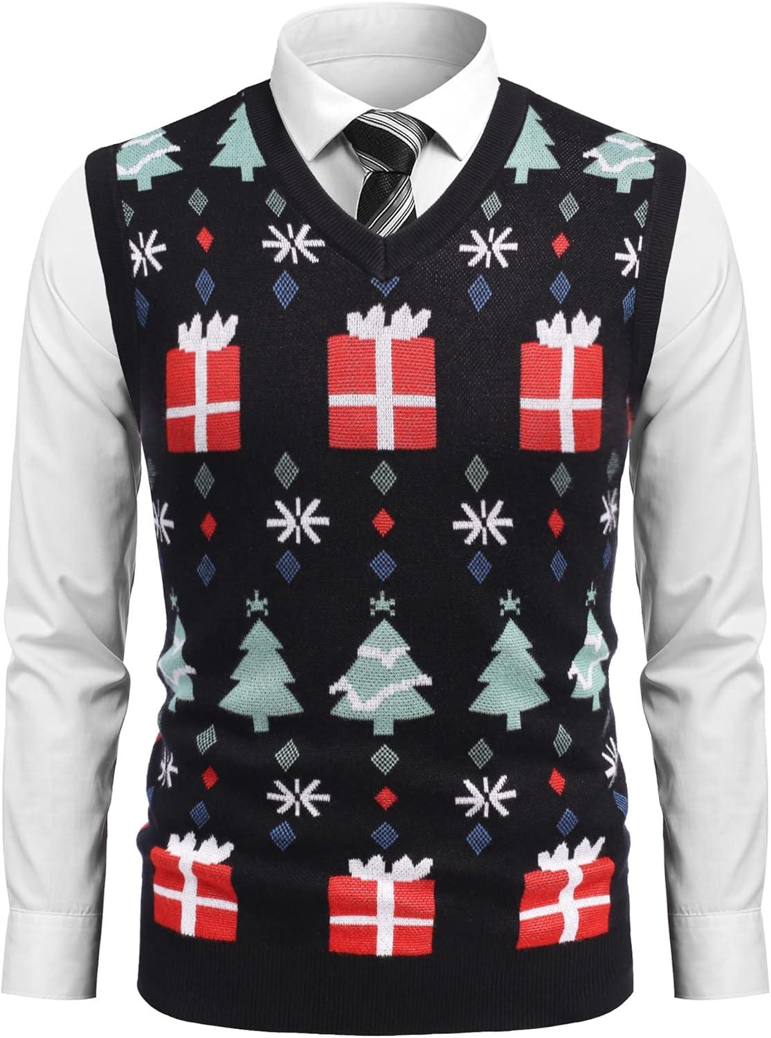 COOFANDY Men’s Sleeveless Sweater Vest Lightweight V-Neck Cotton Vest Pullover(Colorful Christmas Tree)