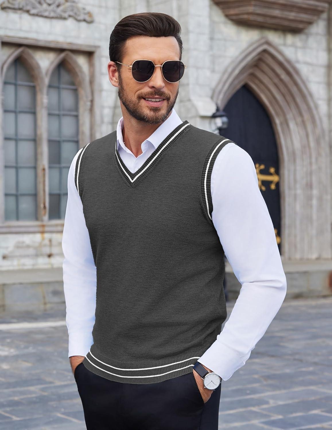 COOFANDY Men’s Sleeveless Sweater Vest Lightweight V-Neck Cotton Vest Pullover(Grey and White Stripe)