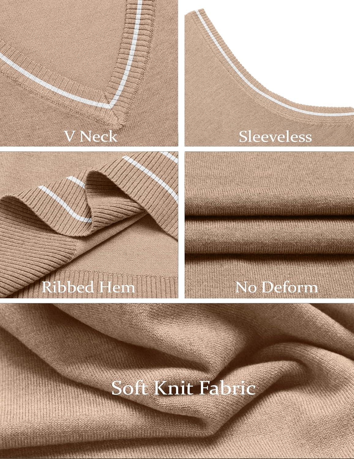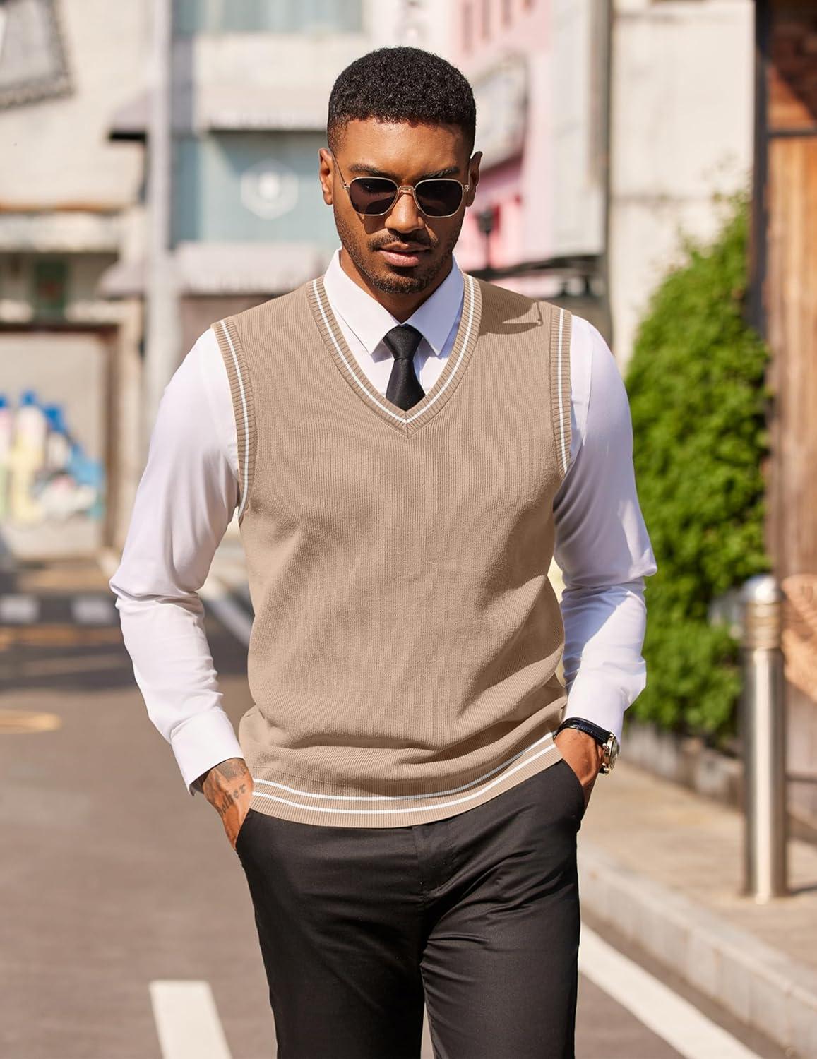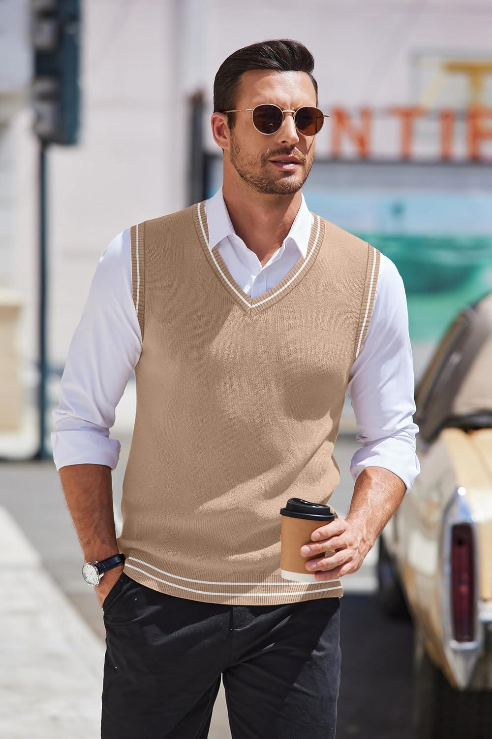 COOFANDY Men’s Sleeveless Sweater Vest Lightweight V-Neck Cotton Vest Pullover(Khaki and White Stripe)