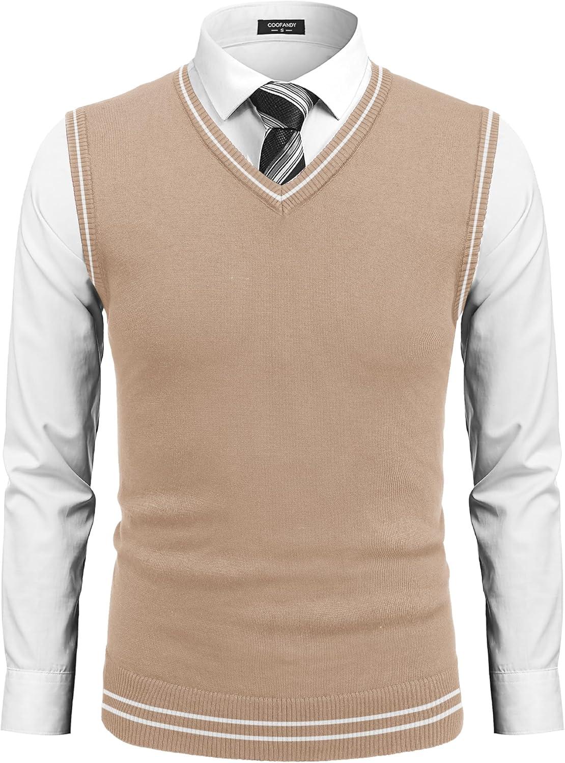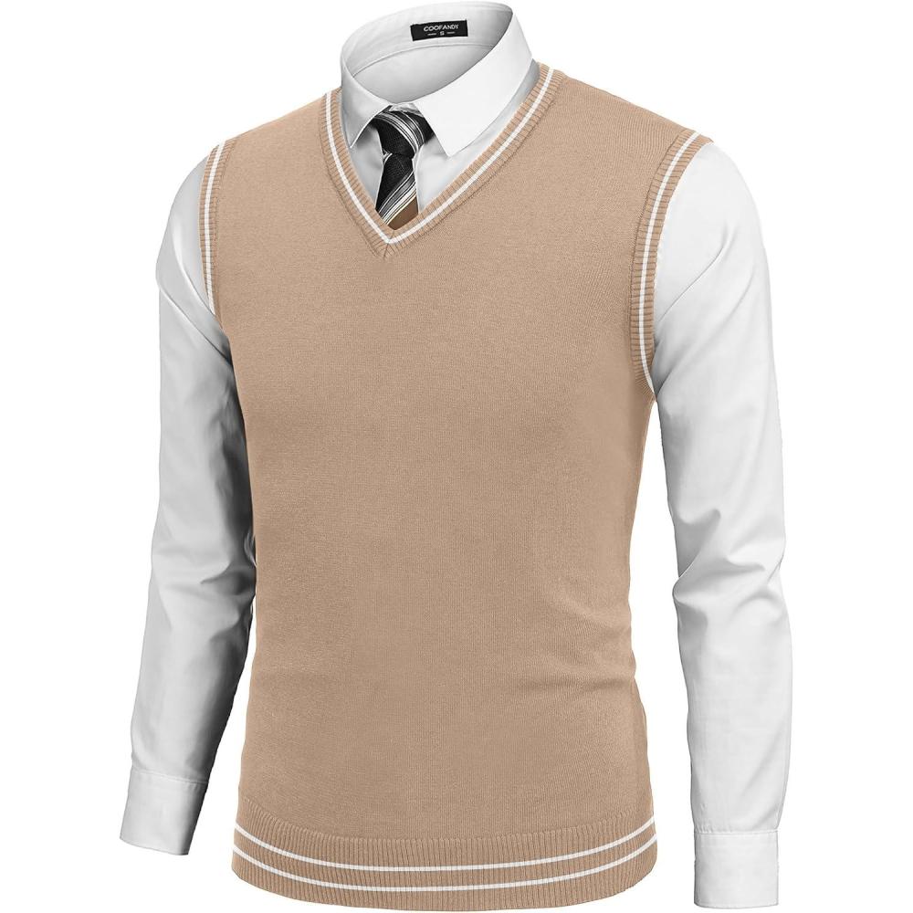 COOFANDY Men's Sleeveless Sweater Vest Lightweight V-Neck Cotton Vest Pullover(Khaki and White Stripe)