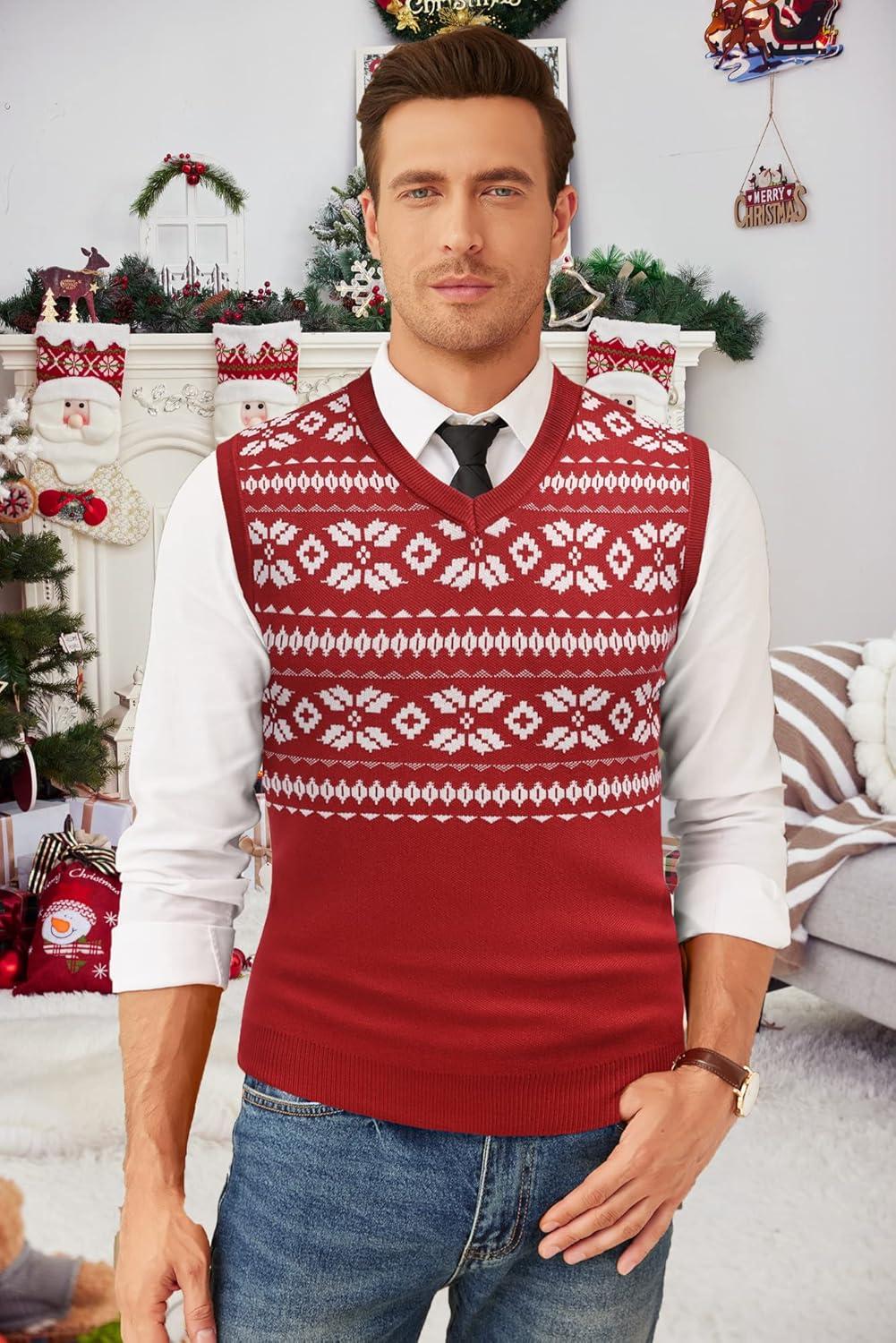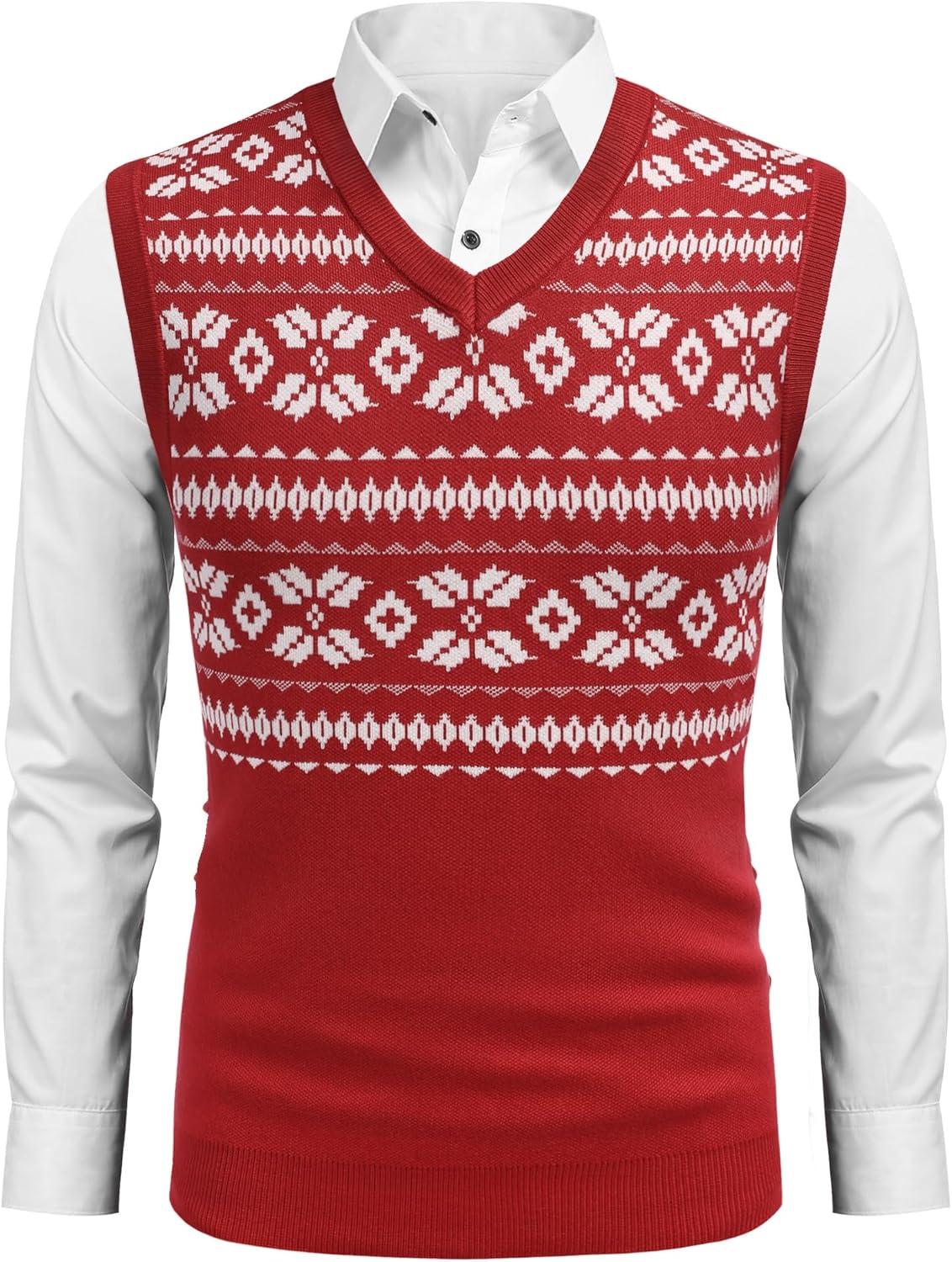 COOFANDY Men’s Sleeveless Sweater Vest Lightweight V-Neck Cotton Vest Pullover(Red and White Snowflakes)