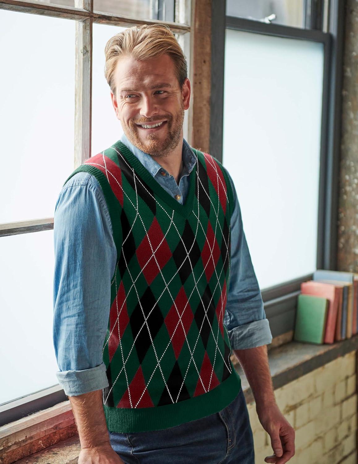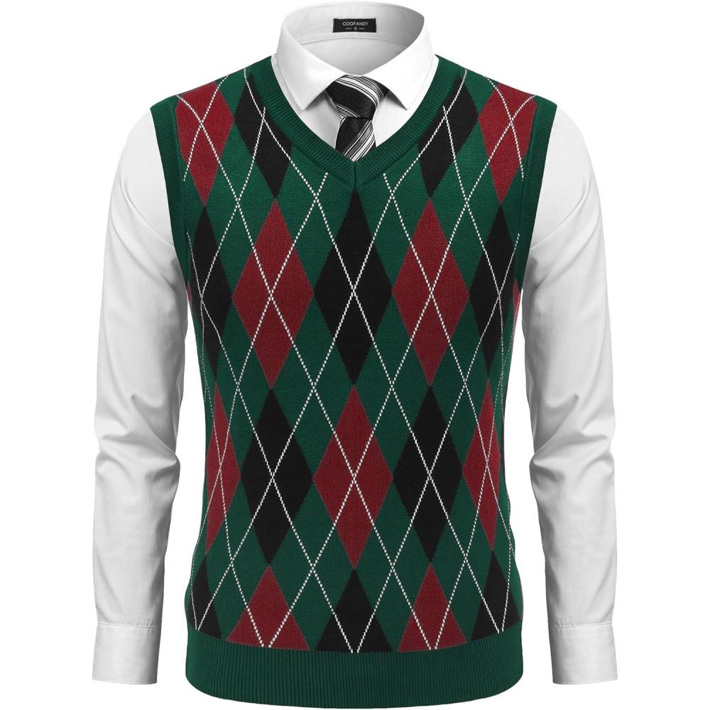 COOFANDY Men’s Sleeveless V Neck Pullover Sweater Slim Fit Casual Argyle Sweater Vest(Gw345 Green and Black Plaid)