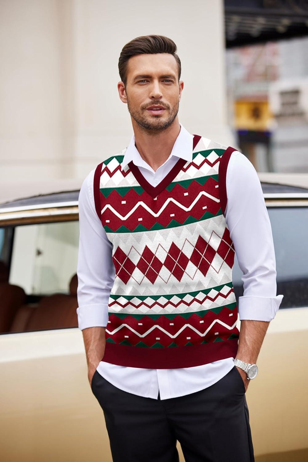 COOFANDY Men’s Sleeveless V Neck Pullover Sweater Slim Fit Casual Argyle Sweater Vest(Gz981 Red and White Plaid)