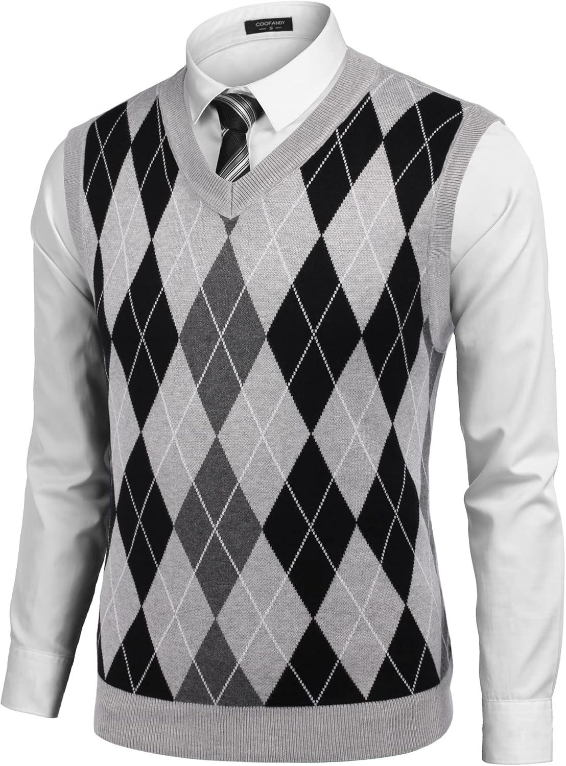 COOFANDY Men's Sleeveless V Neck Pullover Sweater Slim Fit Casual Argyle Sweater Vest(Light Grey)