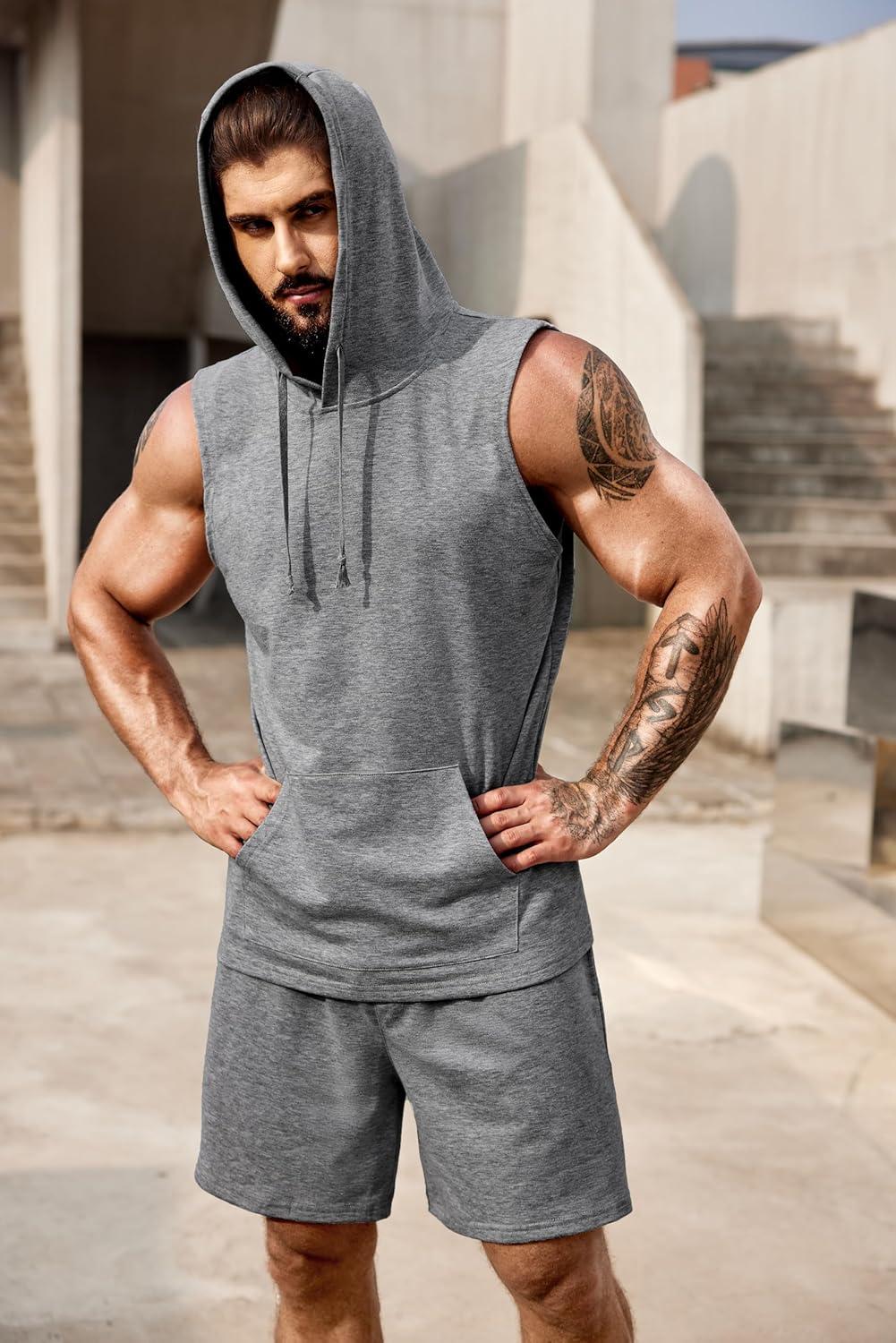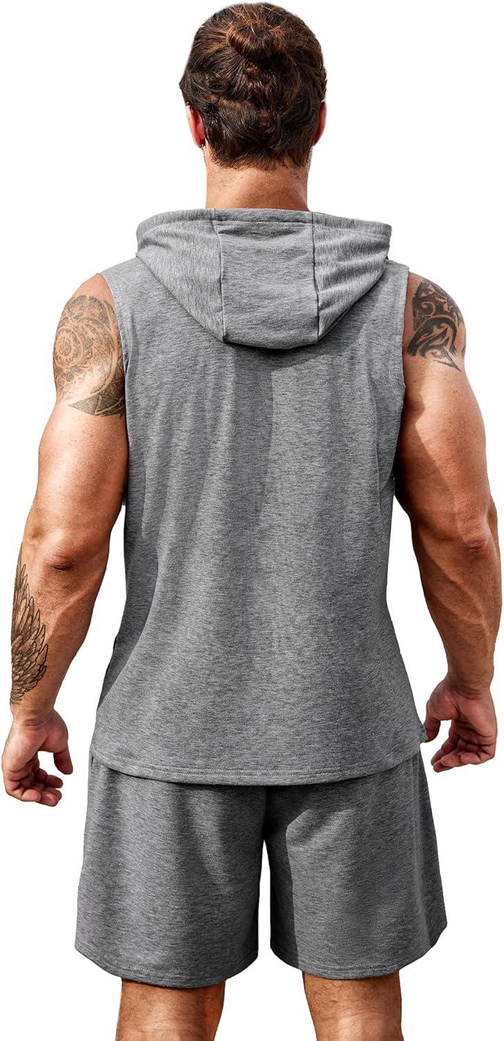 COOFANDY Mens Sleeveless Workout Hoodie Shorts Set 2 Piece Outfits Hooded Tank Tops Gym Tracksuit Sweatsuits(Light Grey)