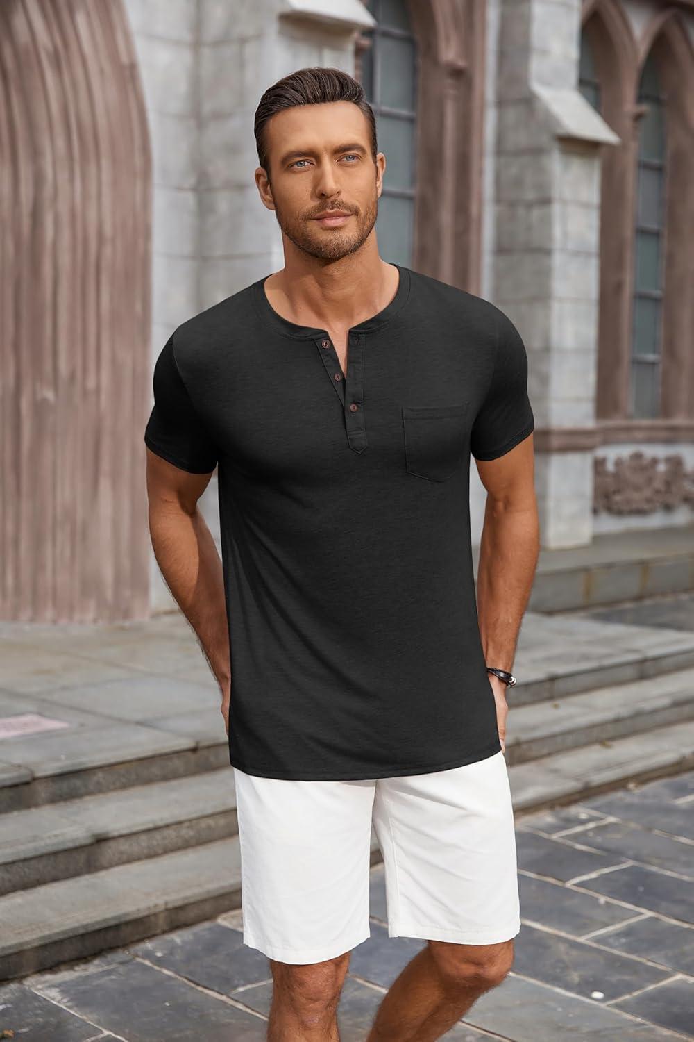 COOFANDY Men’s Soft Henley Short Sleeve T Shirts Casual Basic Shirt with Pocket 3 Button Tees Summer Tops(Black)