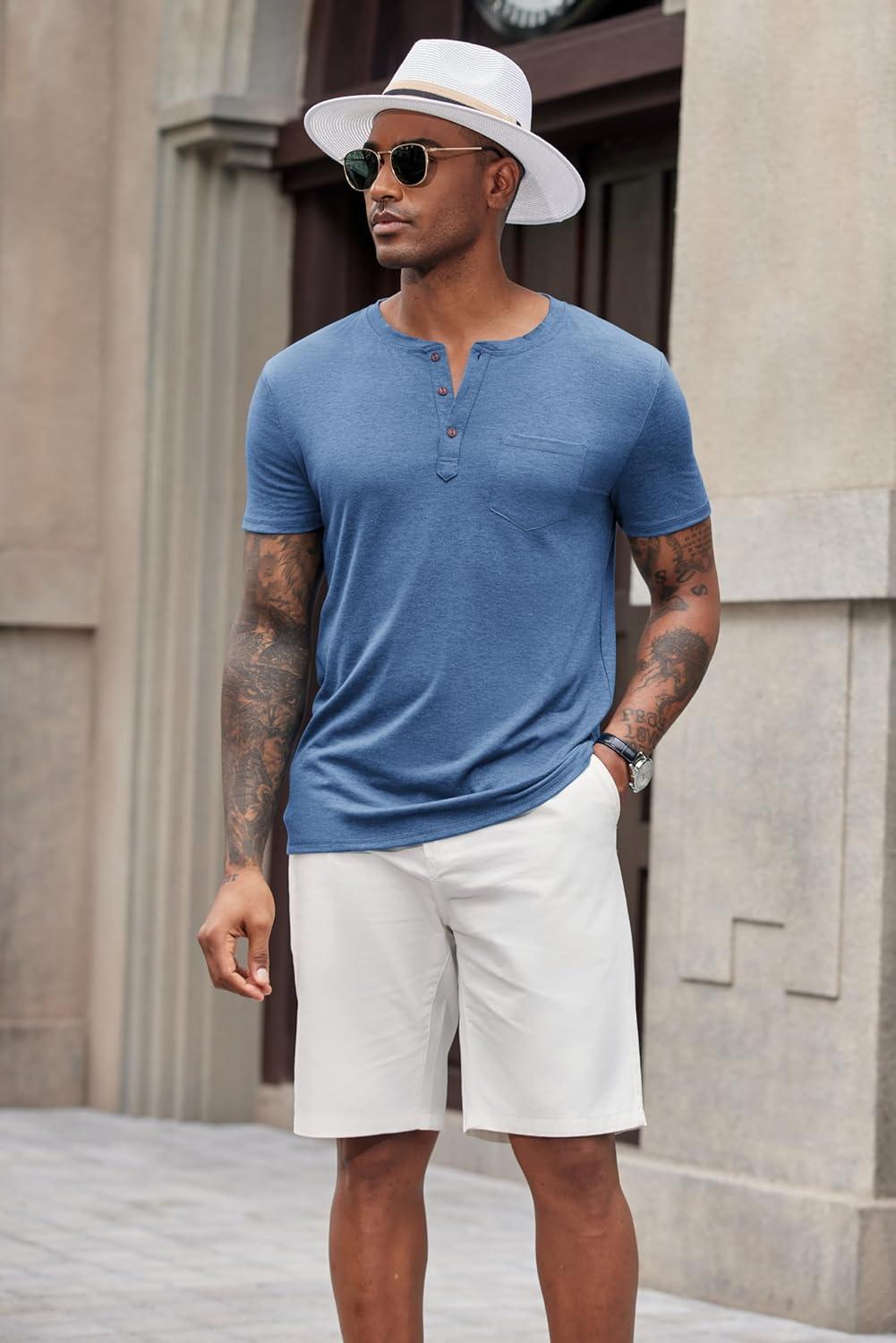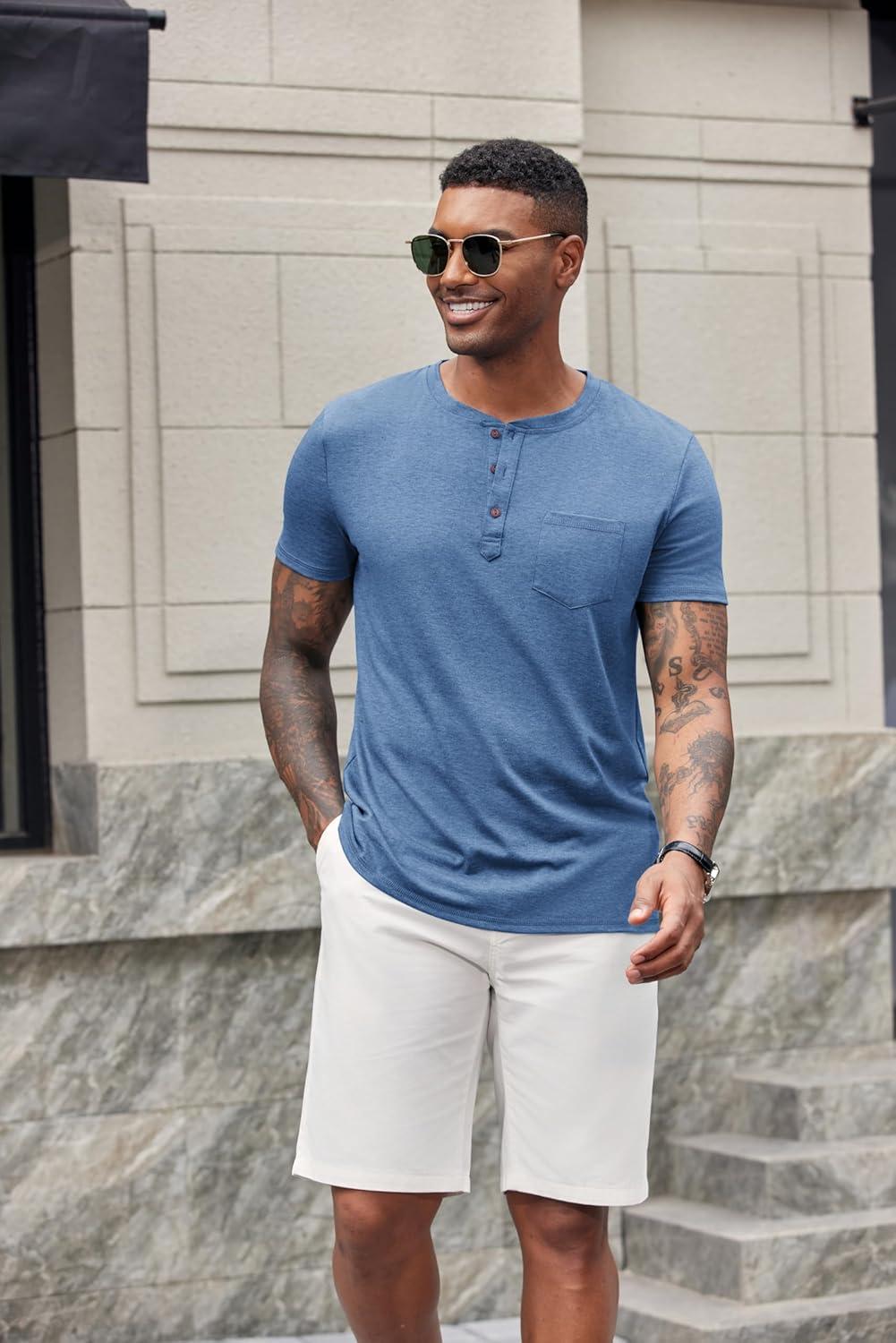 COOFANDY Men’s Soft Henley Short Sleeve T Shirts Casual Basic Shirt with Pocket 3 Button Tees Summer Tops(Blue)